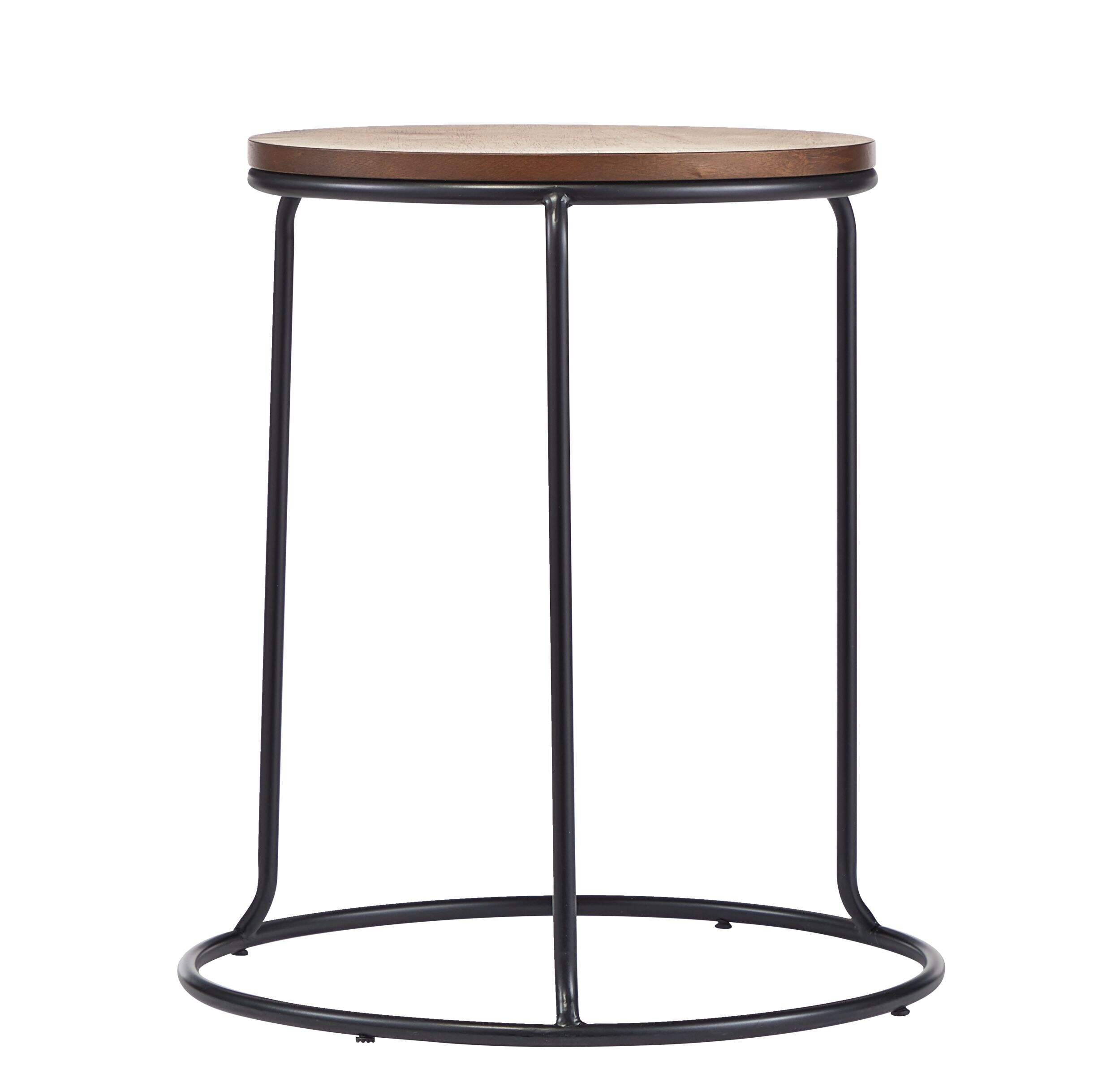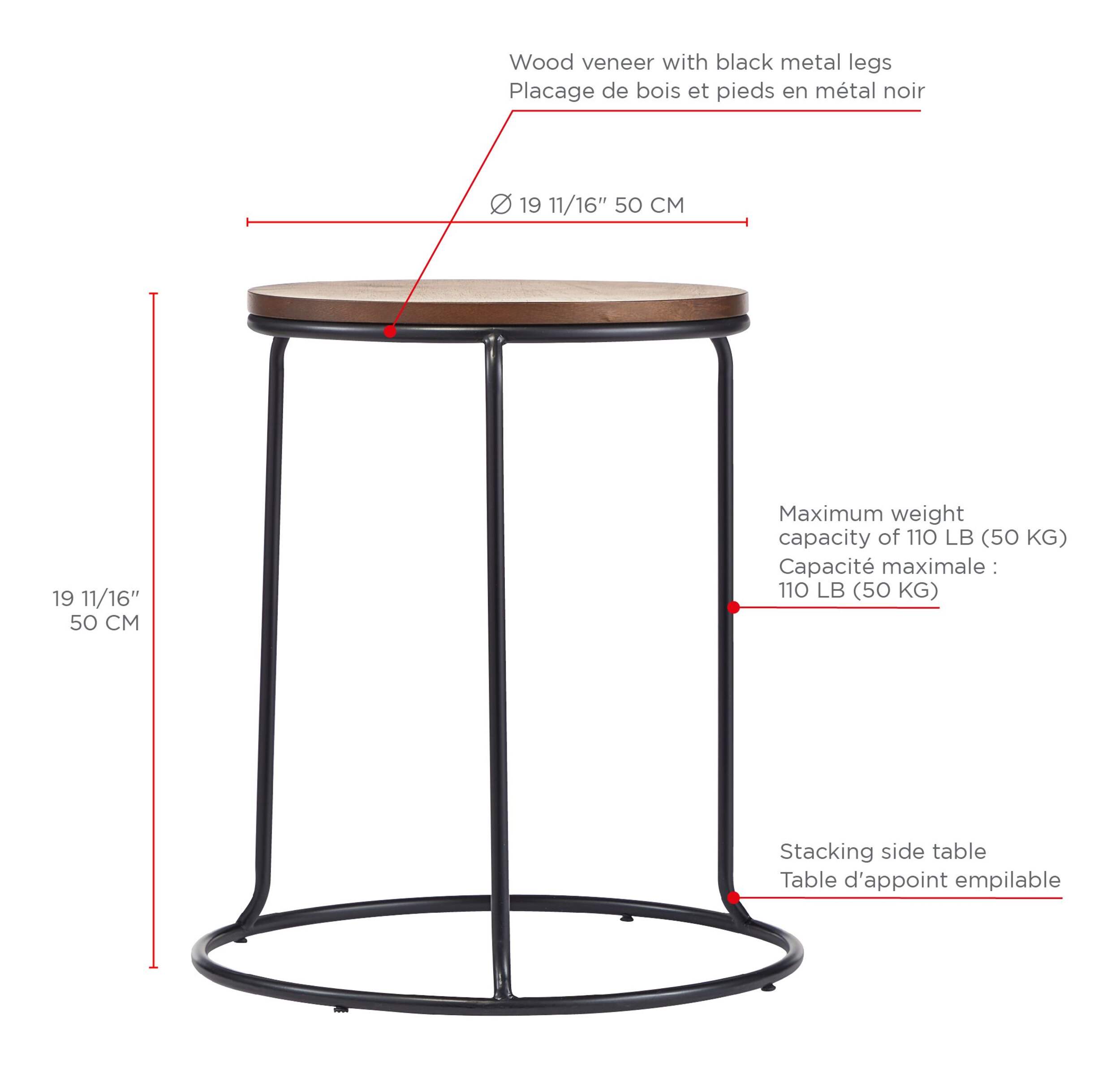 Enjoy much needed storage while adding an accent piece to your home with the CANVAS Kelowna Round Solid Wood Stacking Accent Table with Metal Base. This side table works wonderfully in small spaces, so it's ideally suited for even the most modest of homes. Additionally, it can be stacked with matching tables, so you can easily store them out of the way when not in use. The round shape is roomy enough to hold table lamps, décor, or food items so they stay close at hand. Place this end table next to the sofa, recliner, bed, or anywhere around your home where extra storage is needed. It features a solid wood top that is both attractive and durable with a warm finish. It is contrasted by a durable metal base which has a black finish that easily bodes well for any décor theme. Additionally, it's made from durable materials, so you can rest assured that this wood end table will hold up over time. Because it's lightweight, you can also move it from place to place, enjoying tabletop storage wherever it is needed.