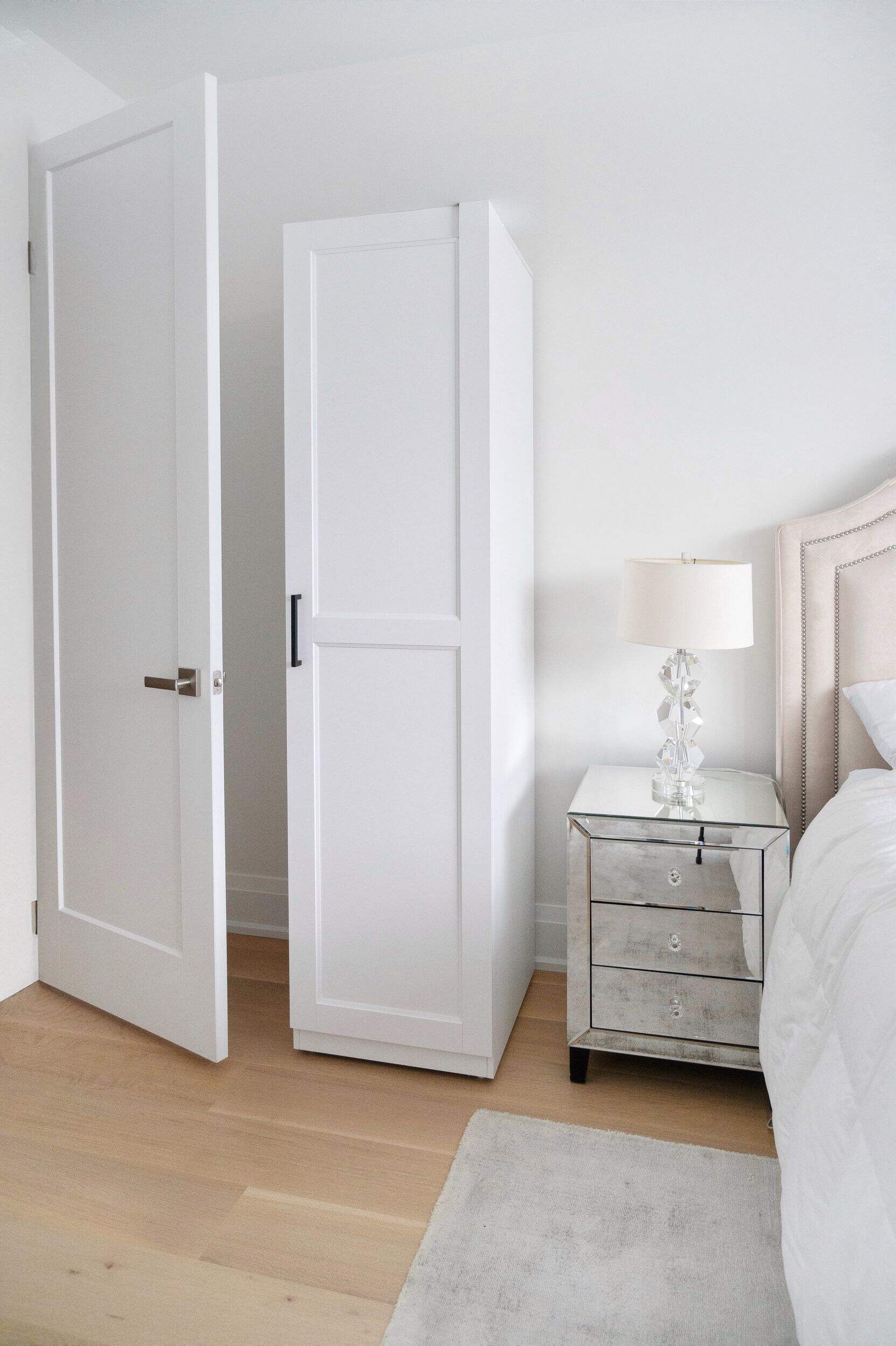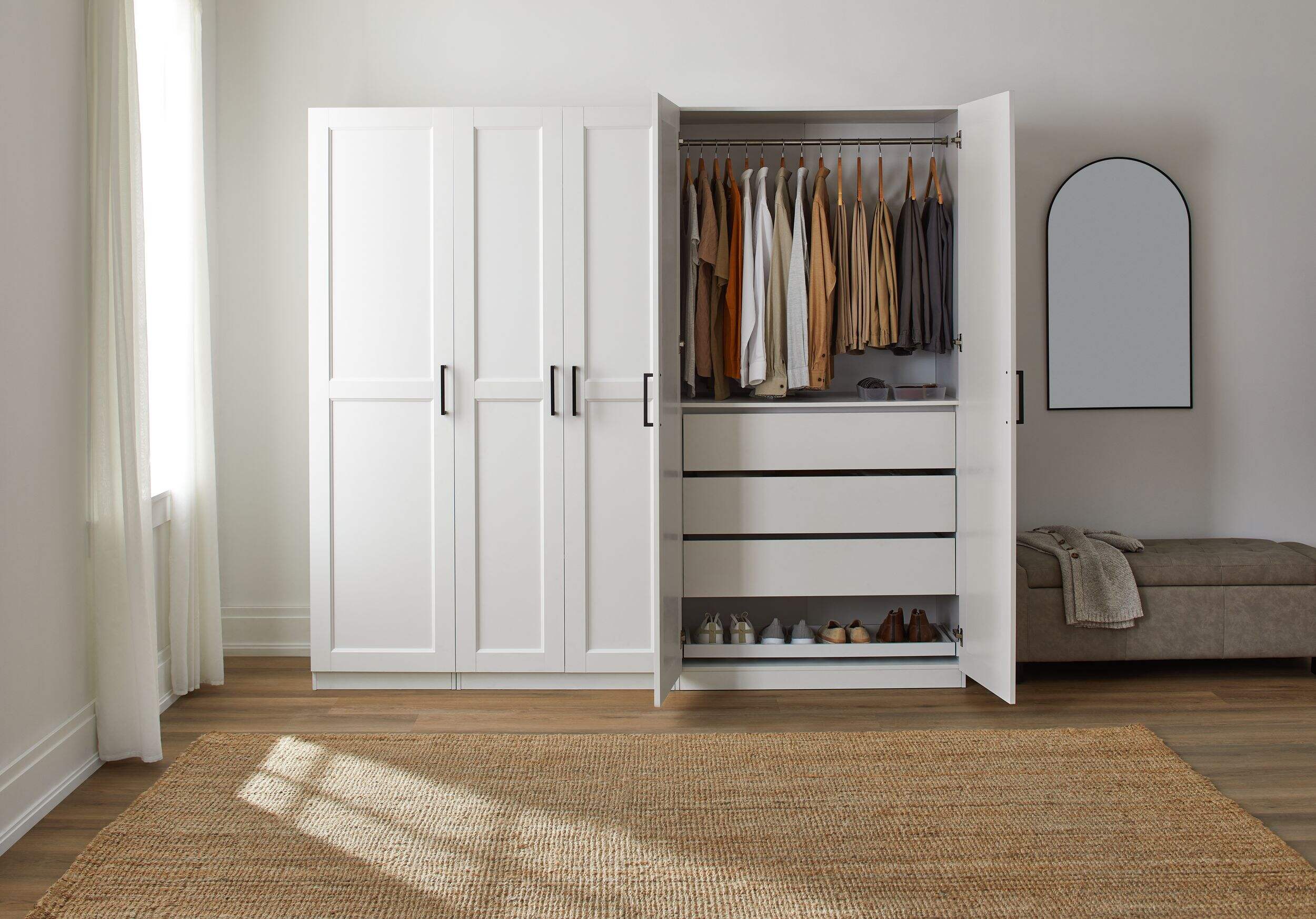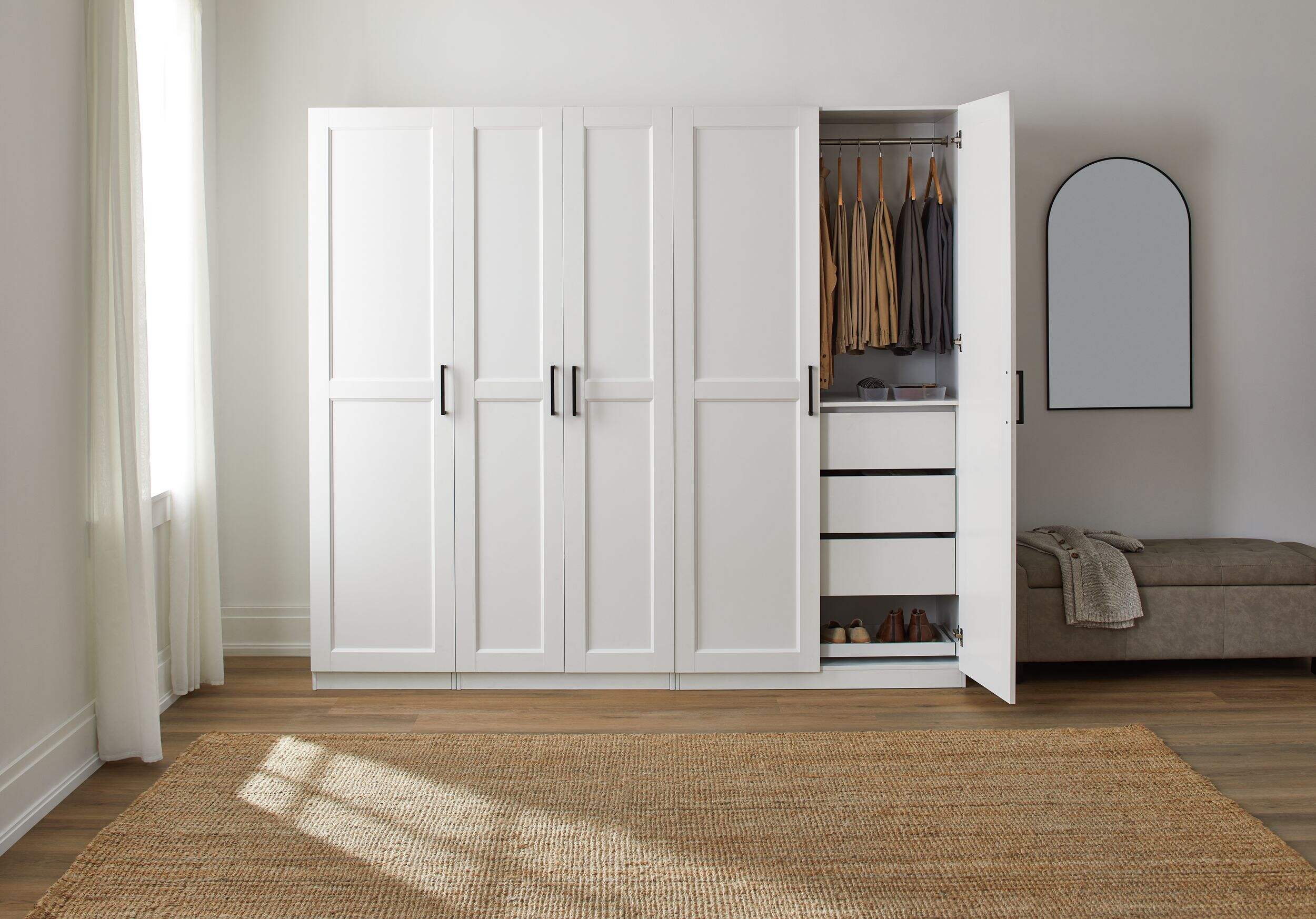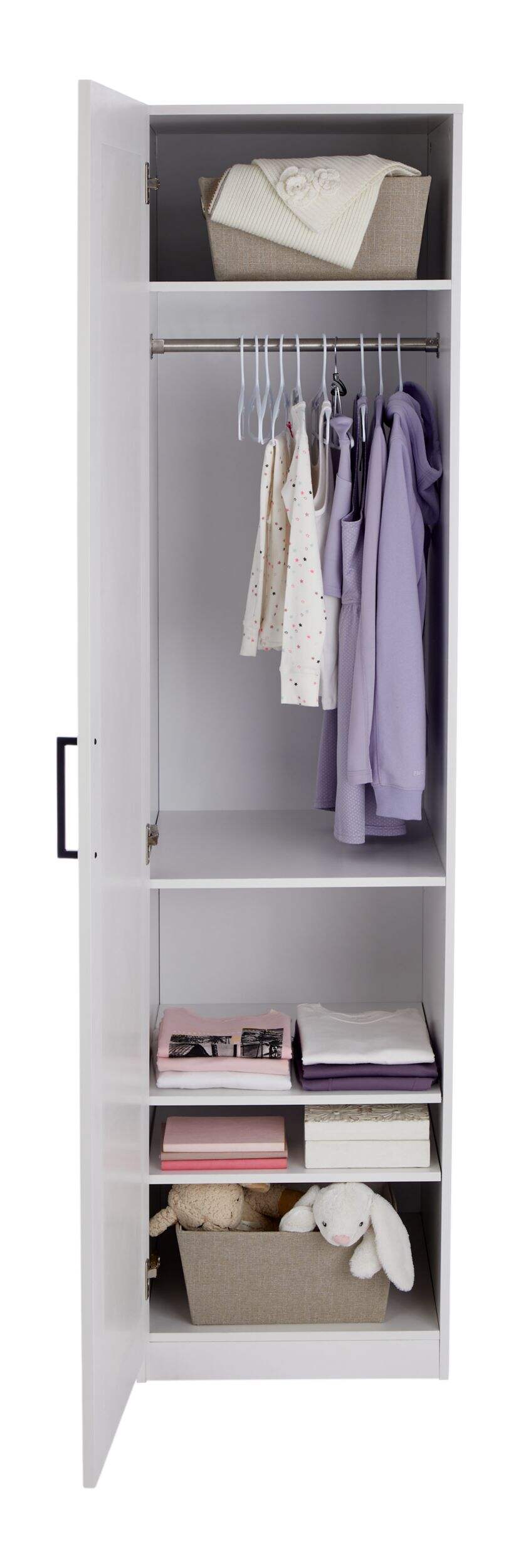 The CANVAS Kelsey Wardrobe system was designed to help you get more out of your space! All units are 80" in height and will sit flush side by side. Each unit can also be used independently or in combination with another unit. The sleek white finish with matte black handles makes it perfect for any space, bedroom, entryway and more. The small wardrobe has ample storage with 3 adjustable shelves, 1 fixed shelf and a hanging to allow for short or long hang. Customize your storage systems to match your unique needs, achieving ultimate organization in style!
