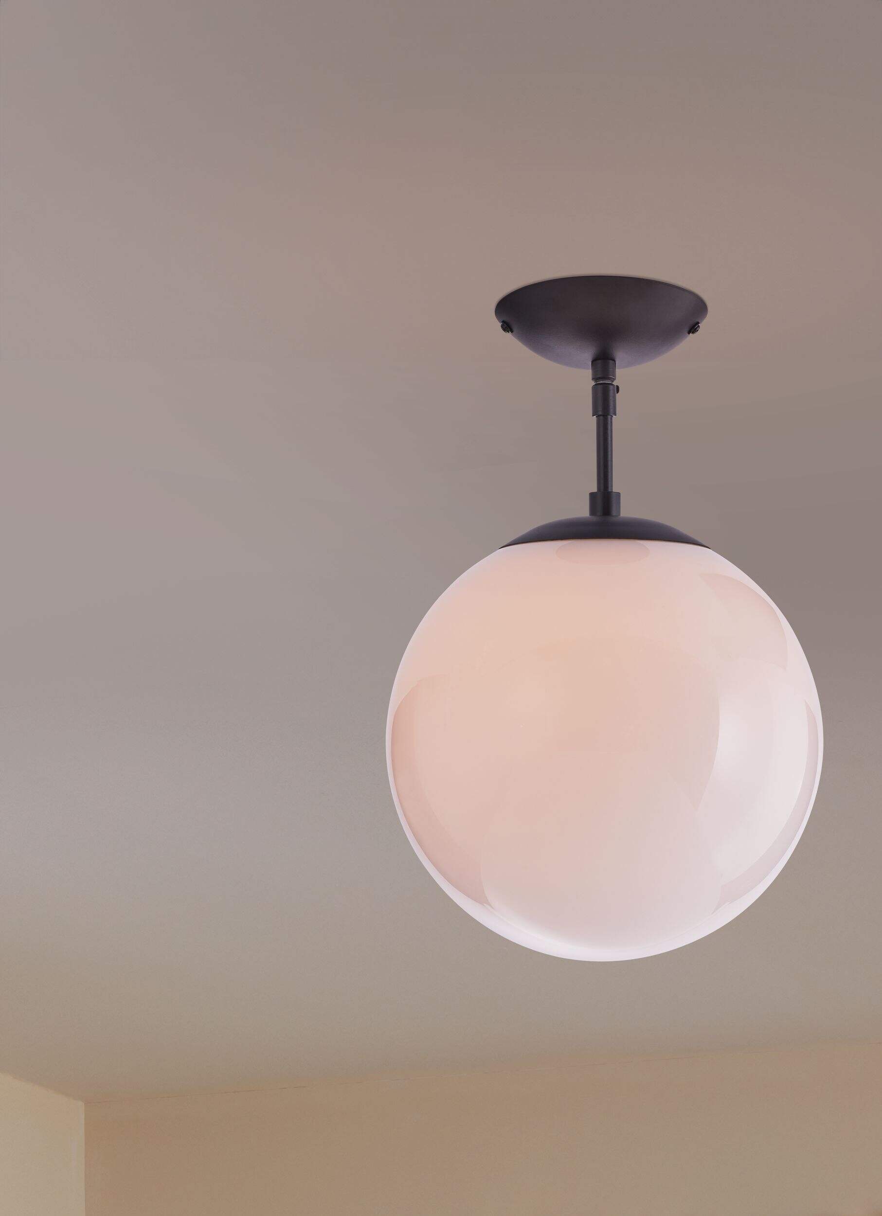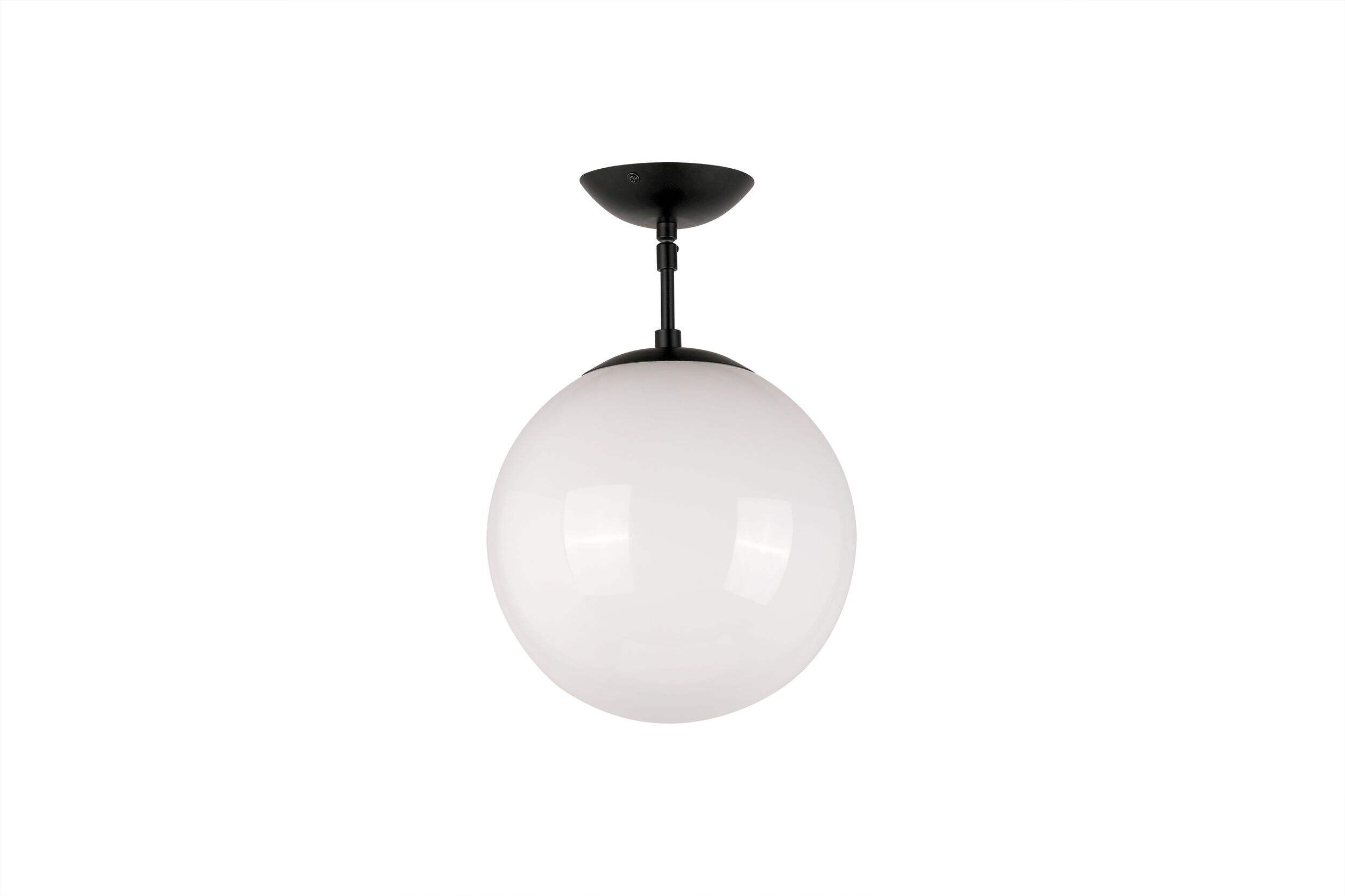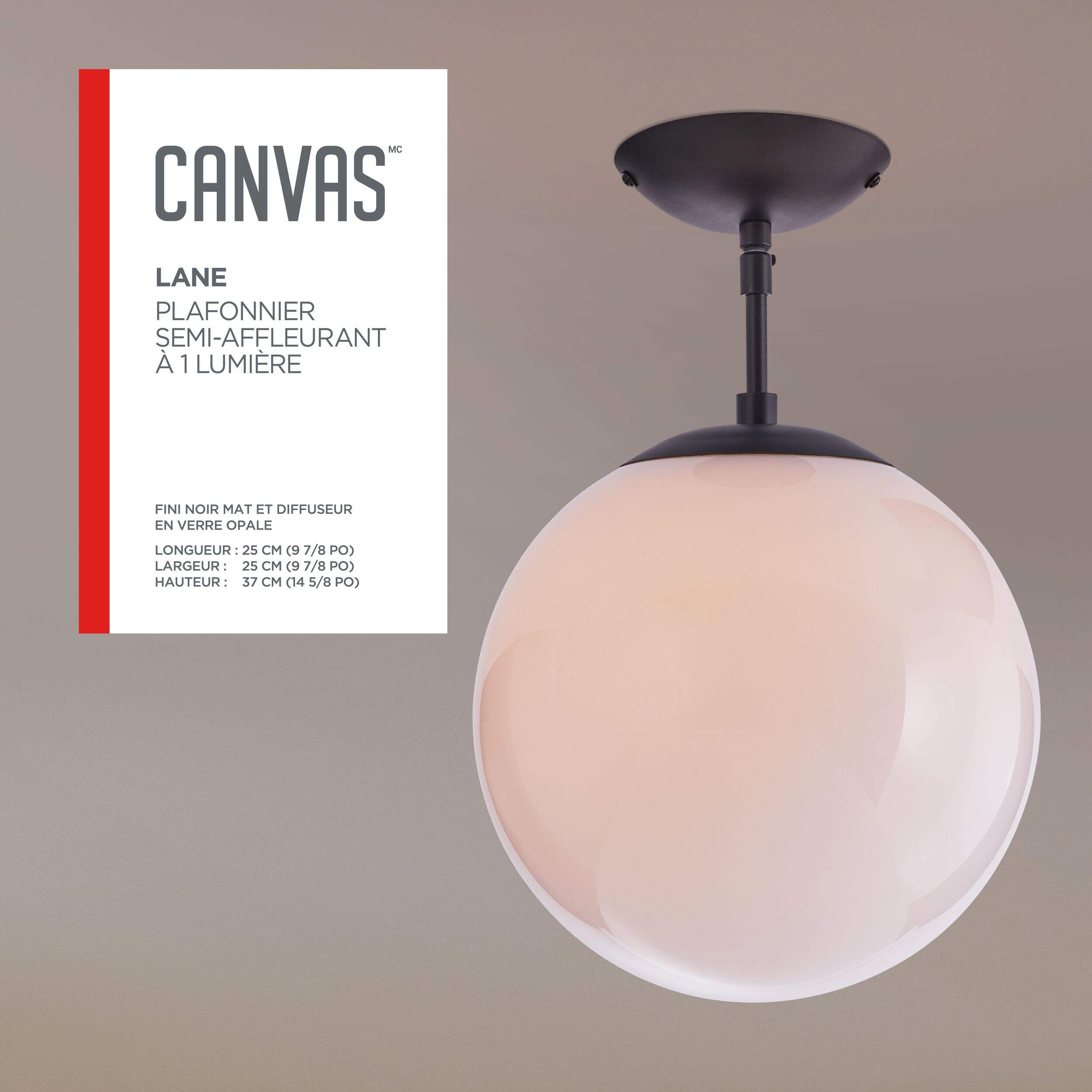 The CANVAS Lane Round 1-Light Semi-Flush Mount Ceiling Light Fixture combines an elegant black fixture with an opal glass shade for a seamless fit into modern interiors.