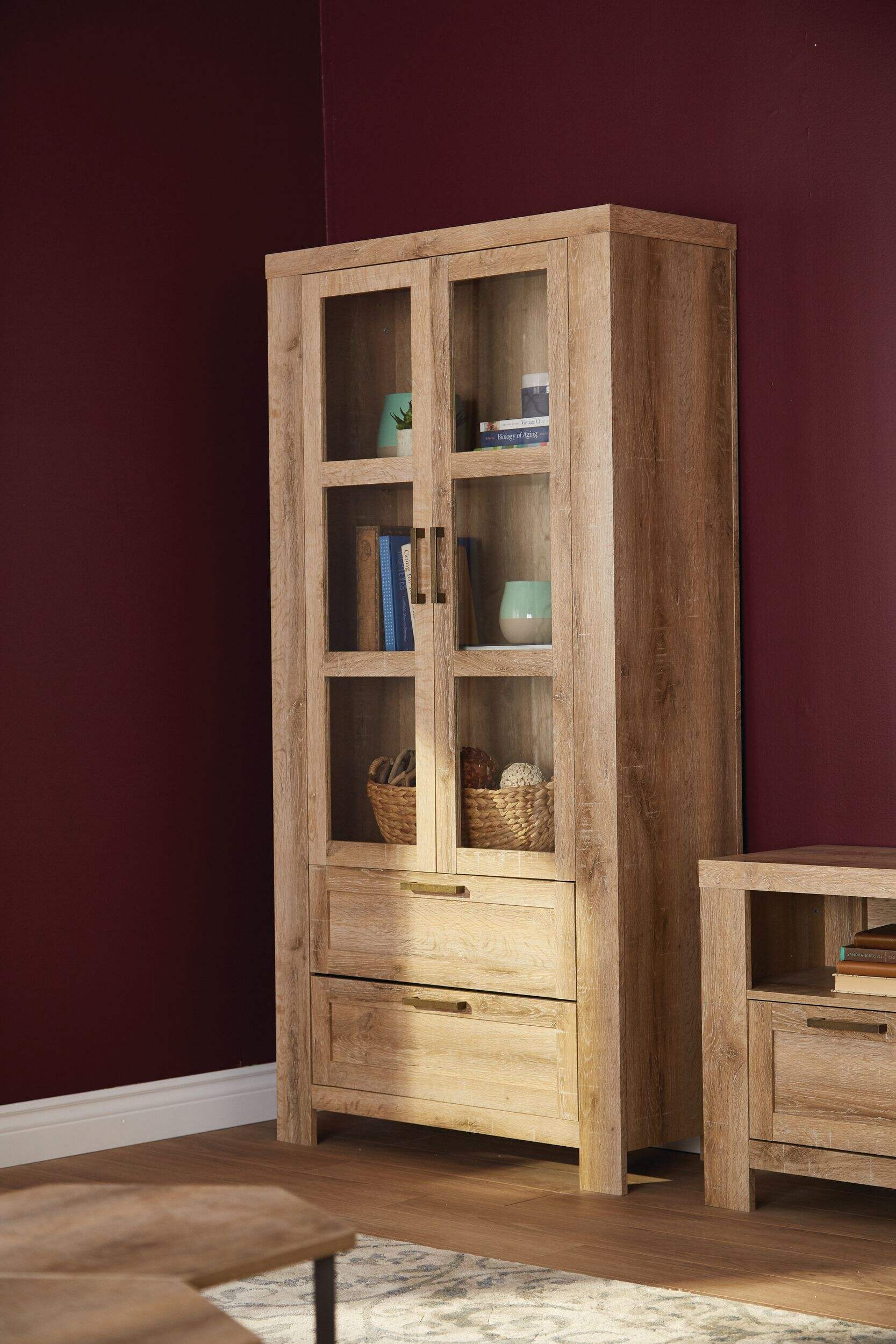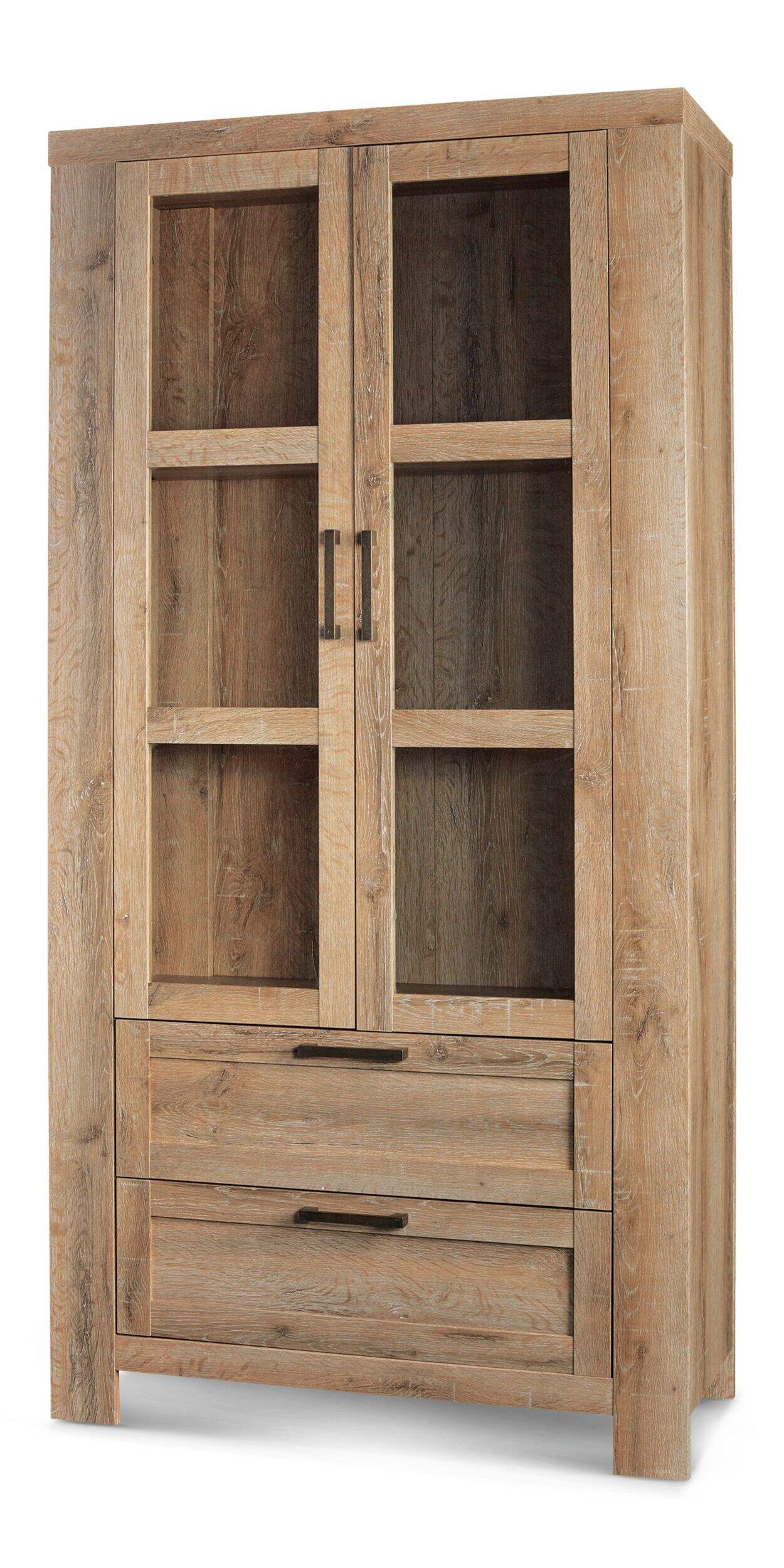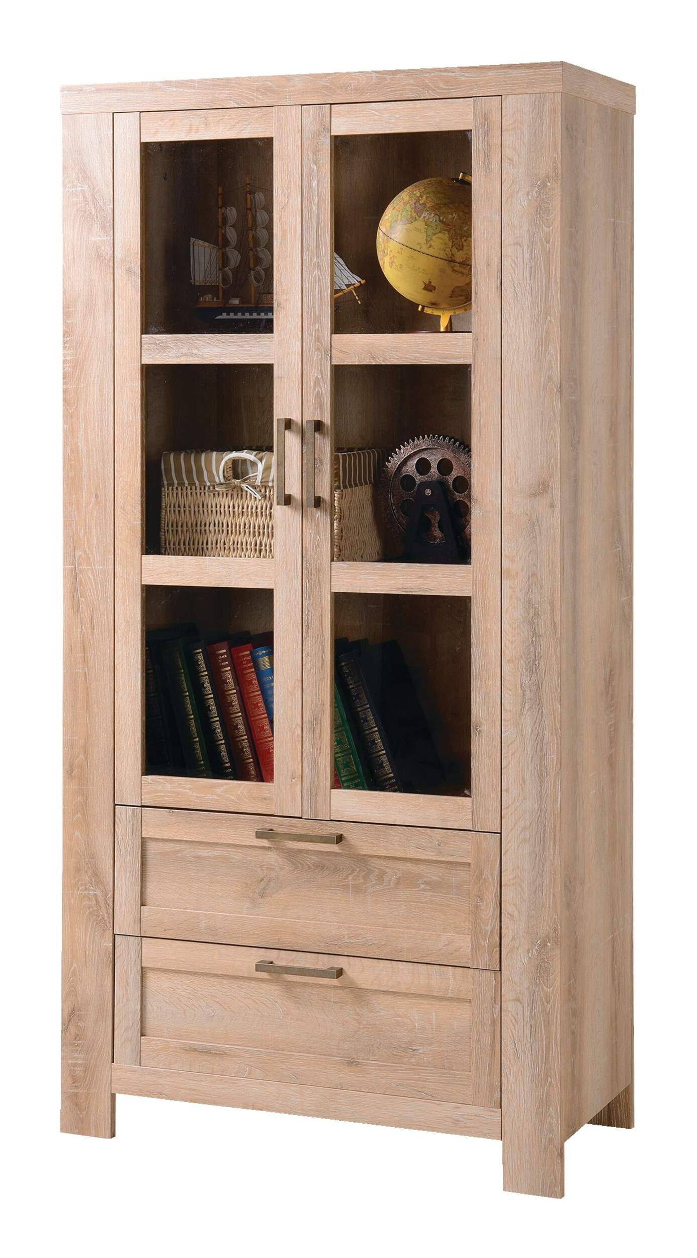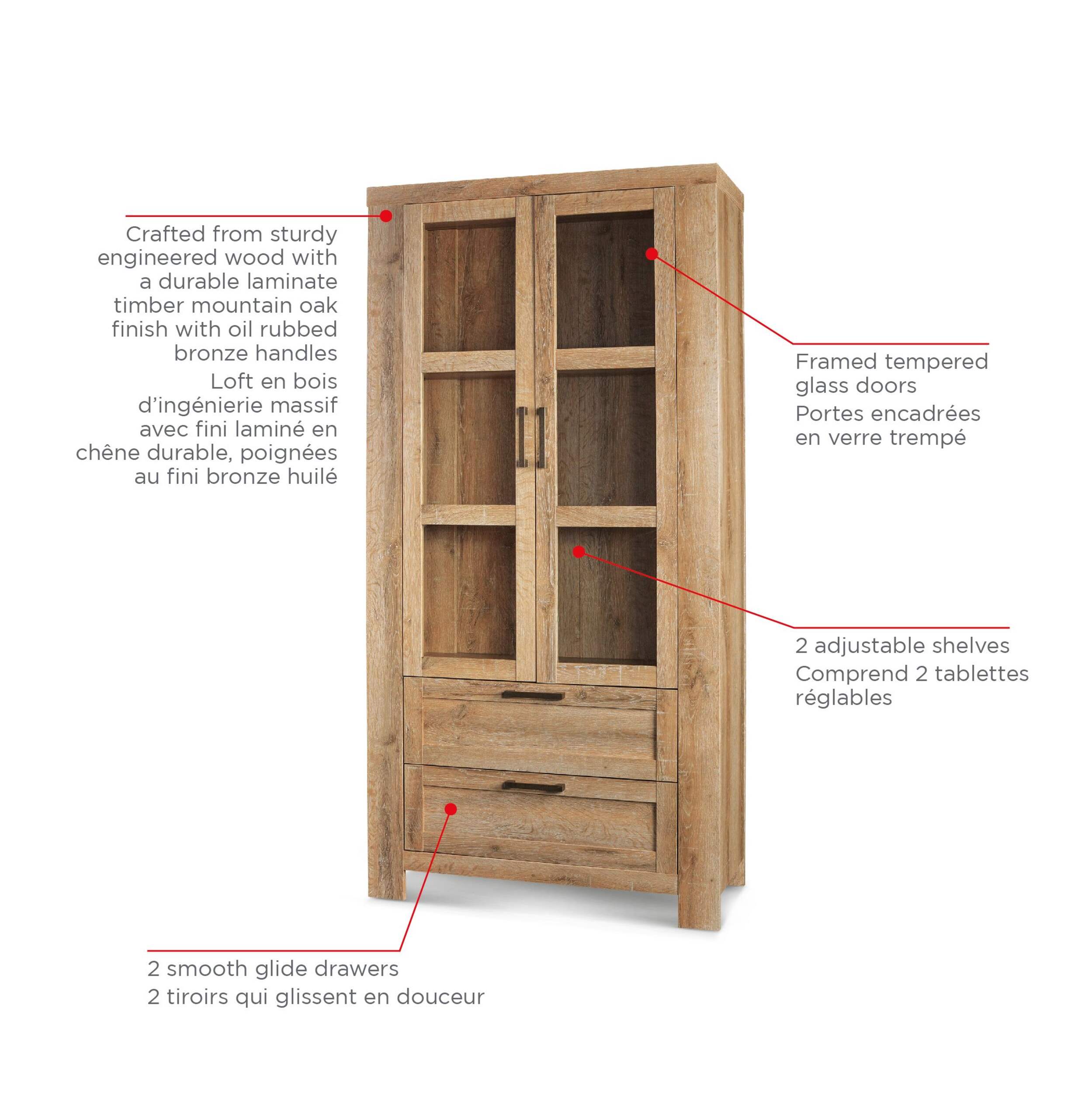 This CANVAS Loft 2-Door Glass Front Storage Cabinet with 2 Drawers is a handsome wooden piece that can enhance a living room, dining room, bedroom or library. With tempered glass-panelled doors for safety, it can become a perfect home for a fine china collection, artistic glassware or a selection of books. You could also make it into a place for your audio-visual equipment. Depending on your furniture placement, the two roomy drawers can house drawing pads and colouring products, a collection of recorded movies or music, or your favourite family games. The mountain oak finish on this storage cabinet gives it contemporary style that would easily complement existing furnishings. Whether your style is casual or a little more formal, this storage cabinet will be a good addition to your home. Easy to assemble, the cabinet features adjustable shelves and smooth glide doors for the ultimate convenience.