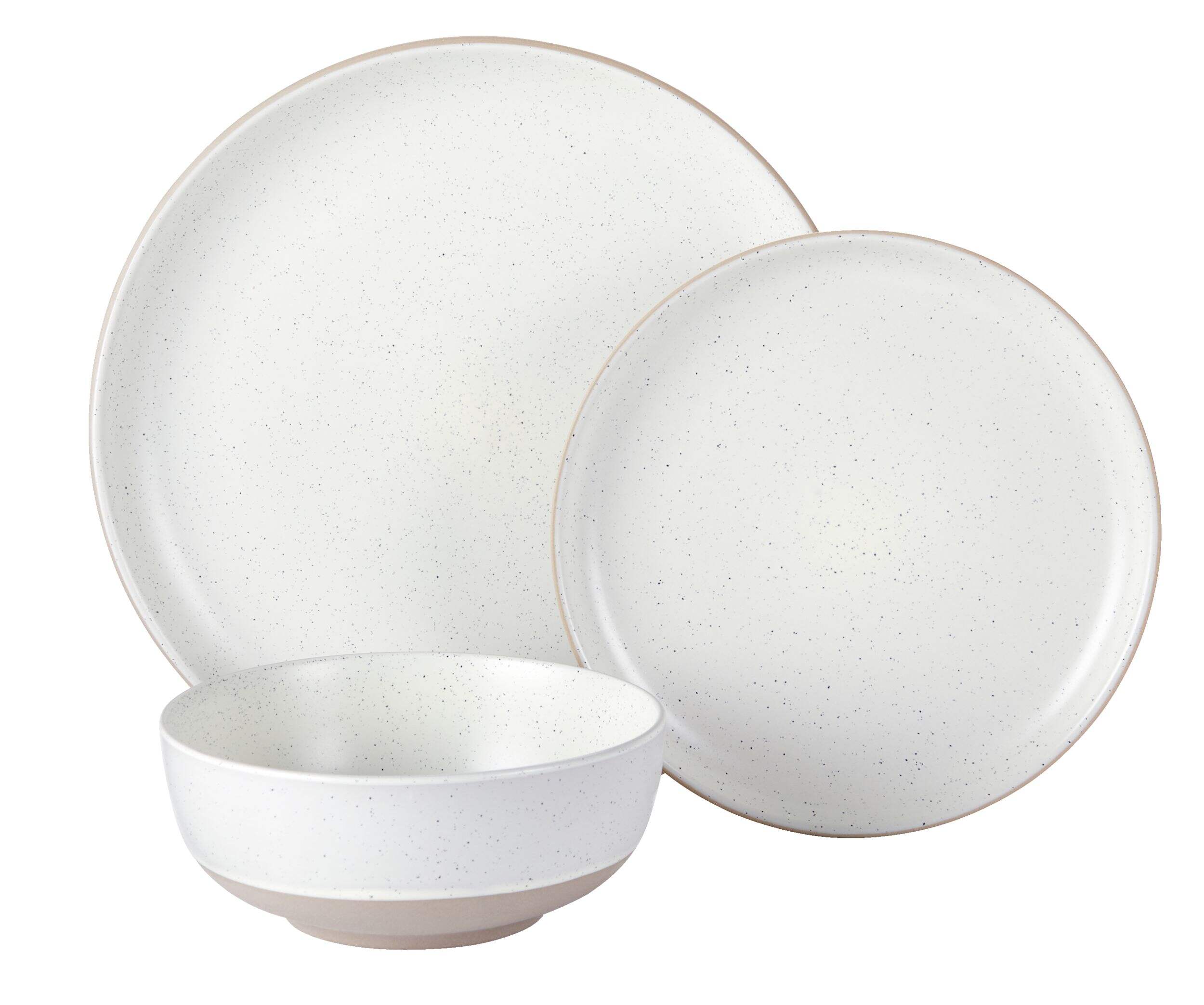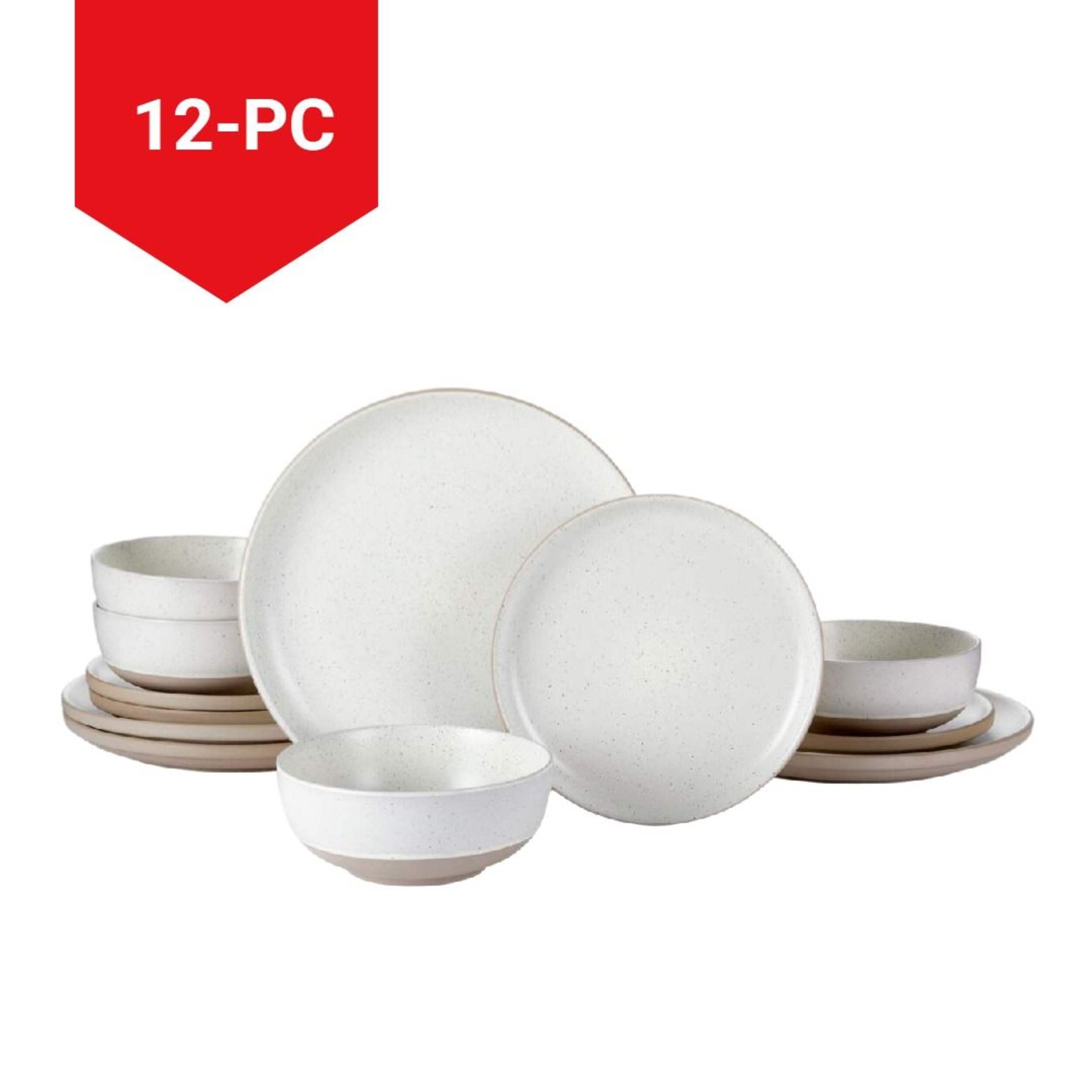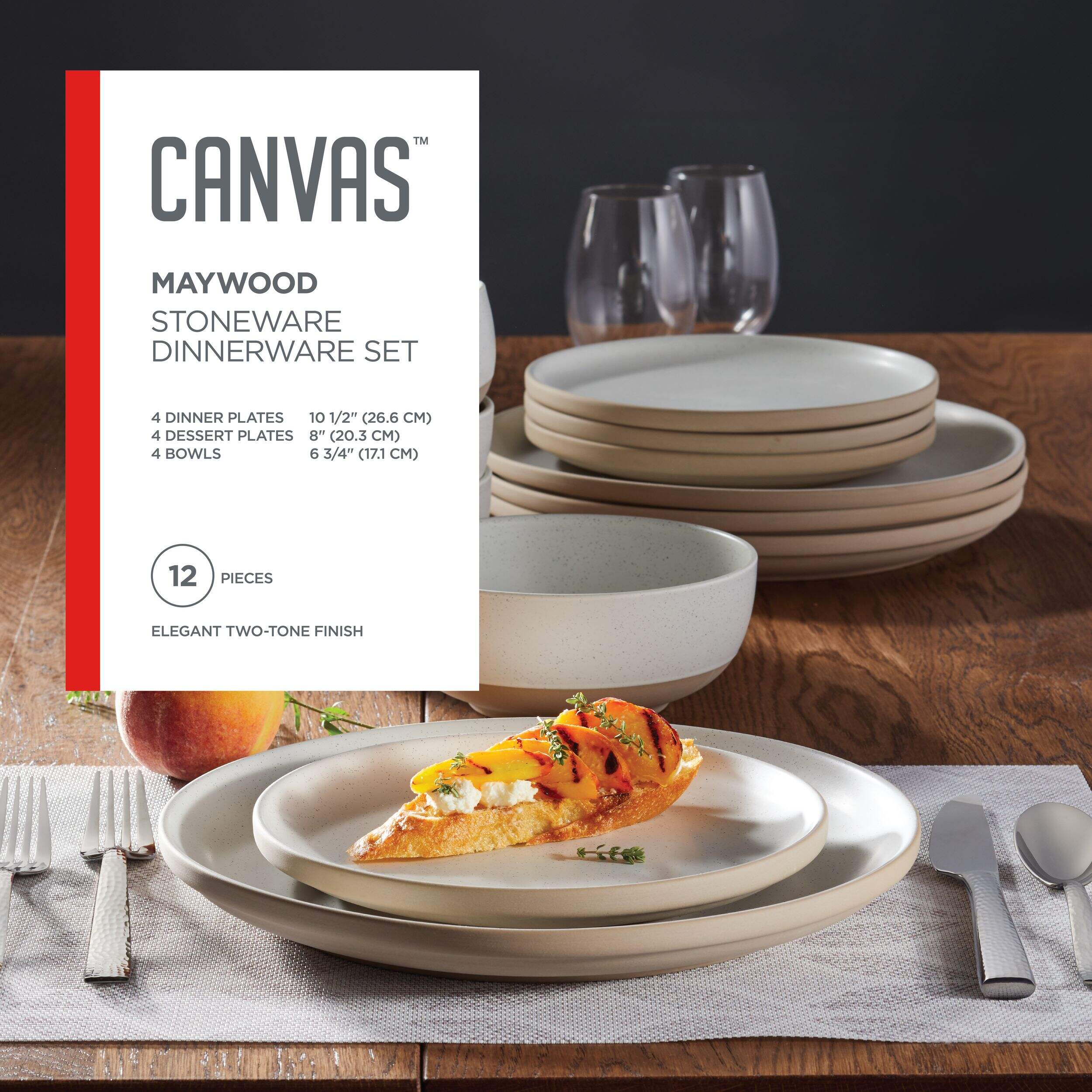 Elevate your everyday meals with the CANVAS Maywood Speckled Two-Toned 12-Piece Dinnerware Set. Featuring a beautiful stoneware polish, each piece in this set adds a touch of sophistication to your table while maintaining a casual charm. The set includes four dinner plates, four side plates, and four soup bowls, designed with a modern coupe shape that allows for easy stacking and convenient storage.