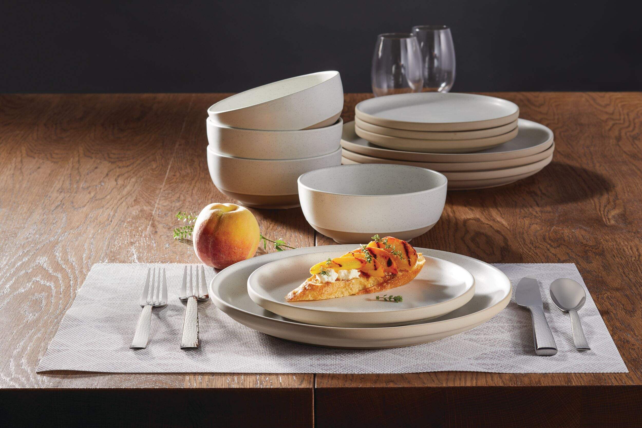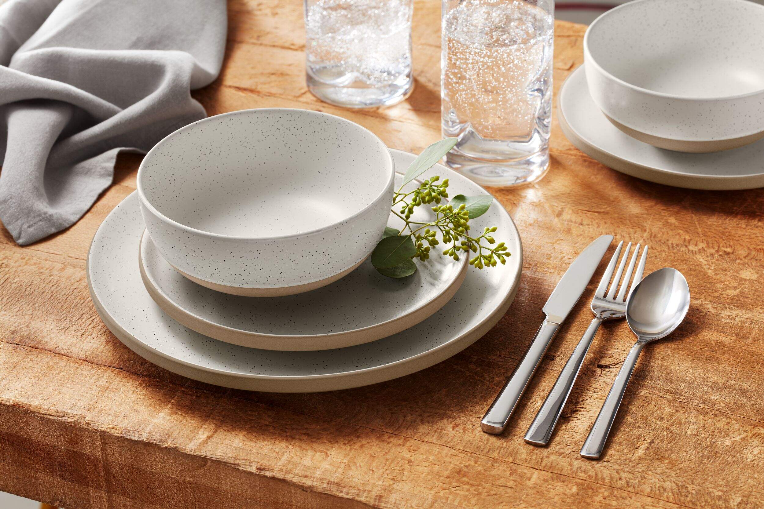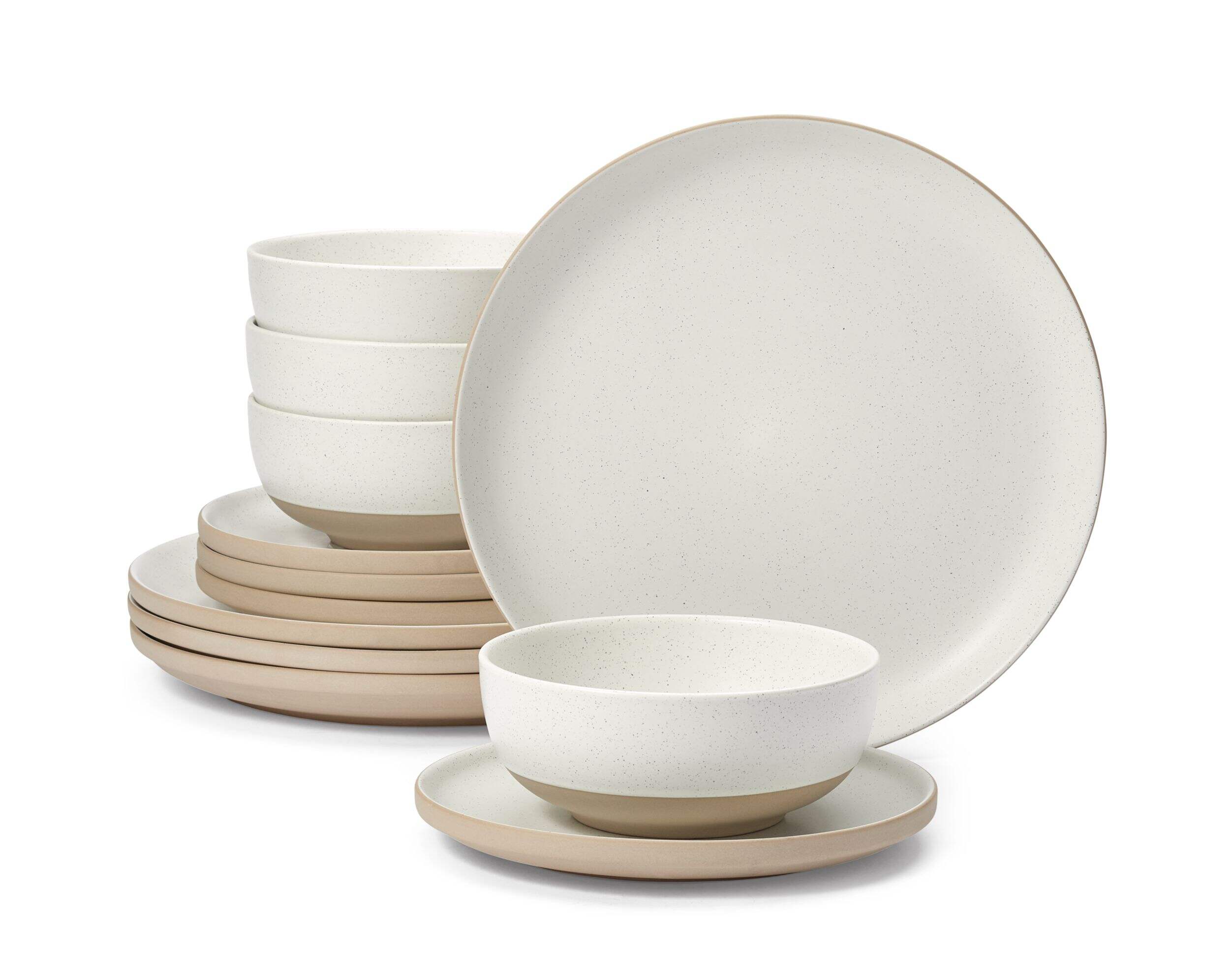 Elevate your everyday meals with the CANVAS Maywood Speckled Two-Toned 12-Piece Dinnerware Set. Featuring a beautiful stoneware polish, each piece in this set adds a touch of sophistication to your table while maintaining a casual charm. The set includes four dinner plates, four side plates, and four soup bowls, designed with a modern coupe shape that allows for easy stacking and convenient storage.