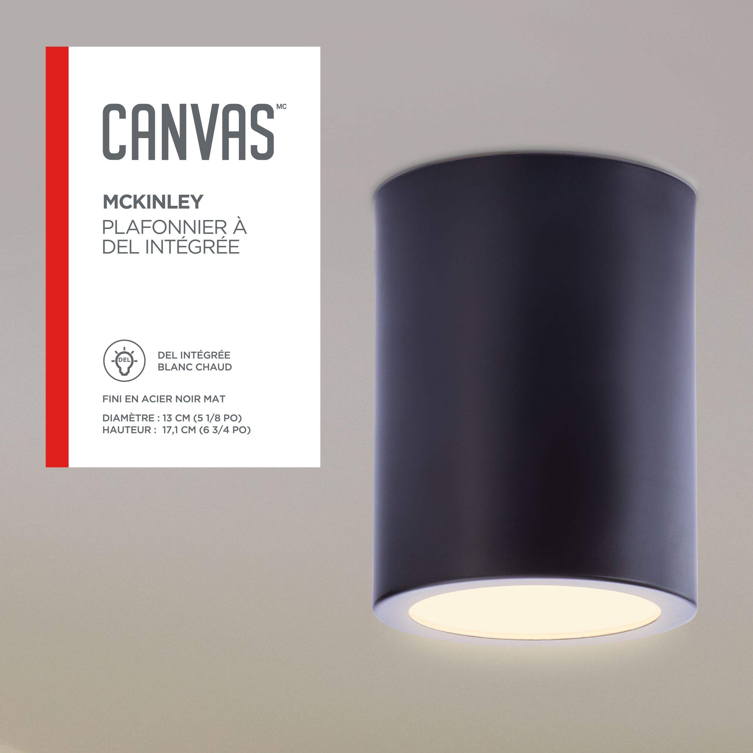 The CANVAS McKinley Integrated LED Cylinder Flush Mount Ceiling Light Fixture in Black, 5-in, combines modern design with energy-efficient lighting. This sleek fixture features a cylindrical shape and a matte black finish, making it a stylish addition to any room. The integrated LED technology ensures long-lasting, bright illumination while reducing energy consumption. Perfect for low ceilings, this flush mount light provides a clean, contemporary look and is easy to install, enhancing the ambiance of your living space.