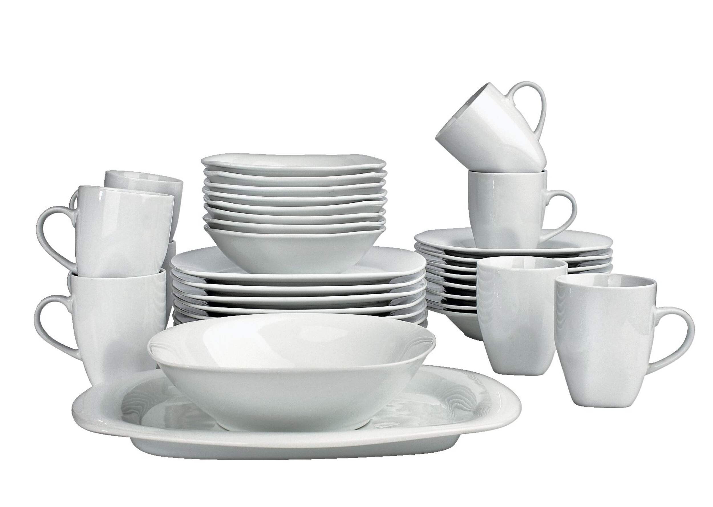 Set includes 34 pieces: 8 dinner plates, 8 side plates, 8 bowls, 8 mugs, 1 oval platter and 1 serving bowl