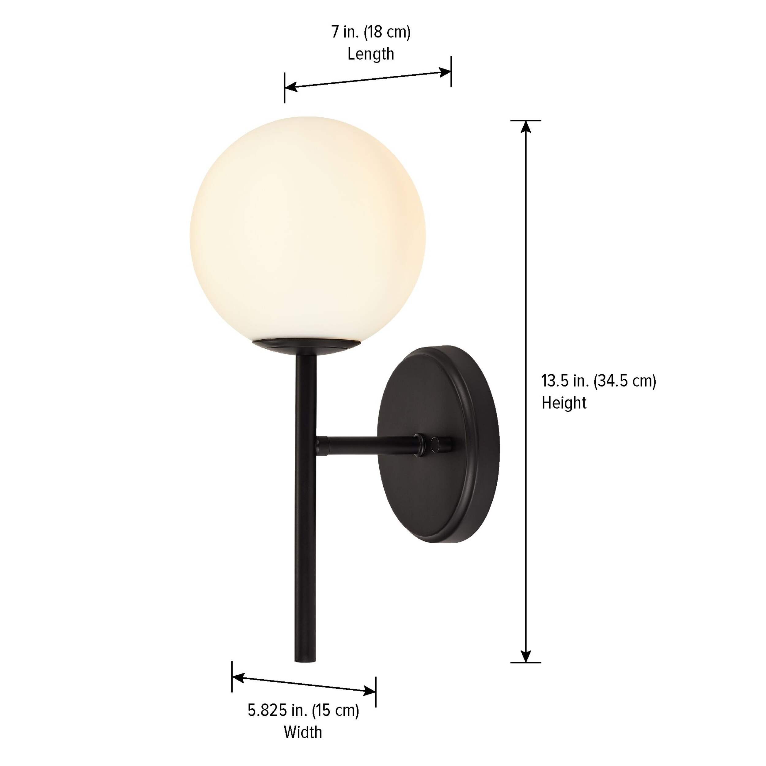 The CANVAS Millbrook 1-Light Opal Globe Sconce Light Fixture is a sleek and stylish addition to exterior walls. Its black finish provides a modern touch, while the opal globe shade casts a soft, ambient glow. Wet rated for safe outdoor use, this sconce requires a B10 bulb with an E1 base (sold separately).