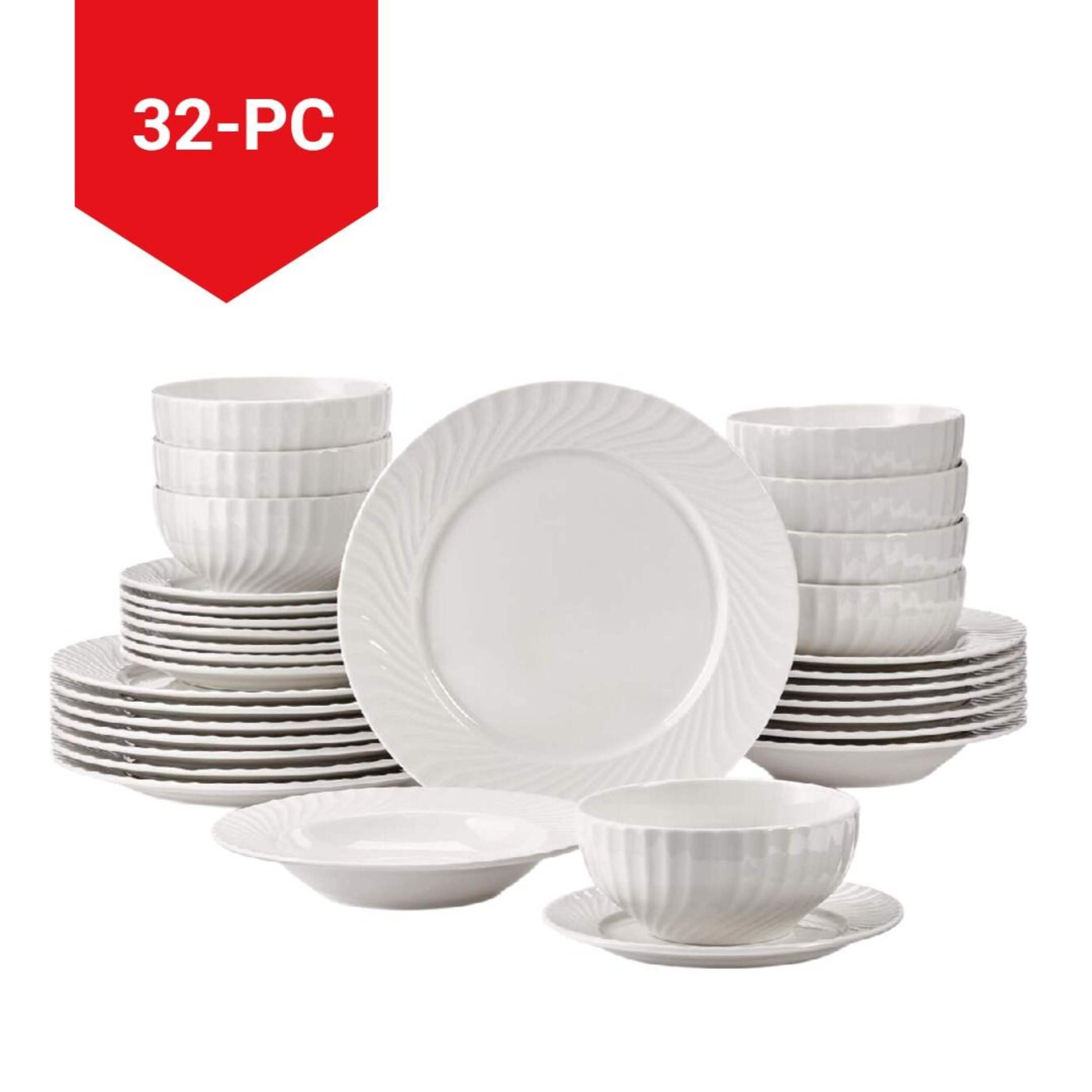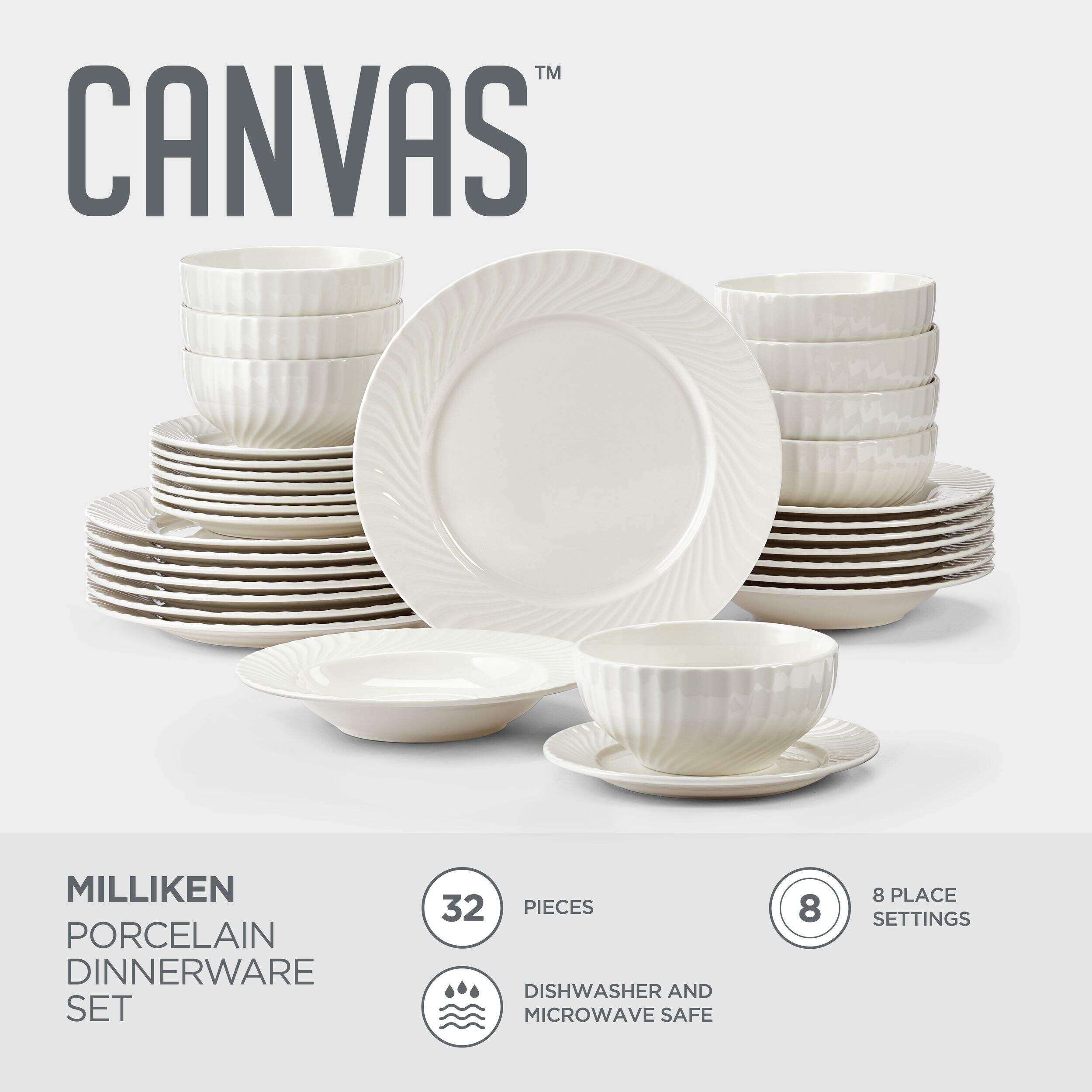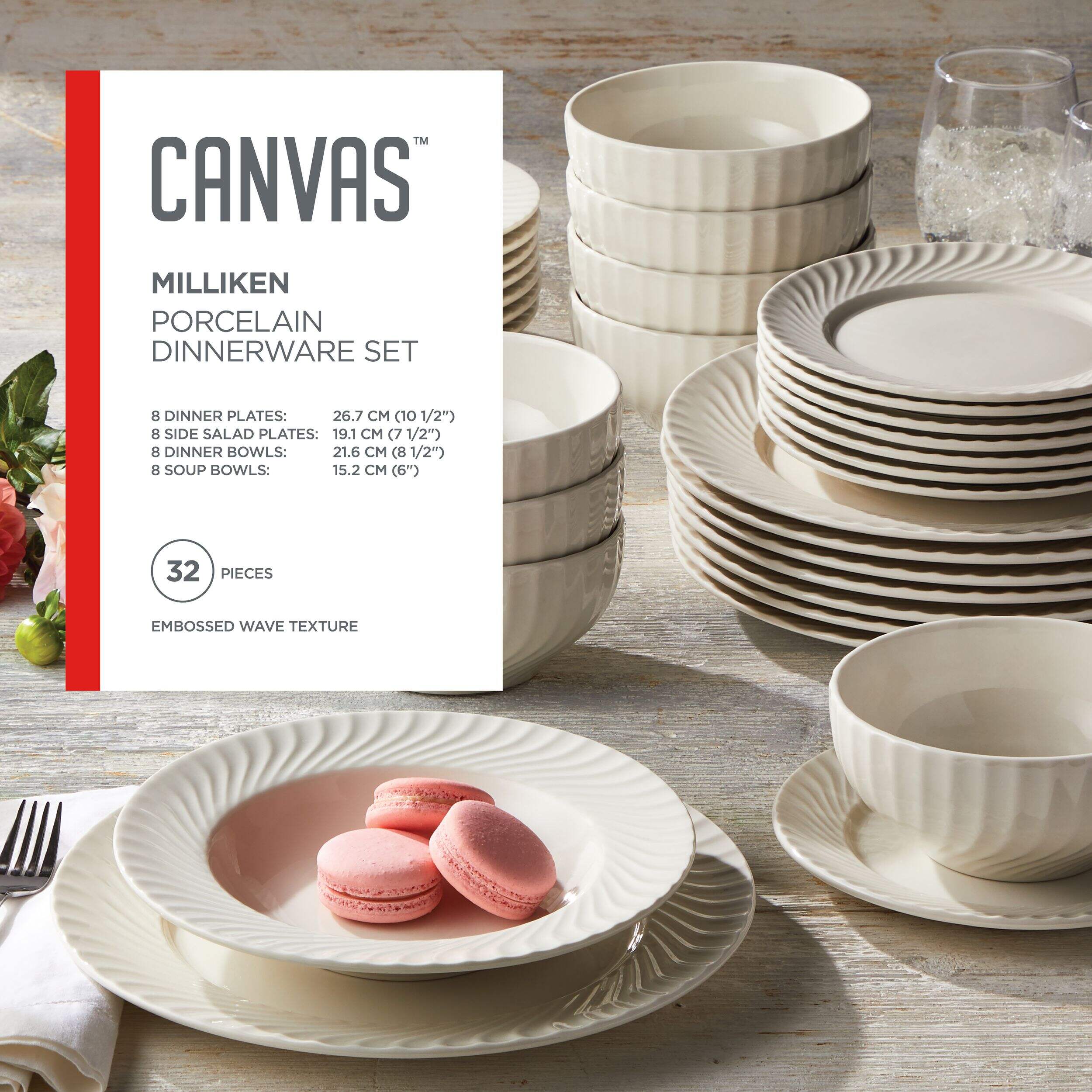The CANVAS Milliken Embossed Stoneware Dinnerware Set brings versatile style to everyday dining and entertaining. This 32-piece white stone dinnerware includes 8 each of dinner plates, soup bowls, salad plates, and bowls. Along with style and ease of use, these stackable pieces allow for convenient storage. With simple elegance and everyday durability, the CANVAS stoneware dinnerware provides the perfect backdrop for family meals or special occasions.