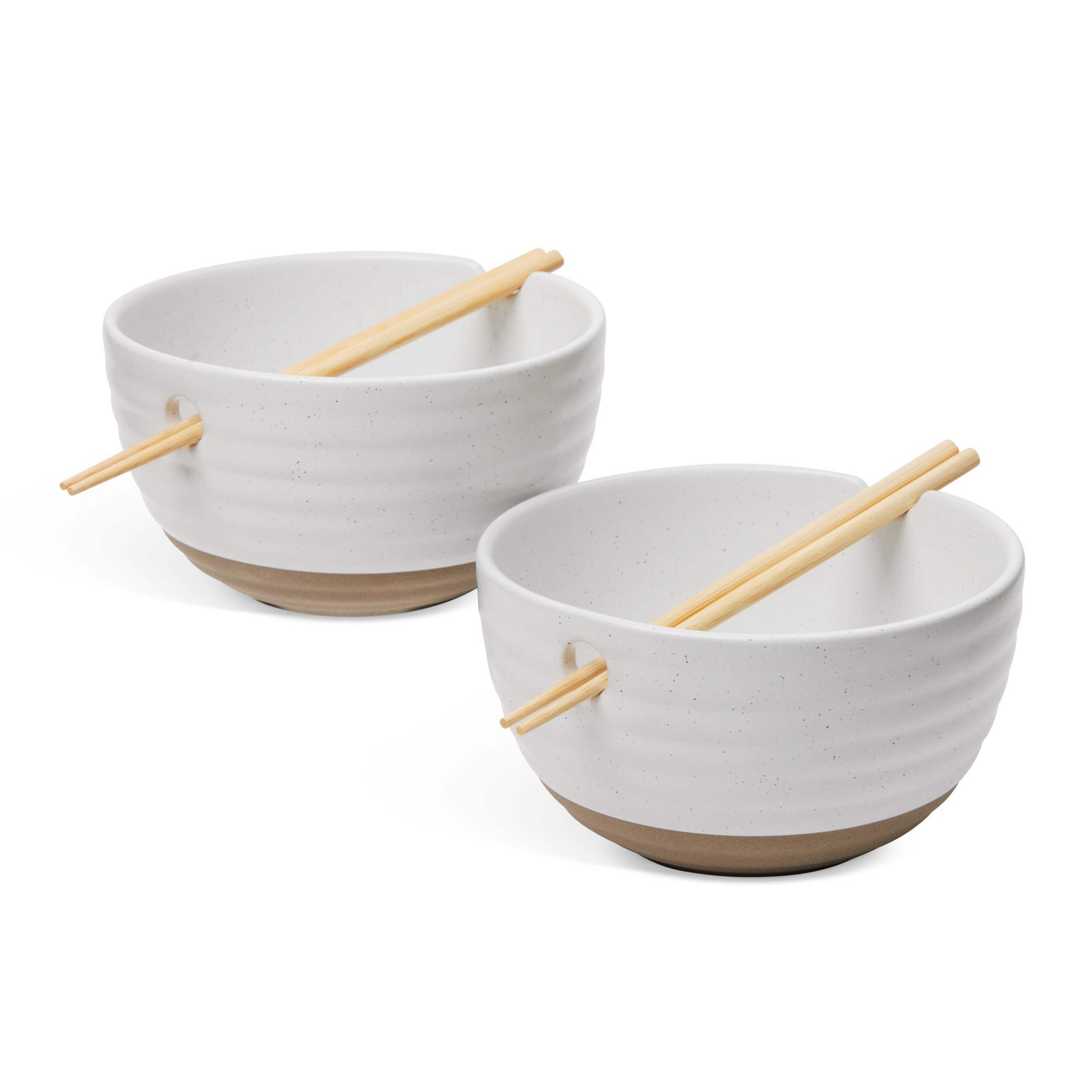 The CANVAS Noodle Bowl with Chopsticks Set, white, 4-pc, transports you to a rustic pottery studio with its speckled stoneware finish and exposed terracotta bottom. This simple yet stylish noodle bowl and chopsticks set is perfect for slurping up steaming soups and stir-fries in comfort. The two generously sized bowls provide plenty of space for your favourite Asian dishes while the natural bamboo chopsticks allow you to enjoy every last bite with authentic flair. Best of all, this set cleans up easily in the dishwasher and microwave for simple, stylish dining again and again.