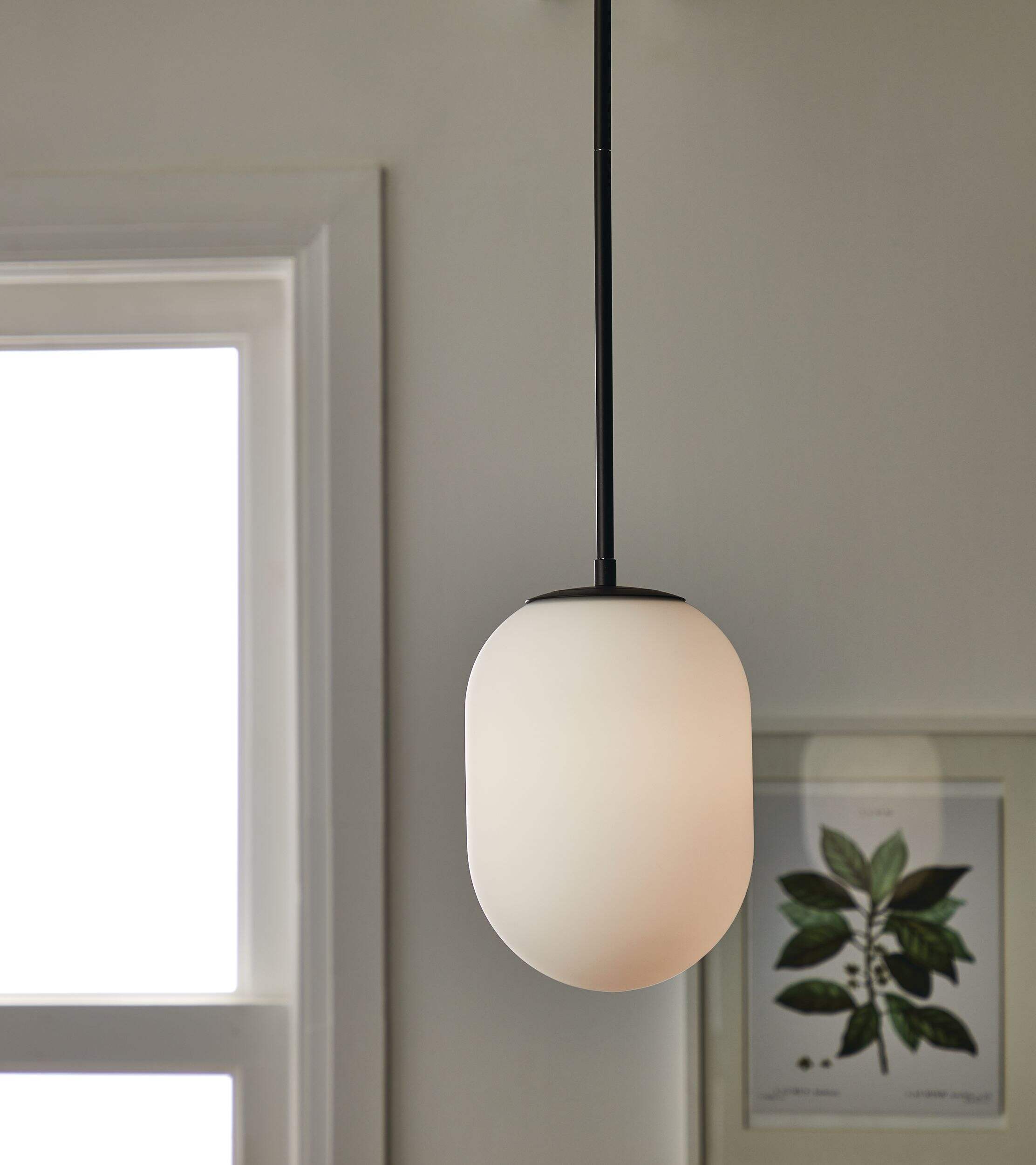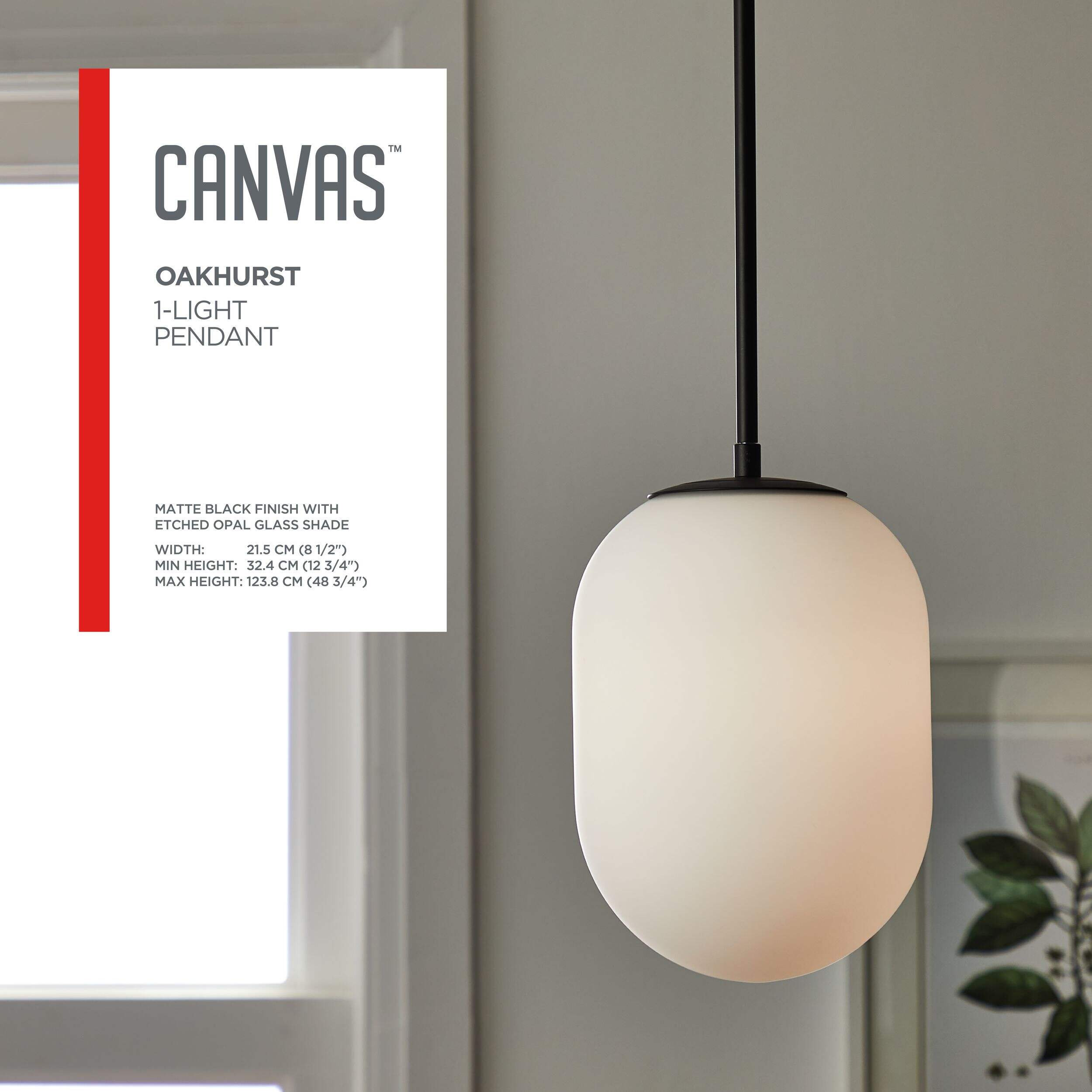The CANVAS Westwood 1-Light Etched Glass Shade Ceiling Pendant Light Fixture in Matte Black adds a clean, modern touch to any room. This adjustable pendant requires assembly and features an oval shaped glass shade with a matte black finish. Designed to accommodate one 60W max A19 shape, E26 bulb base (not included), this ceiling light fixture offers a versatile lighting solution.