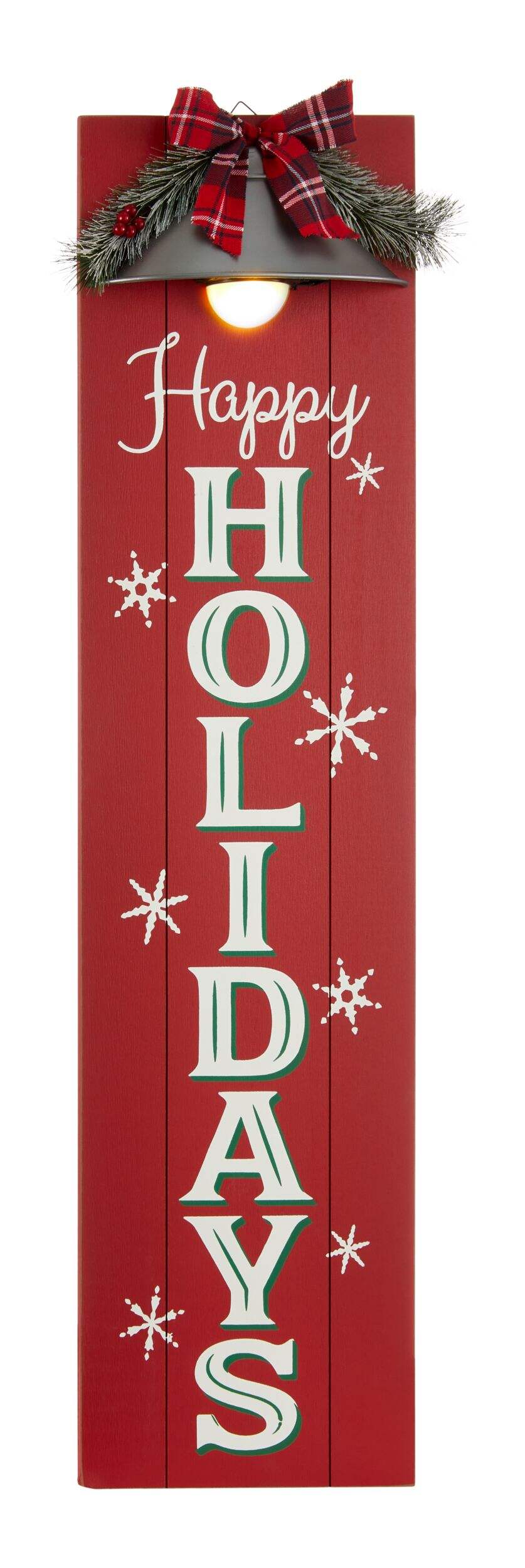 The CANVAS Happy Holidays LED Holiday Porch Sign brings festive cheer to your entryway or covered porch space. Crafted of weather-resistant materials, this English language sign can be displayed outdoors under a covered porch area.
