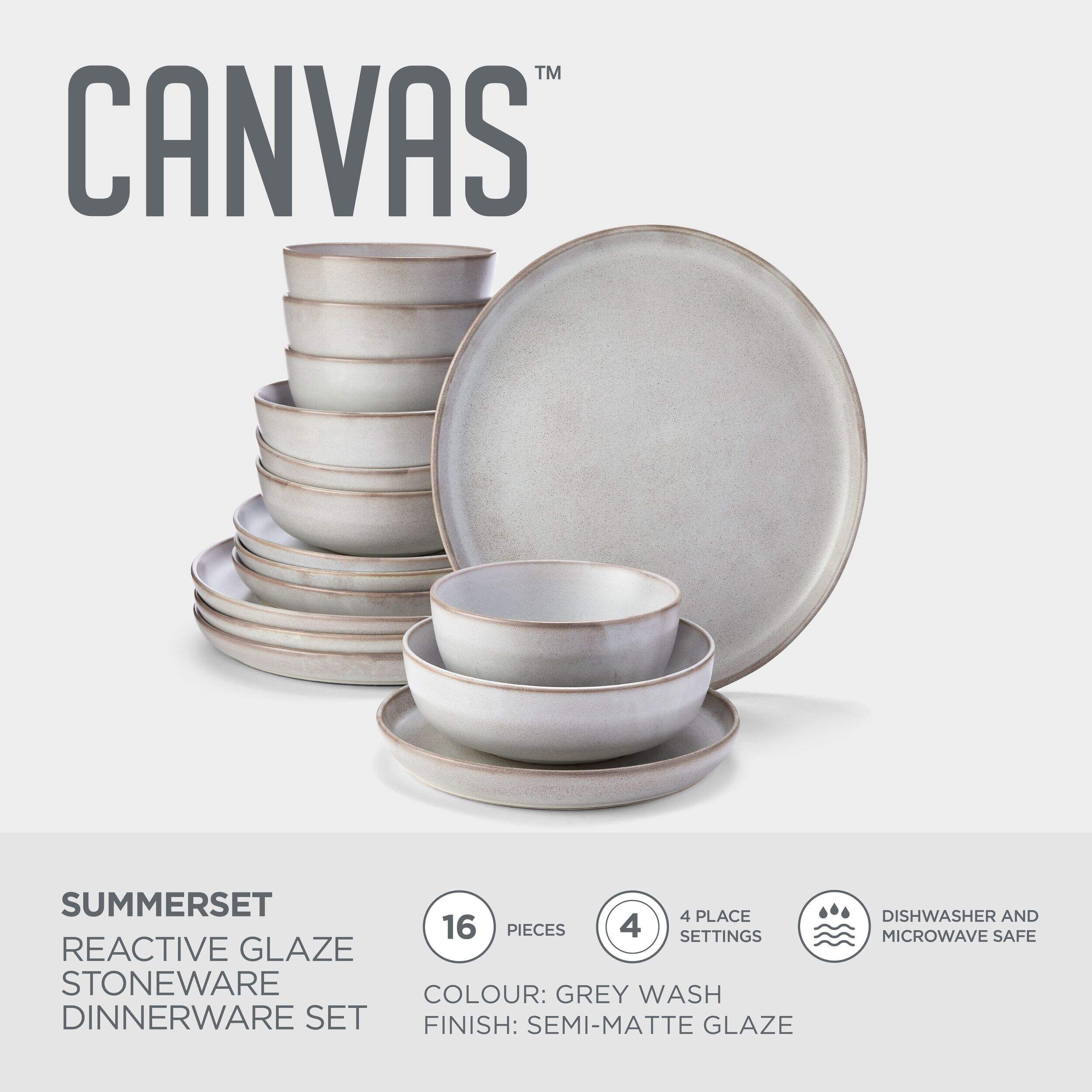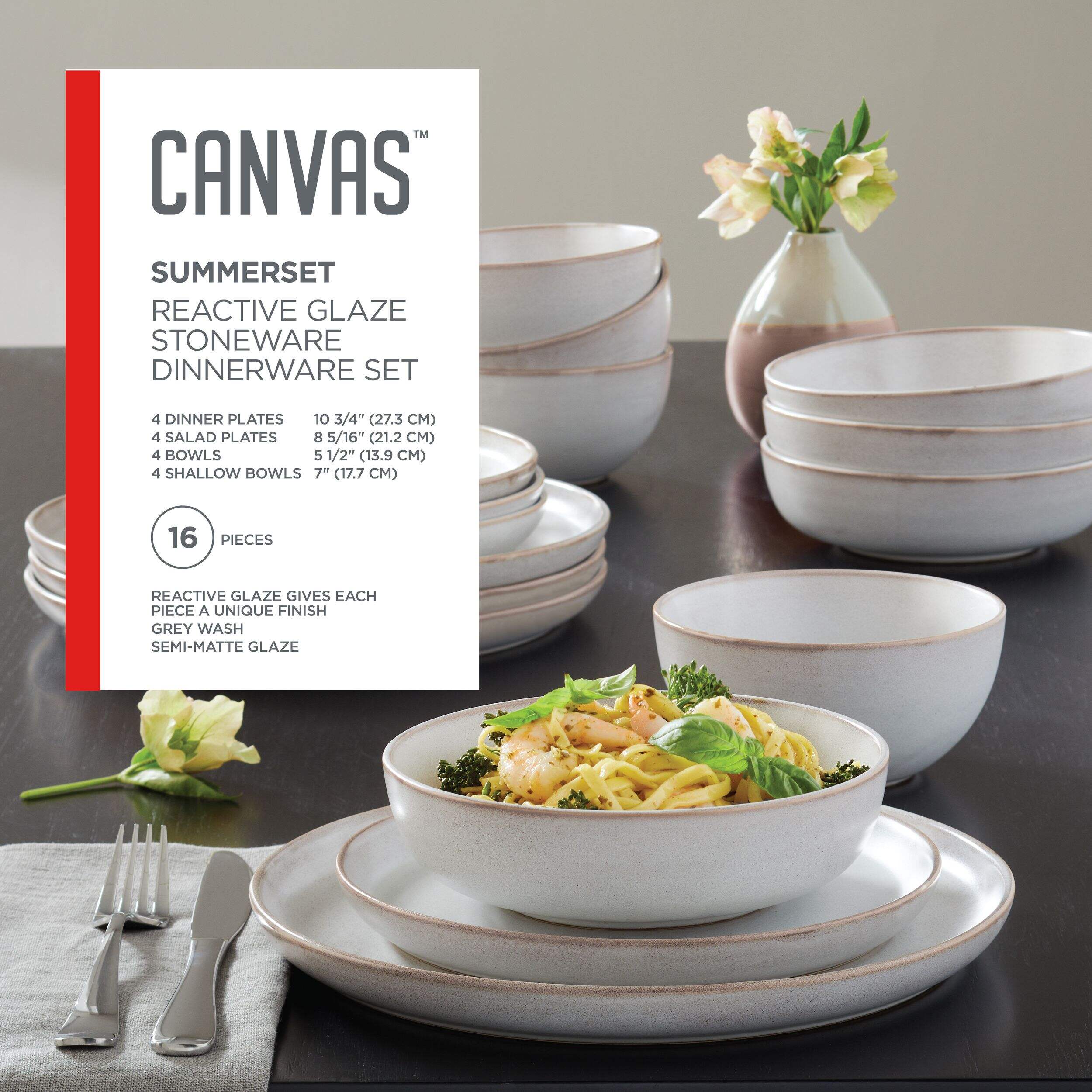 Make every mealtime stylish with the CANVAS Reactive Glaze 16-Piece Dinnerware Set. Each piece boasts a one-of-a-kind look, adding natural charm and a touch of elegance to any table setting. The set includes four dinner plates, four salad plates, four cereal bowls, and four dinner bowls, providing service for four. Whether you're hosting a dinner party or enjoying a family meal, this dinnerware set is durable and convenient for daily use.