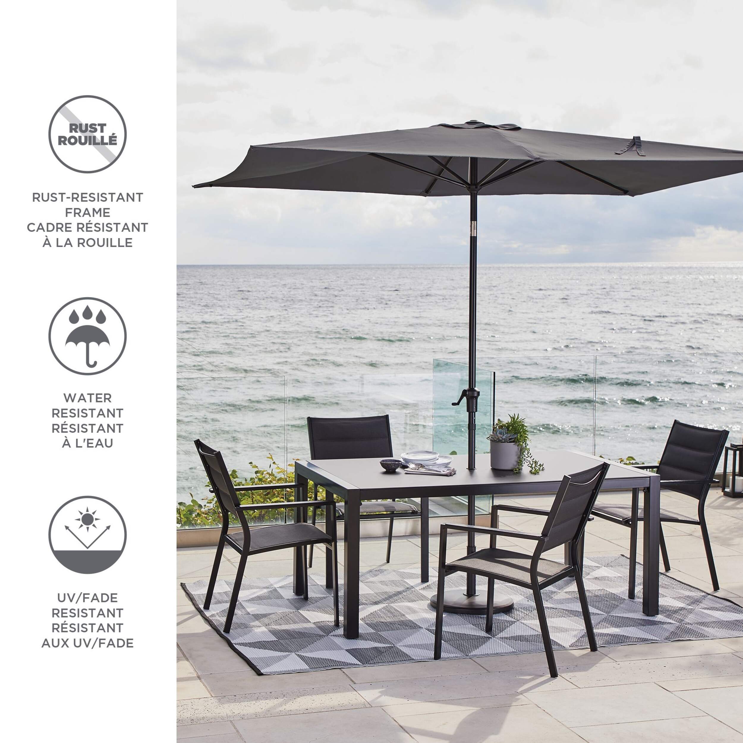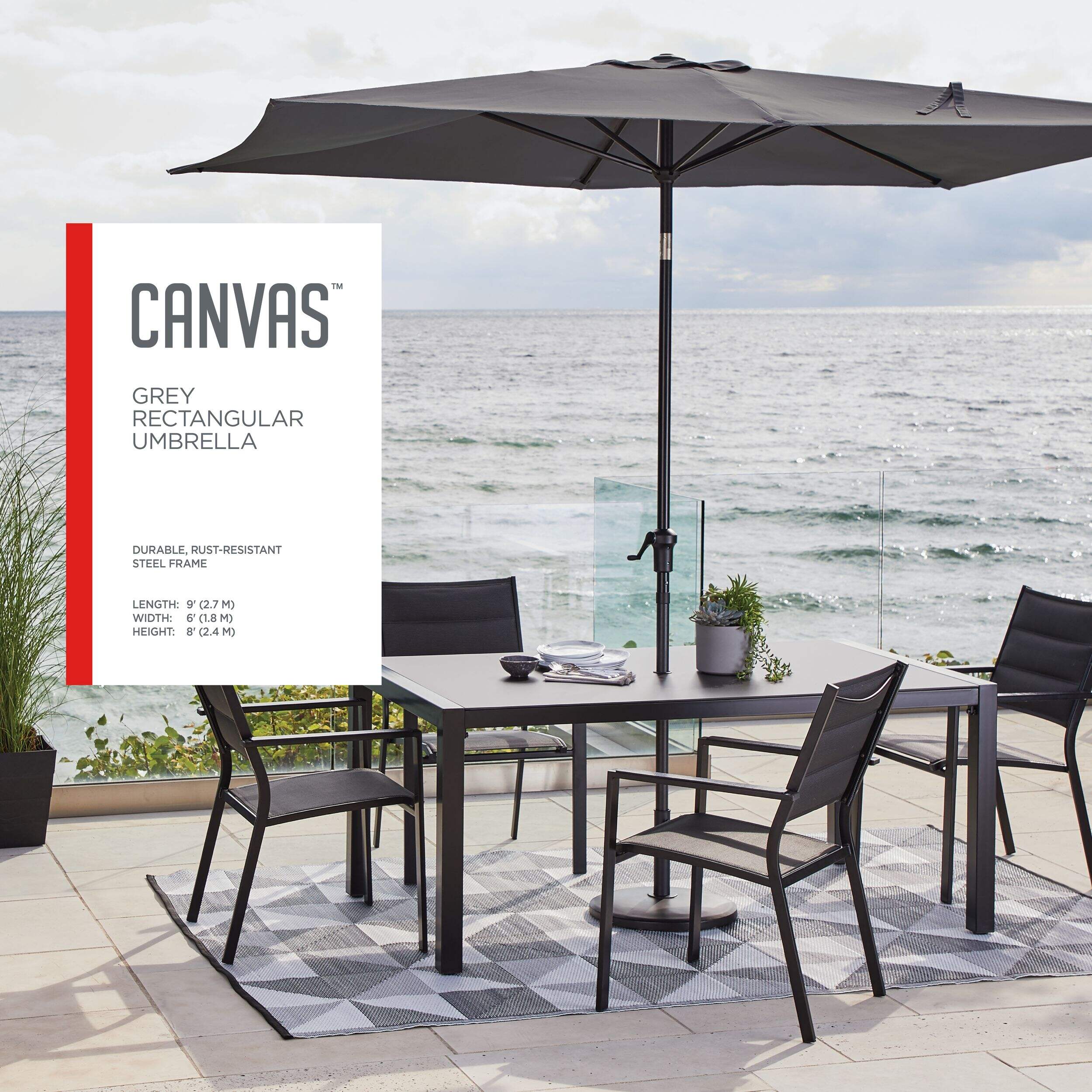 The CANVAS Rectangular Patio Umbrella combines functionality and style to enhance your outdoor spaces. Featuring a durable, rust-resistant steel frame, it offers a tilt function for customizable shade. The rain-resistant polyester canopy resists fading from sun exposure, while the crank handle ensures effortless operation. Complete with a Velcro strap for secure storage and a fabric carrying bag for portability, this umbrella is perfect for patios, decks, and gardens.