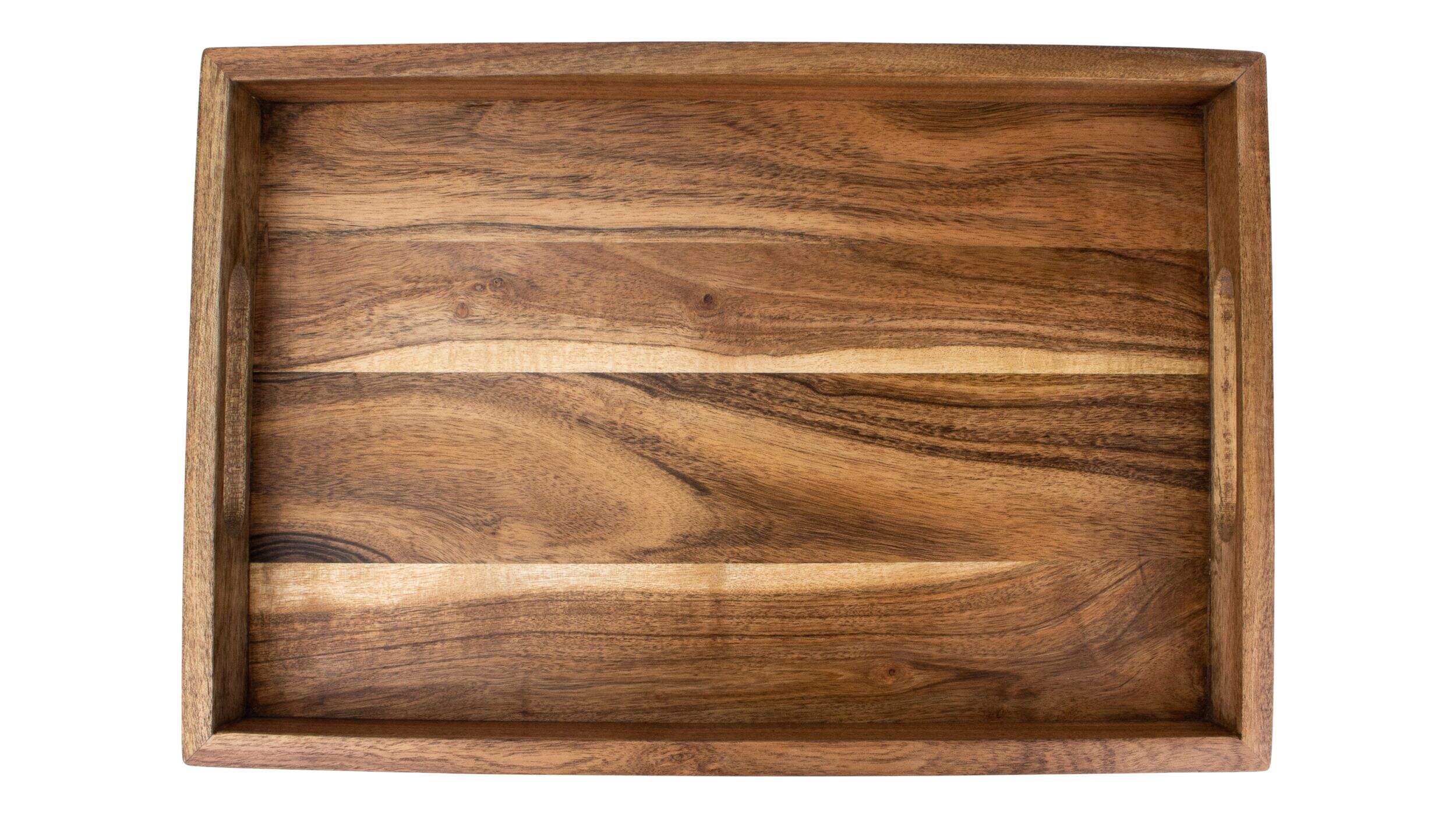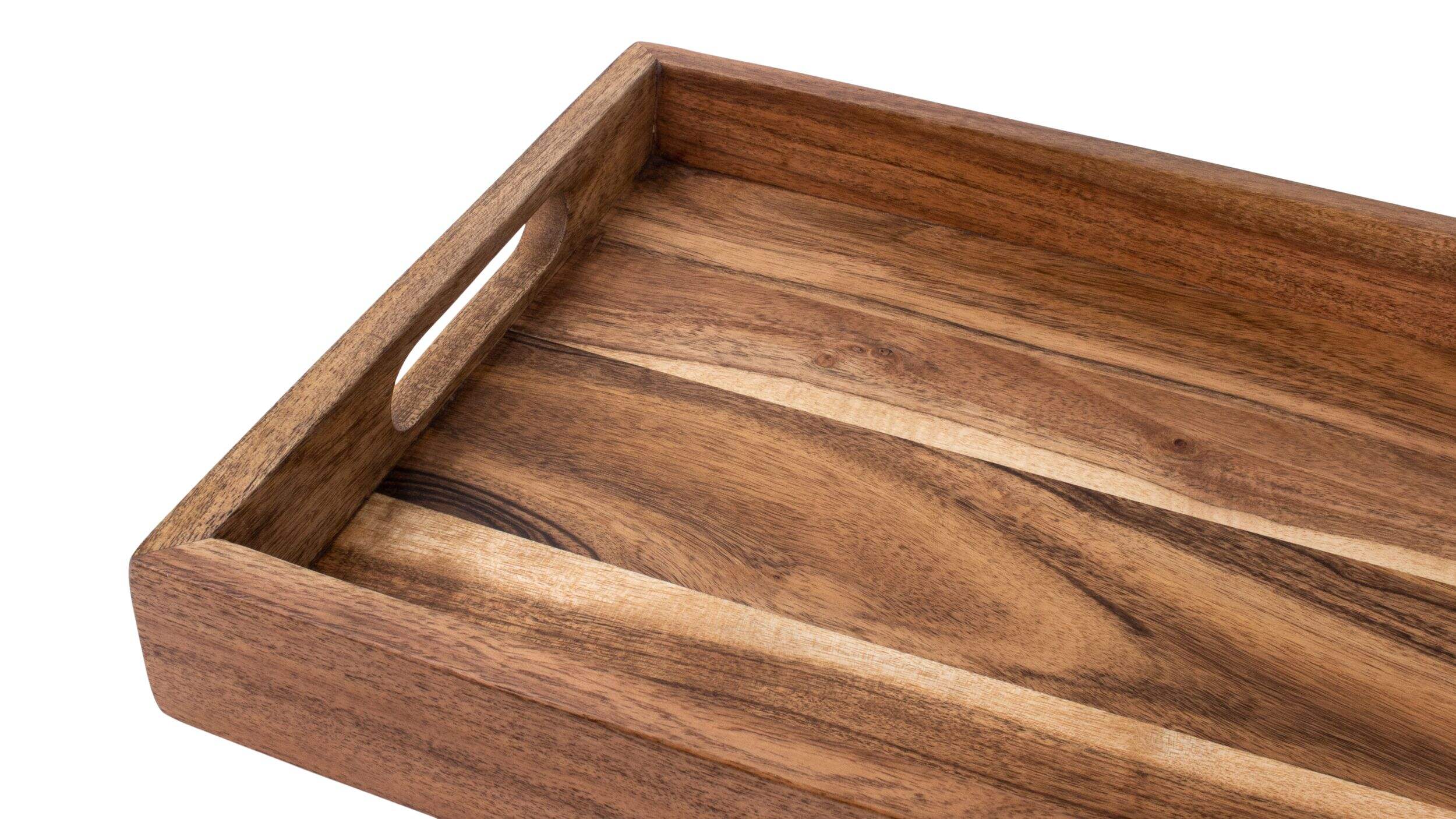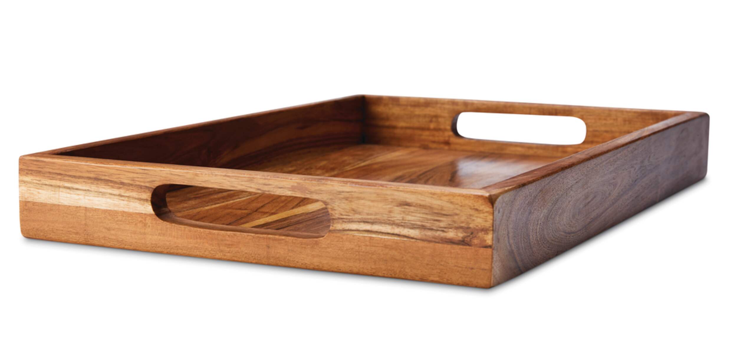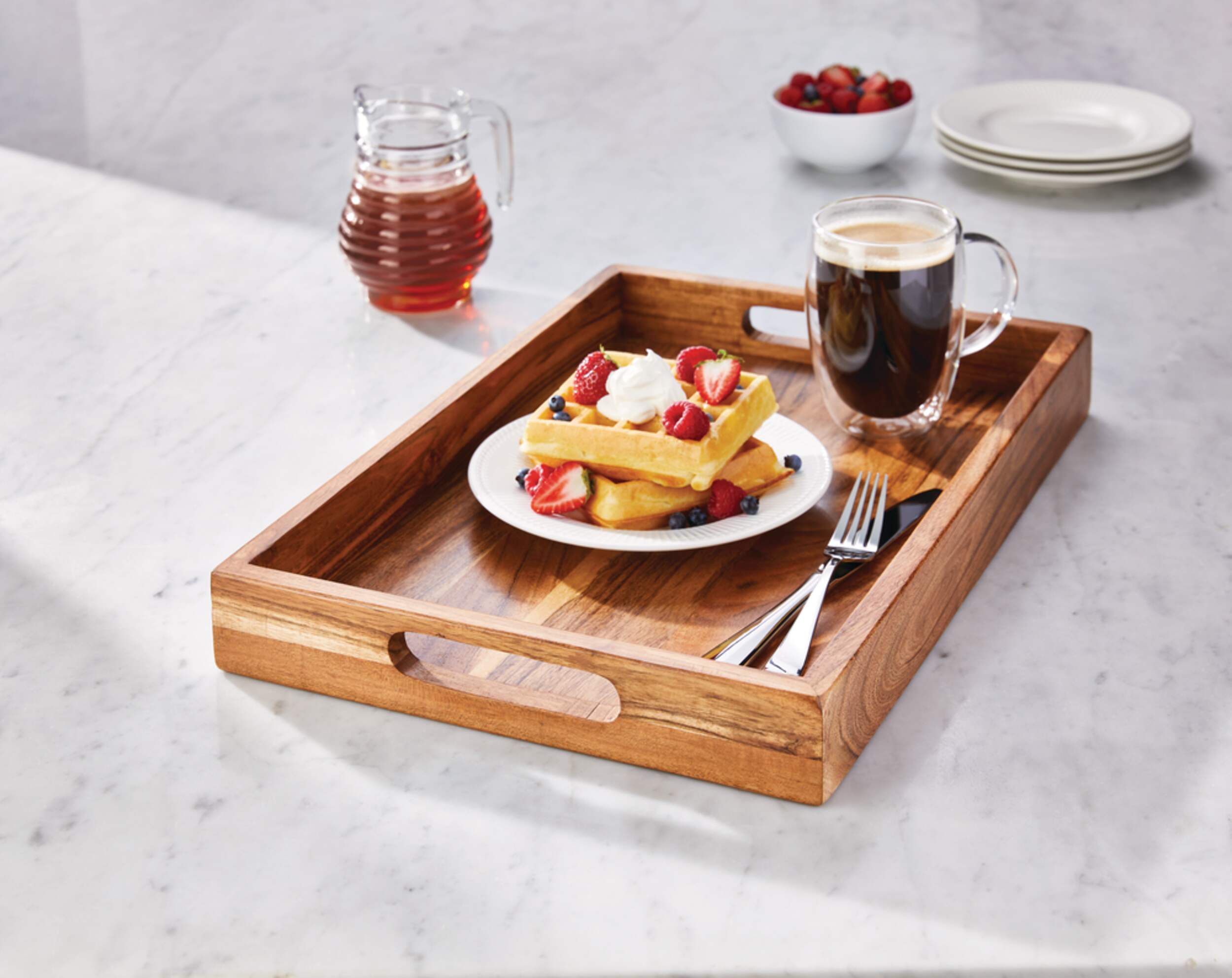 CANVAS Rectangular Wood Serving Tray is a strong and easy to carry wooden serving tray that is perfect for serving small platters, snacks, and appetizers. Made with high quality Acacia wood, this serving tray is also designed with round handles that let you carry your food to the table easily. 1-year warranty included.