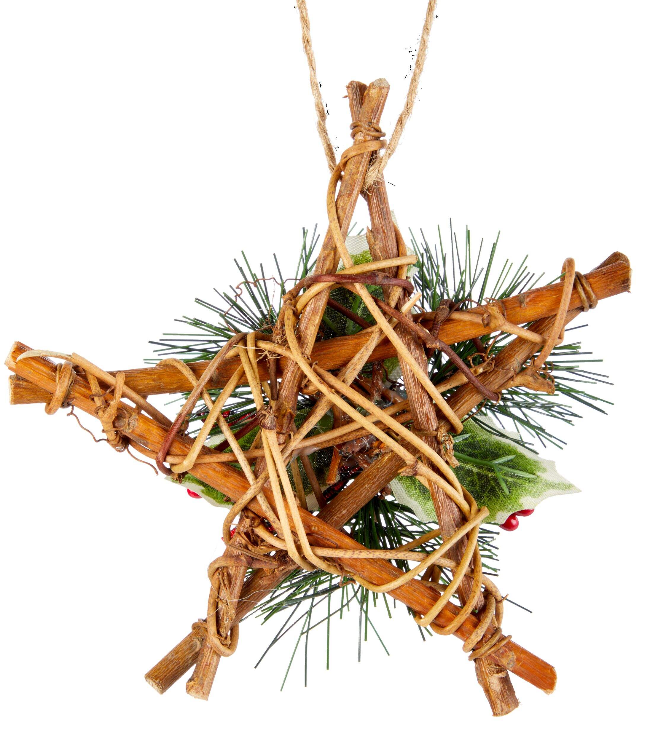 Features a five-pointed wooden star adorned with leaves and holly berries