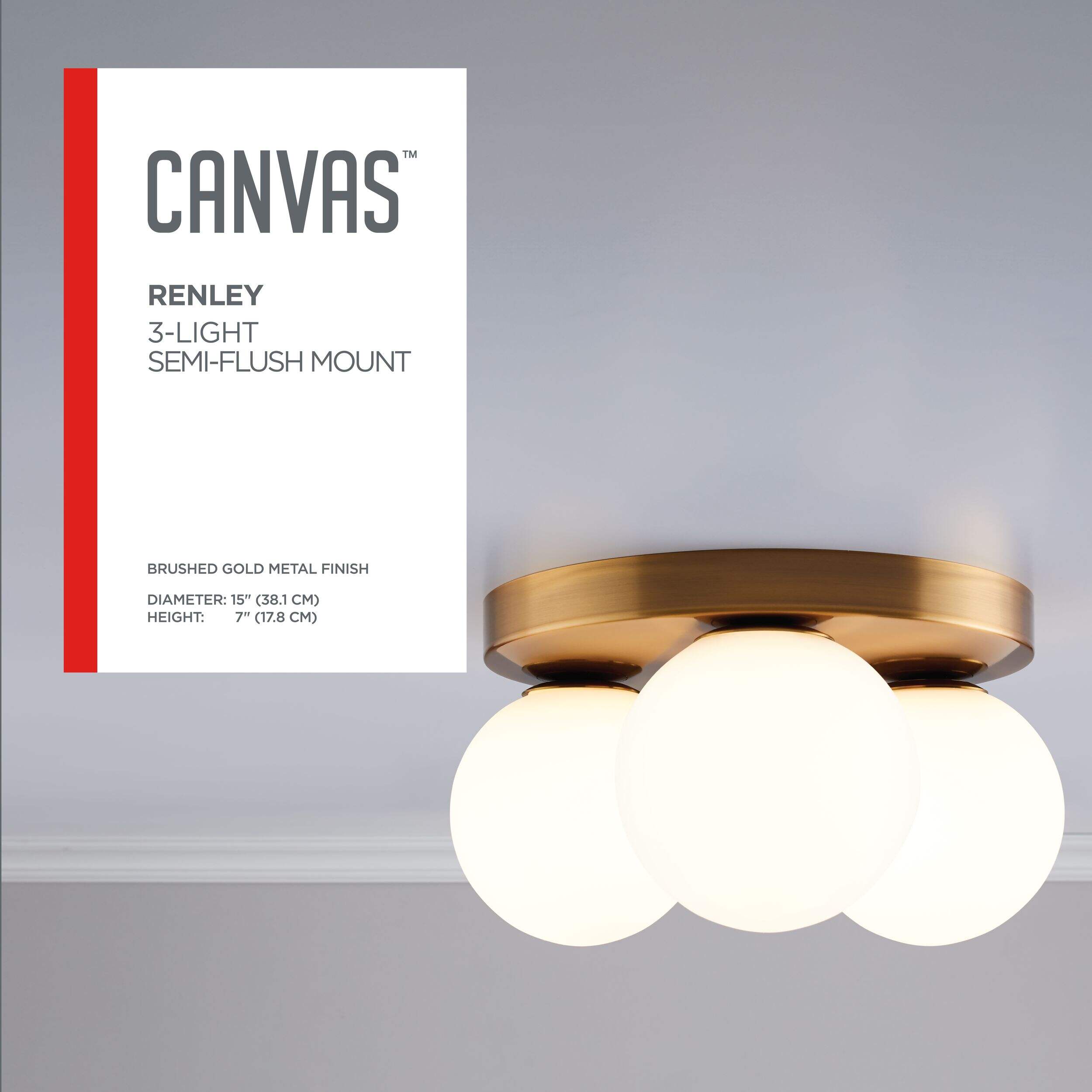 The CANVAS Renley 3-Light Semi-Flush Mount transforms any space with its stylish design and modern elegance. This fixture brightens up rooms effortlessly, making it an excellent choice for a home office, bedroom, or small entryway. Its brushed gold metal mount complements the opal glass globes, offering a sleek appearance that enhances your home decor. Ideal for blending style and practicality, this semi-flush mount light creates a warm, inviting glow in any space.