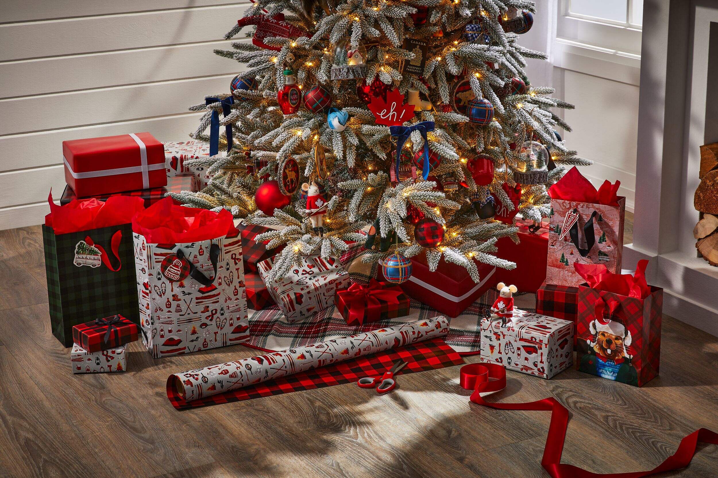 Patterns include red plaid and traditional Canadian winter symbols