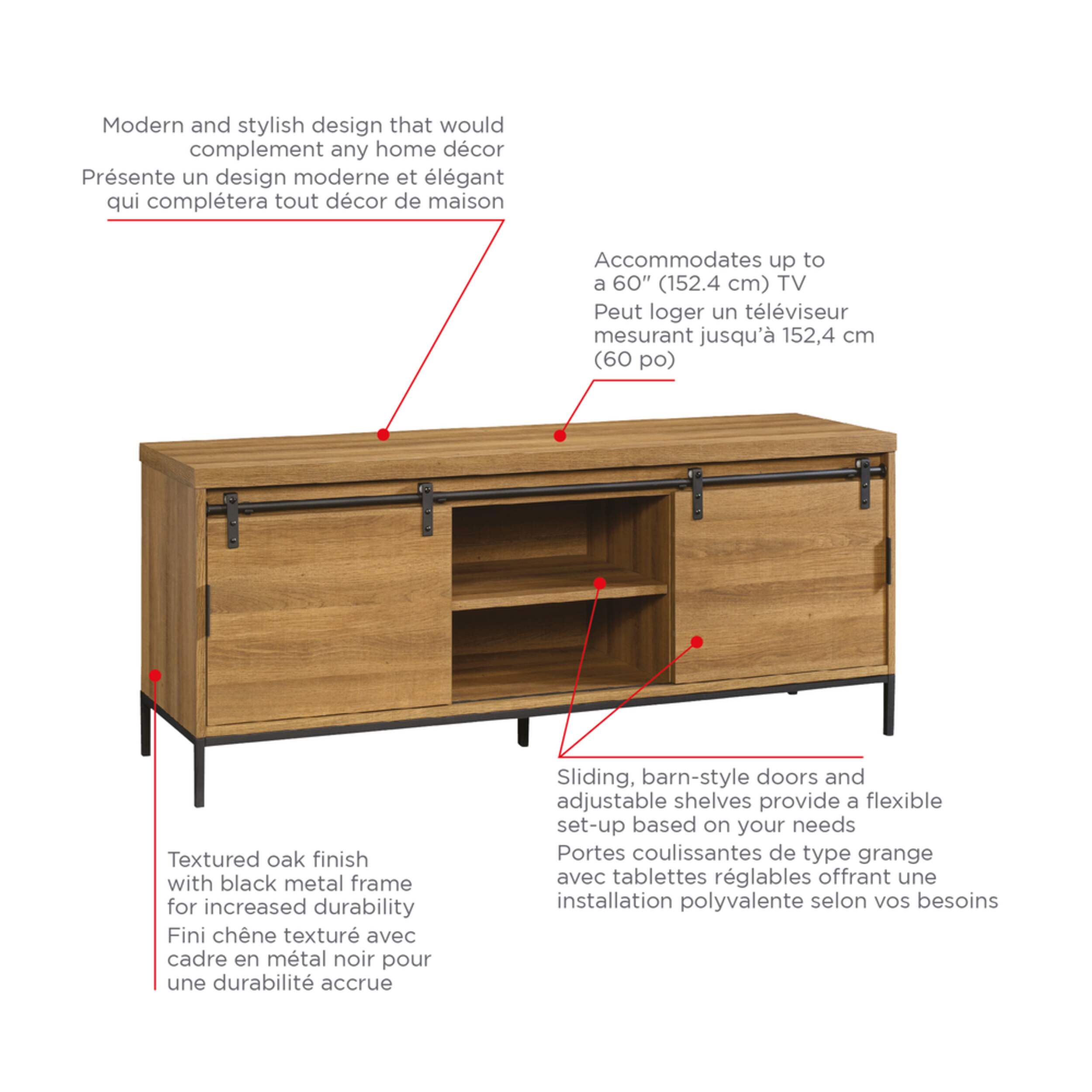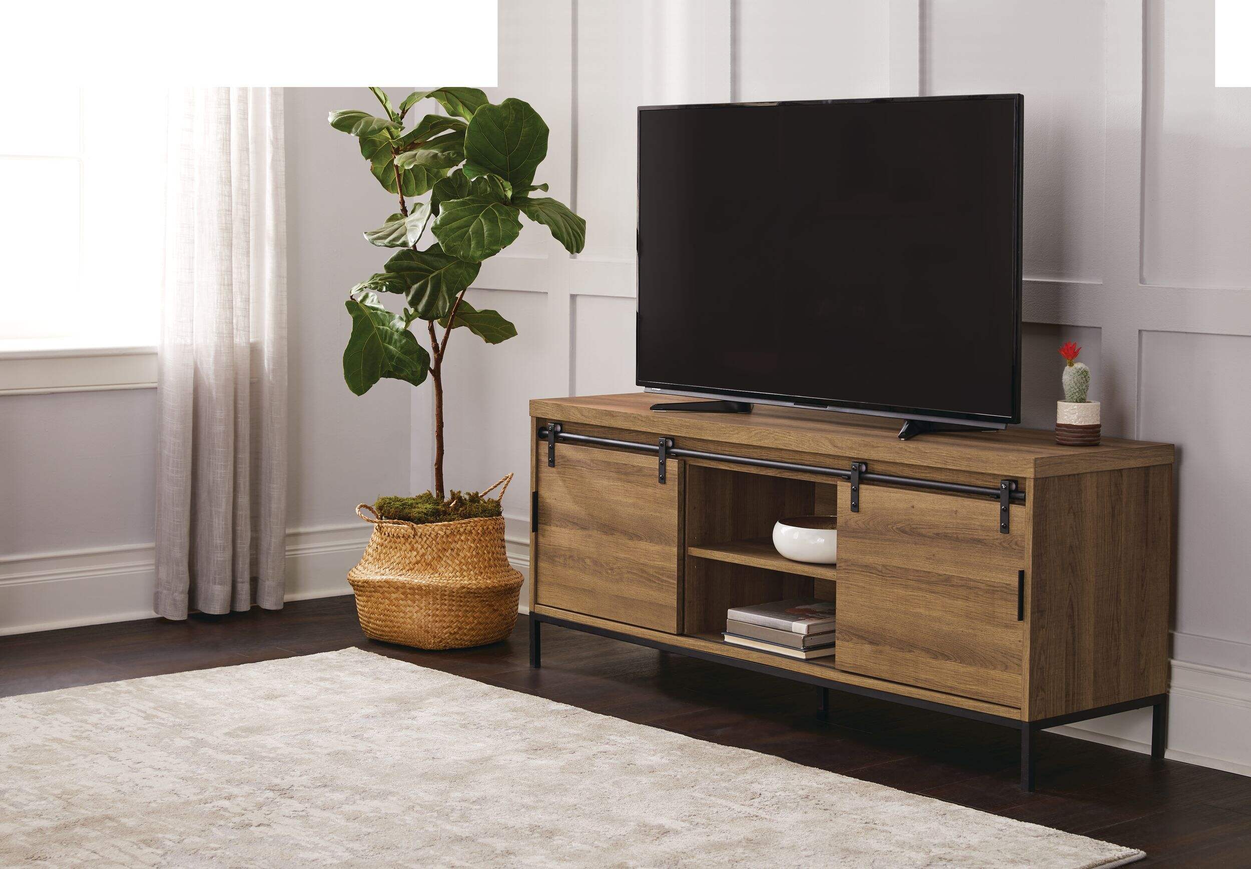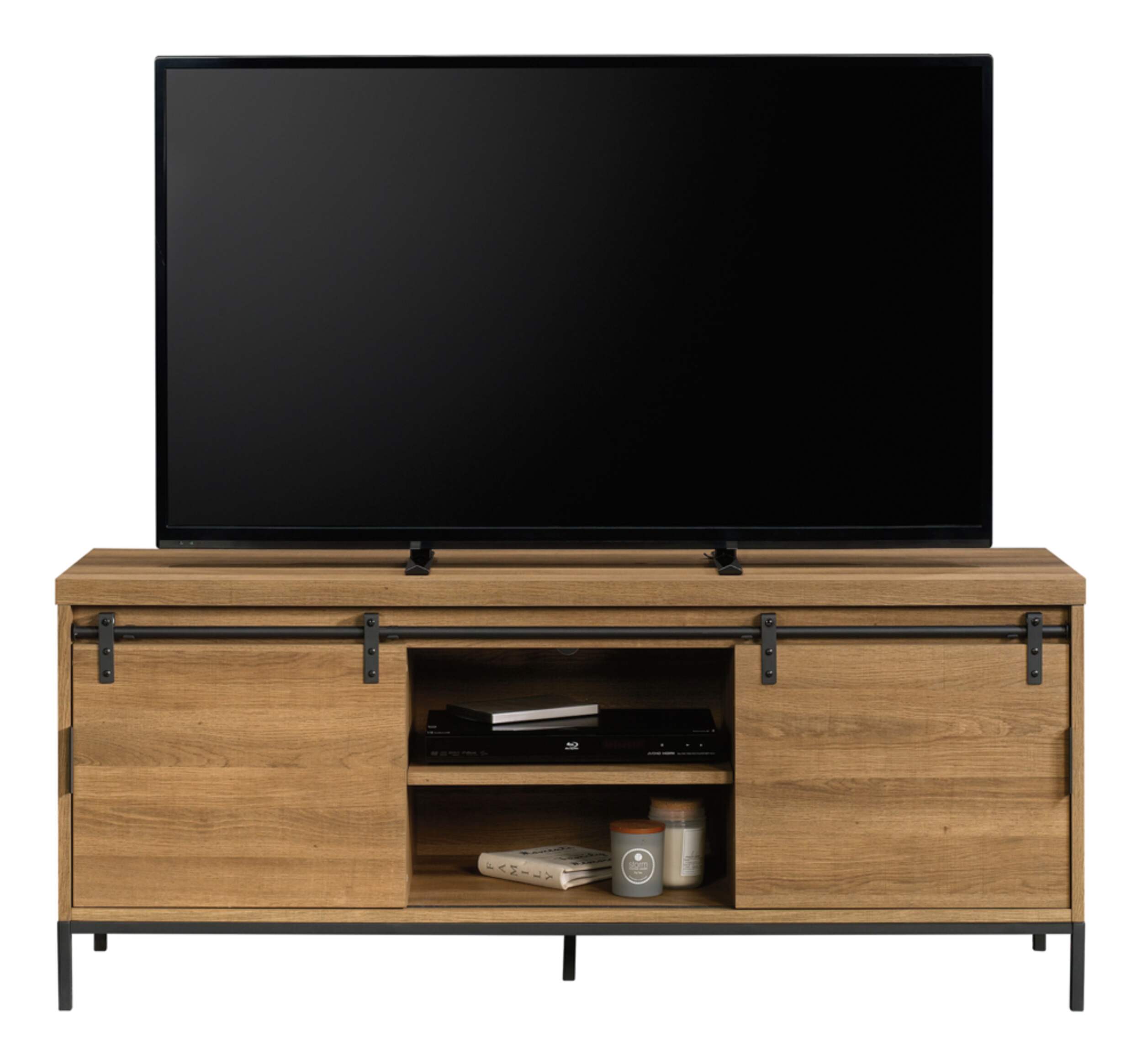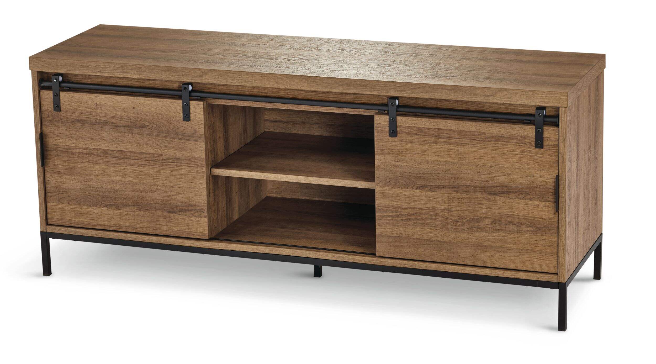 Built on a black metal frame, this contemporary CANVAS Robson 2-Door Open Shelf TV & Media Stand will support your 60-inch or smaller television, as well as all of the accessories that go with it. This engineered wood TV stand has a total of four compartments – two cupboards and two shelves – providing space for a DVD player and gaming unit, plus a collection of movies and games. Two trendy sliding barn-style doors on a metal rail make it easy to access your entertainment pieces, and leave one open space available for you to show off your favourite books or décor items. Designed for durability, this modern media console has a handsome textured oak finish. This simply-styled piece of furniture will make a great addition to your living room or family room. It coordinates perfectly with other furniture pieces from the Robson collection for a cohesive look in your living space.
