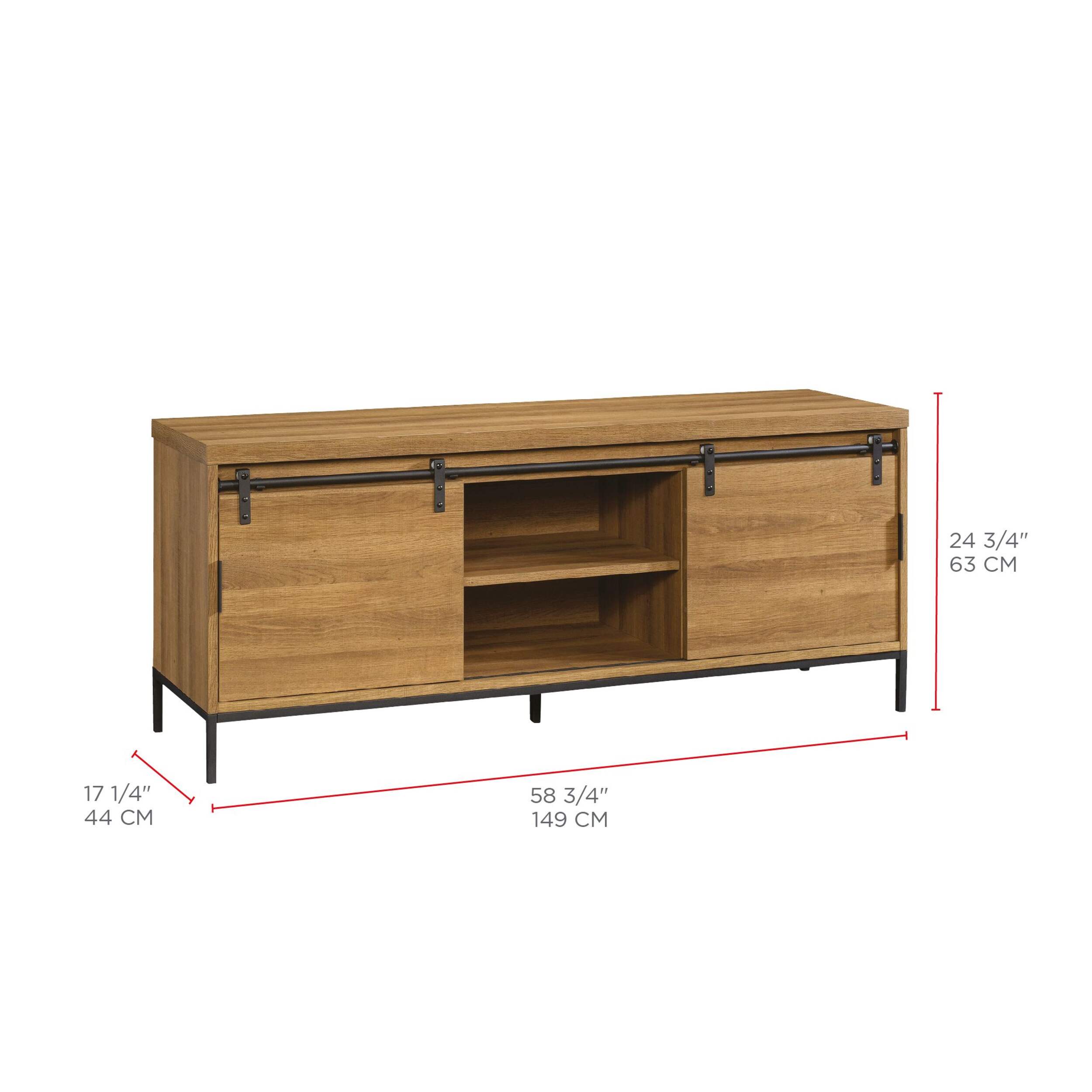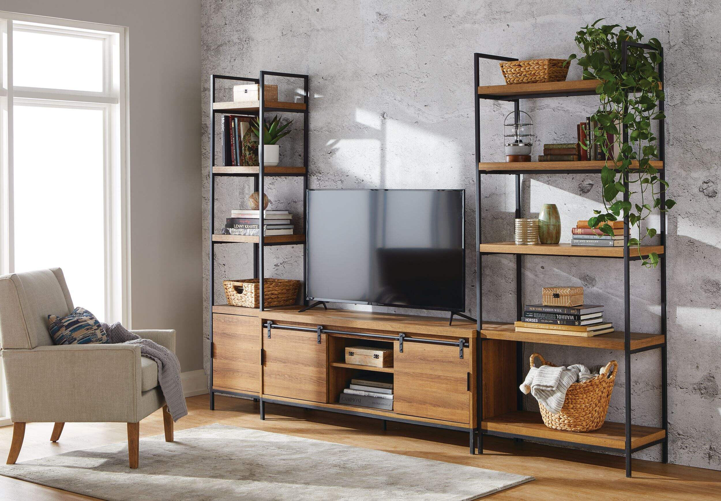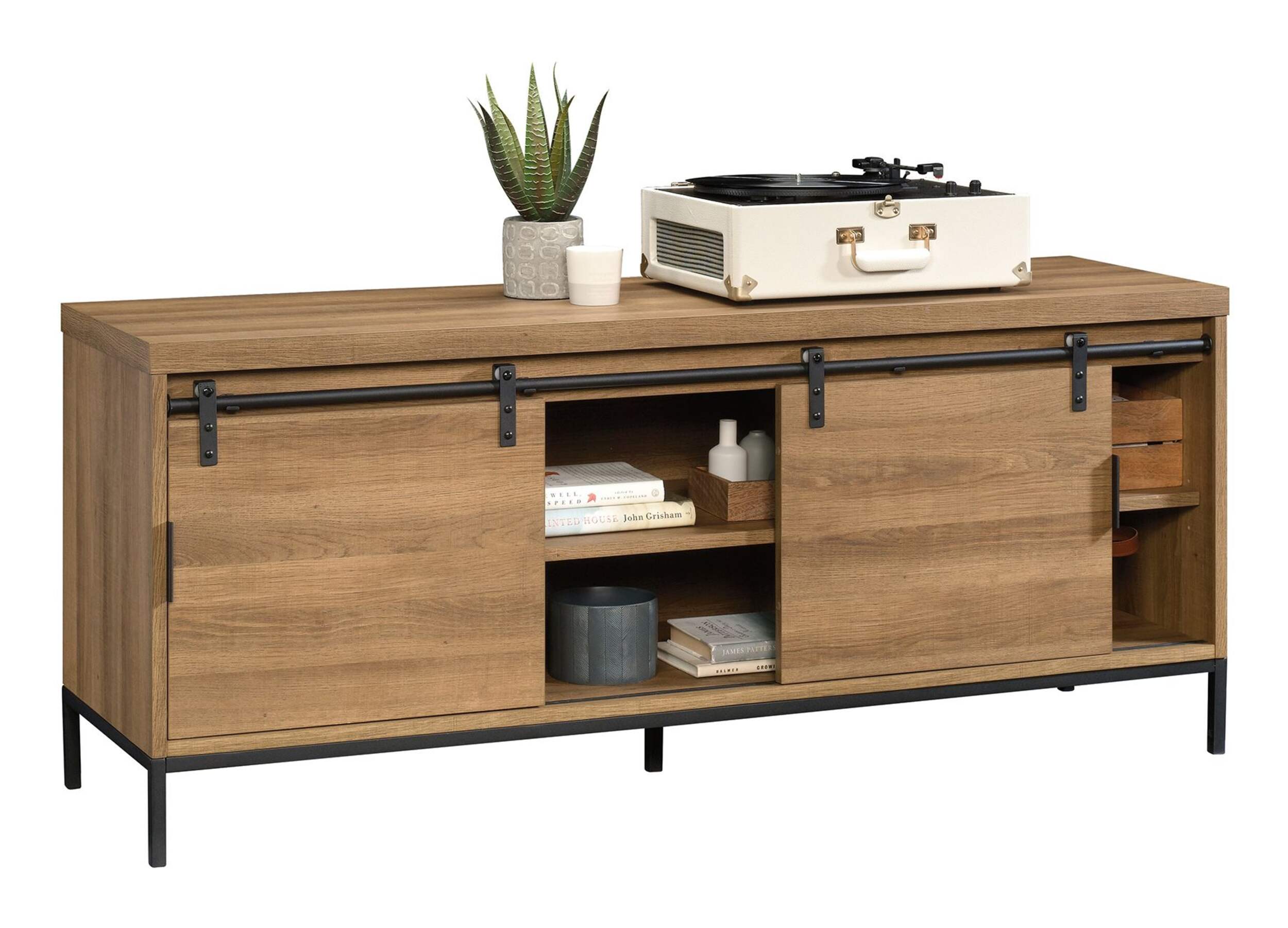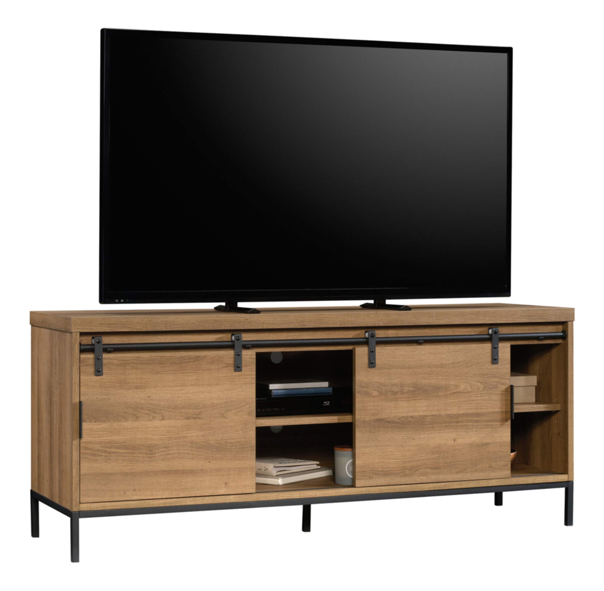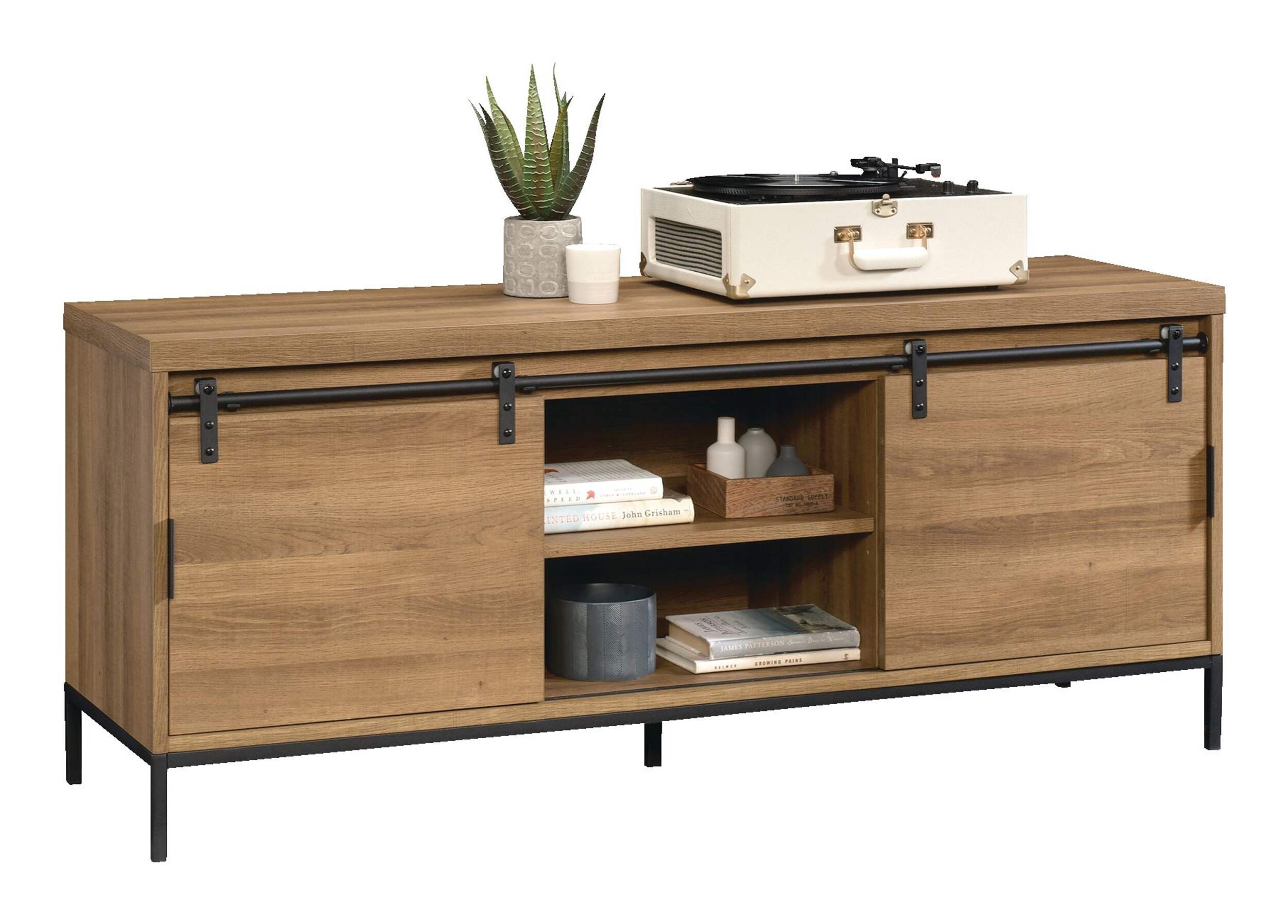 Built on a black metal frame, this contemporary CANVAS Robson 2-Door Open Shelf TV & Media Stand will support your 60-inch or smaller television, as well as all of the accessories that go with it. This engineered wood TV stand has a total of four compartments – two cupboards and two shelves – providing space for a DVD player and gaming unit, plus a collection of movies and games. Two trendy sliding barn-style doors on a metal rail make it easy to access your entertainment pieces, and leave one open space available for you to show off your favourite books or décor items. Designed for durability, this modern media console has a handsome textured oak finish. This simply-styled piece of furniture will make a great addition to your living room or family room. It coordinates perfectly with other furniture pieces from the Robson collection for a cohesive look in your living space.
