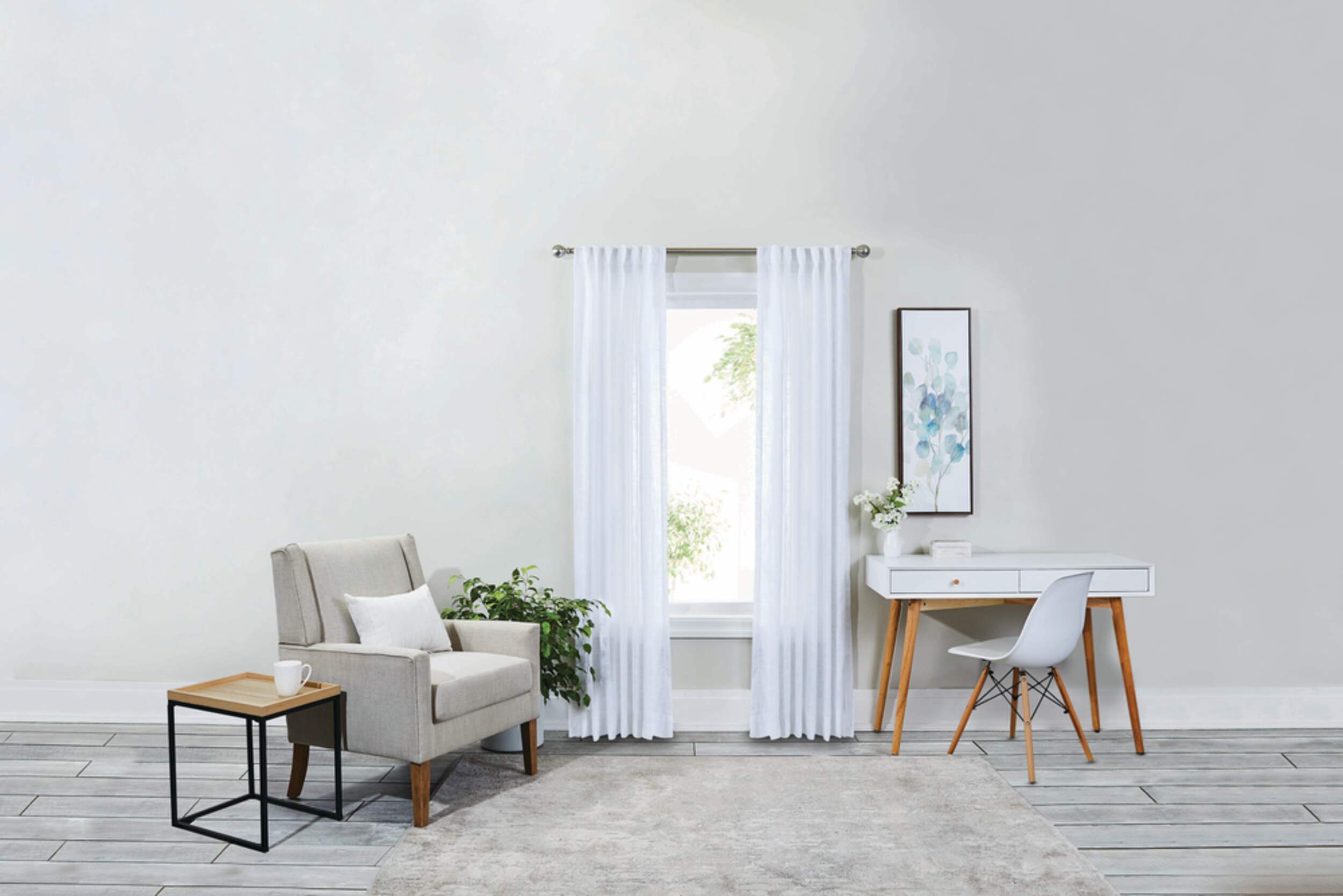 Elevate your indoor space with the CANVAS Semi Sheer Bella Textured Linen Window Curtain, White, 54-in x 84-in, 2-pk. These high-quality linen curtains add an elegant touch to any décor. Its soft-woven construction and white colour provide a beautiful look. The light-filtering curtains allow ample light to seep through and keep your space bright. The curtains feature a solid colour textured linen look with a grommet top for easy hanging. The semi-sheer curtains measure 54 x 84 inches (137 x 213 cm) and come with 2 panels per pack.