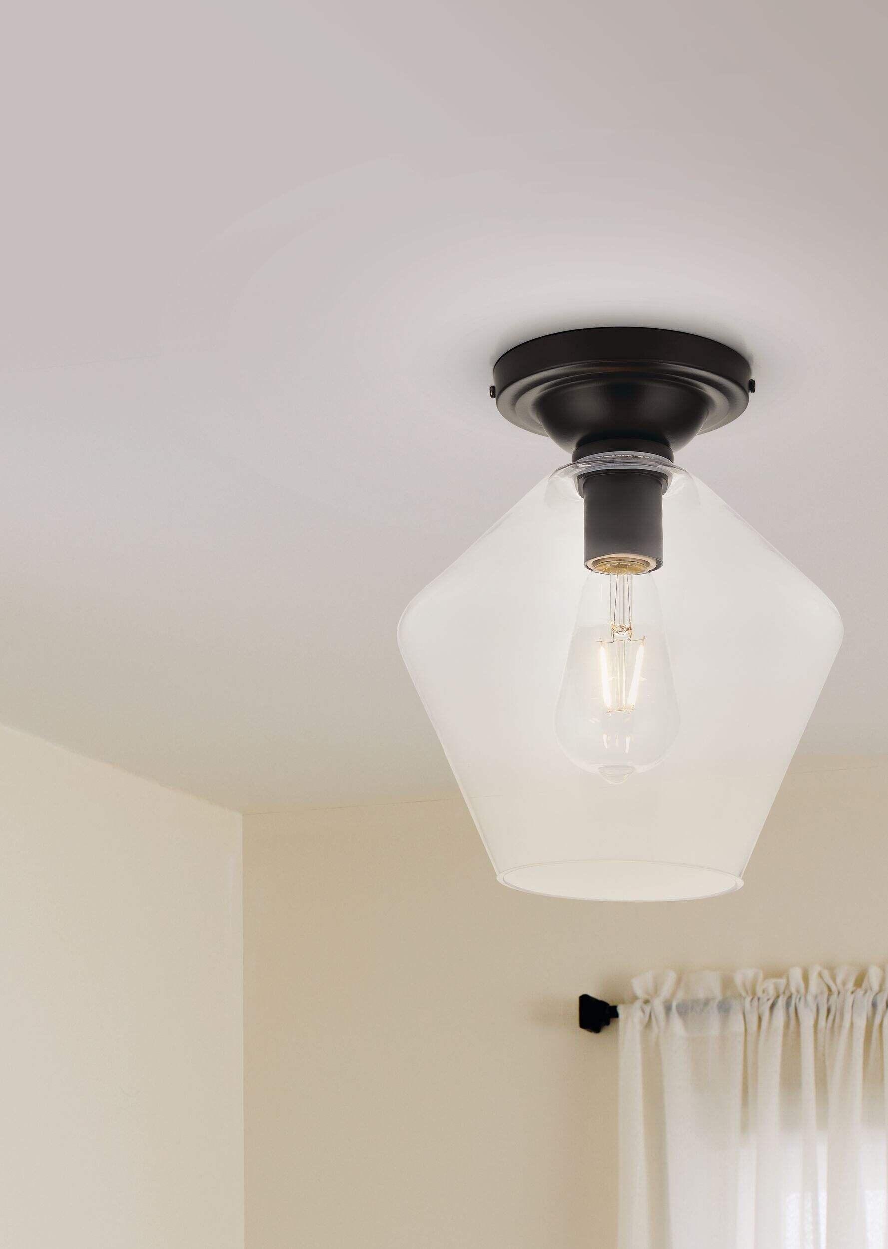 The CANVAS Spencer 1-Light Decorative Flush Mount Ceiling Light Fixture features a sophisticated brushed black metal finish that complements various decors. With a clear glass shade and slim profile, it offers high efficiency and a colour temperature range from 2700K to 5000K. This energy-saving fixture boasts a long lifespan of up to 50,000 hours and is ETL qualified. It includes all mounting hardware for quick, easy installation, requiring one 60W max A19 or ST19 shape E26 bulb base (not included).
