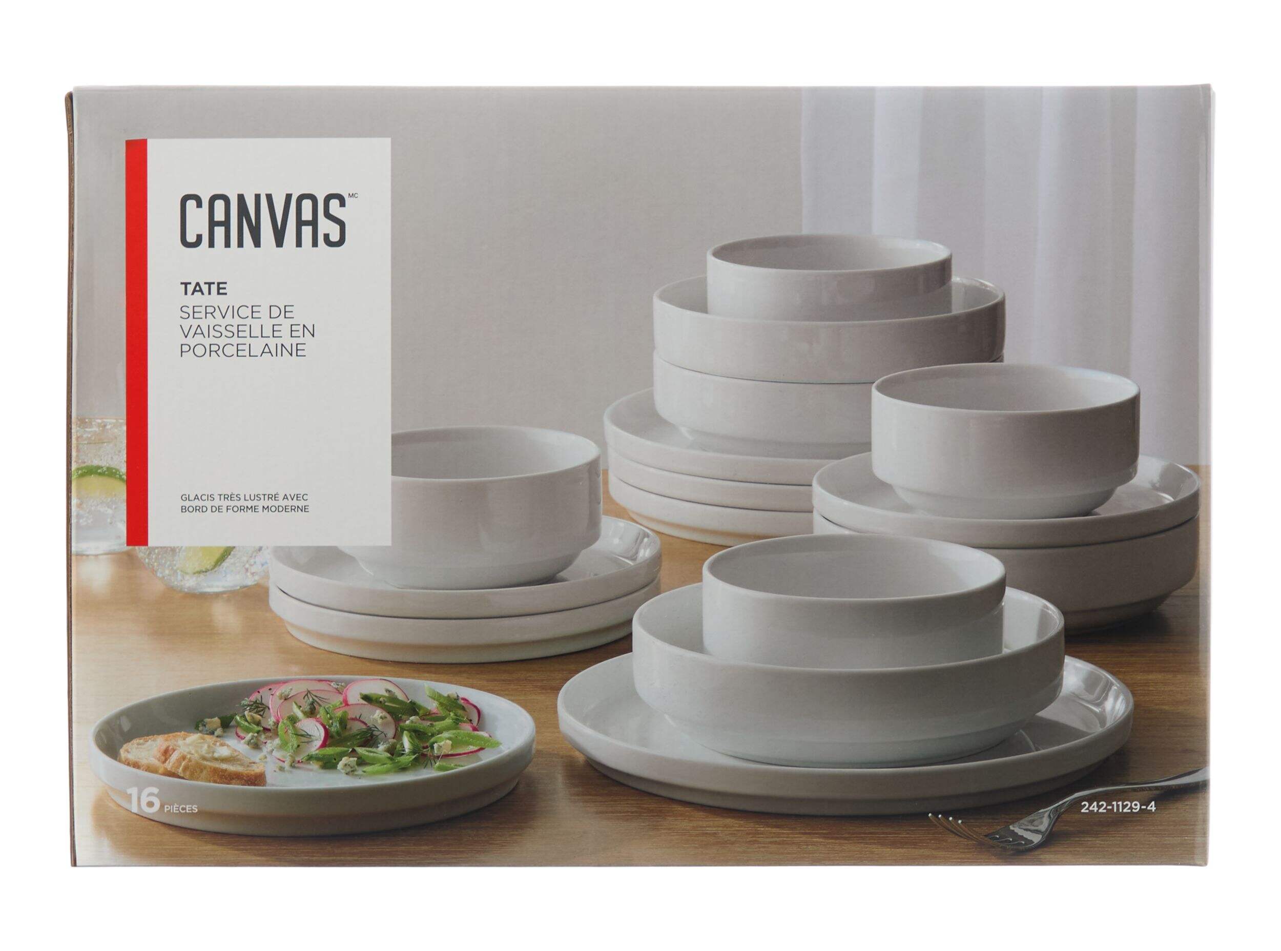 The CANVAS Tate Modern Edge Porcelain Dinnerware Set includes 16 high-quality pieces for serving four people. Made from durable porcelain, this elegant and modern set features raised edges for convenient stacking and compact storage.