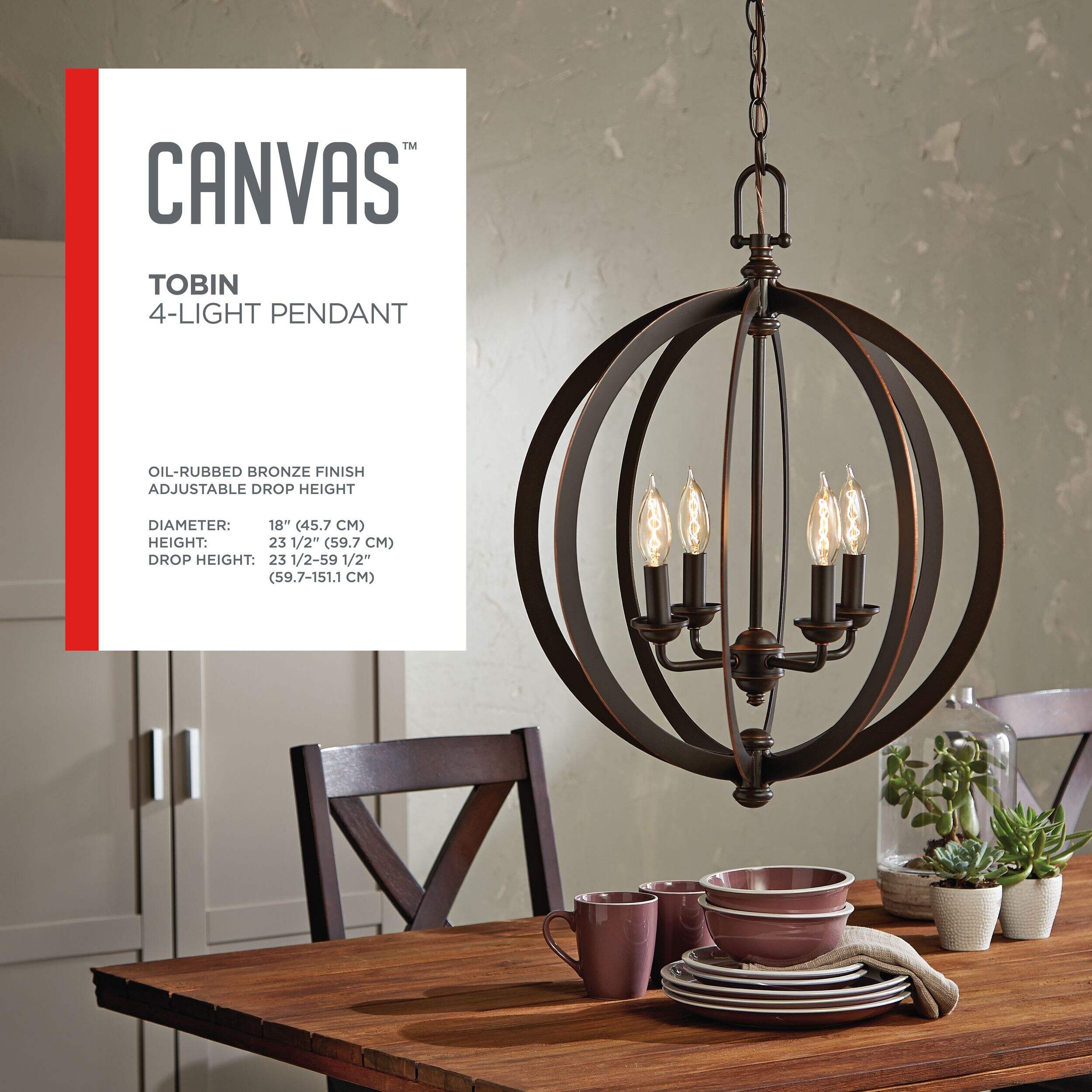 The CANVAS Tobin 4-Light Ceiling Pendant Light Fixture brings a refined touch to any room. This pendant light fixture creates a warm, inviting atmosphere perfect for dining rooms, kitchens, or entryways and it offers ample lighting for gatherings or daily use. Installation is simple with included hardware, and the adjustable height ranges from 23.5-in to 59.5-in to suit your room's needs. Bulbs are sold separately, and a qualified installer is recommended for safety.