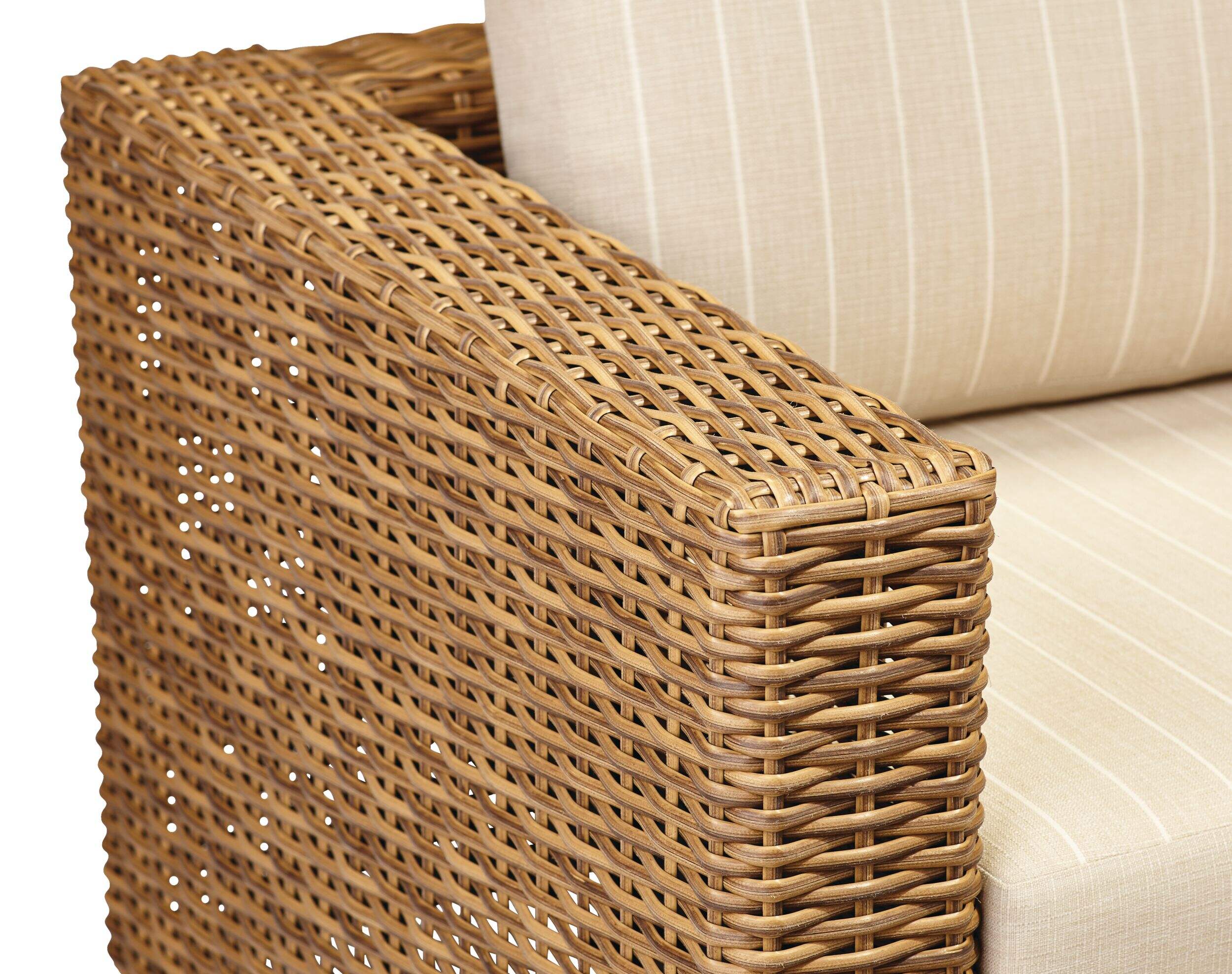 CANVAS Tofino Collection Sectional Patio Armchair features a handwoven, wheat coloured, all-weather wicker texture for a natural look