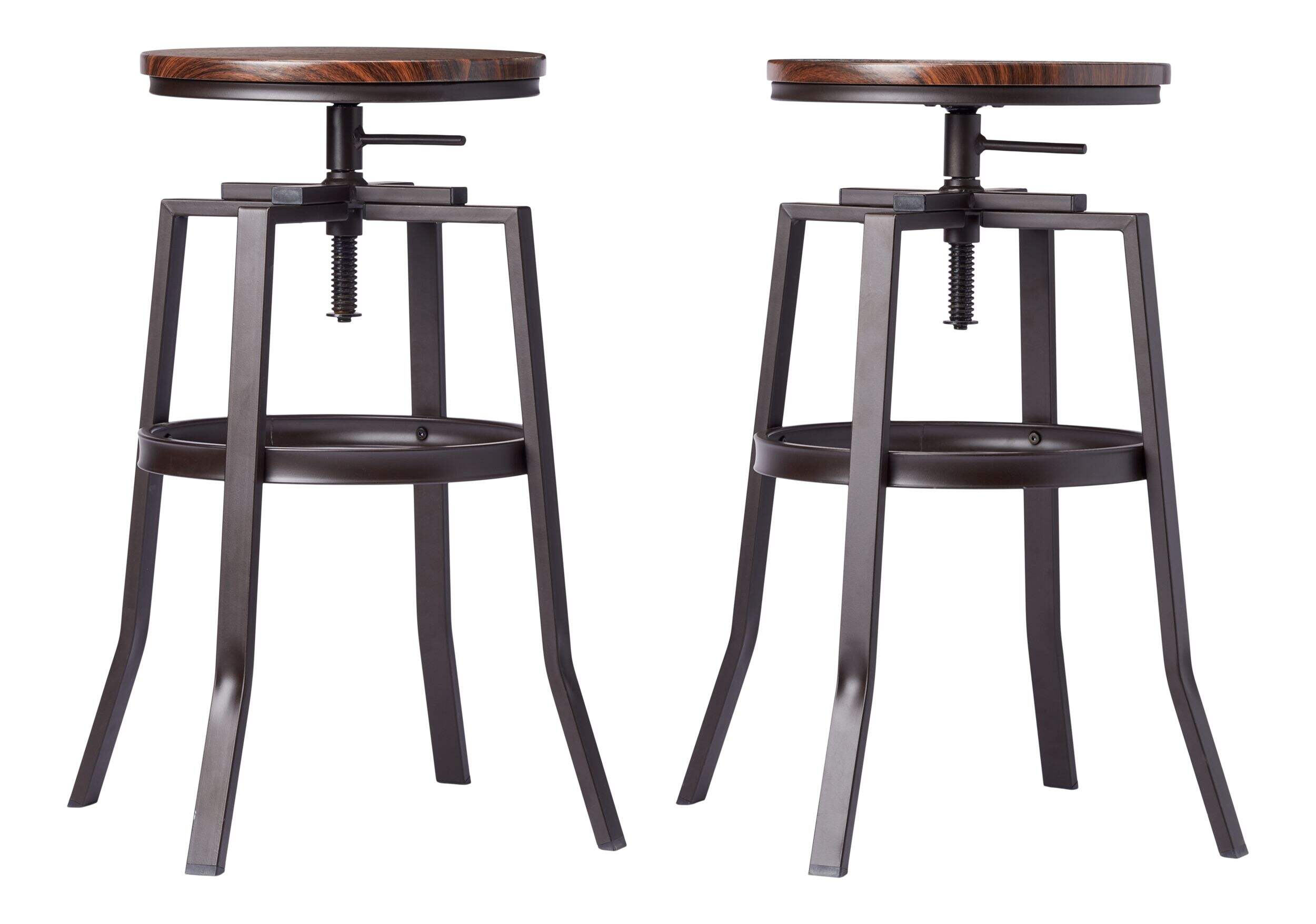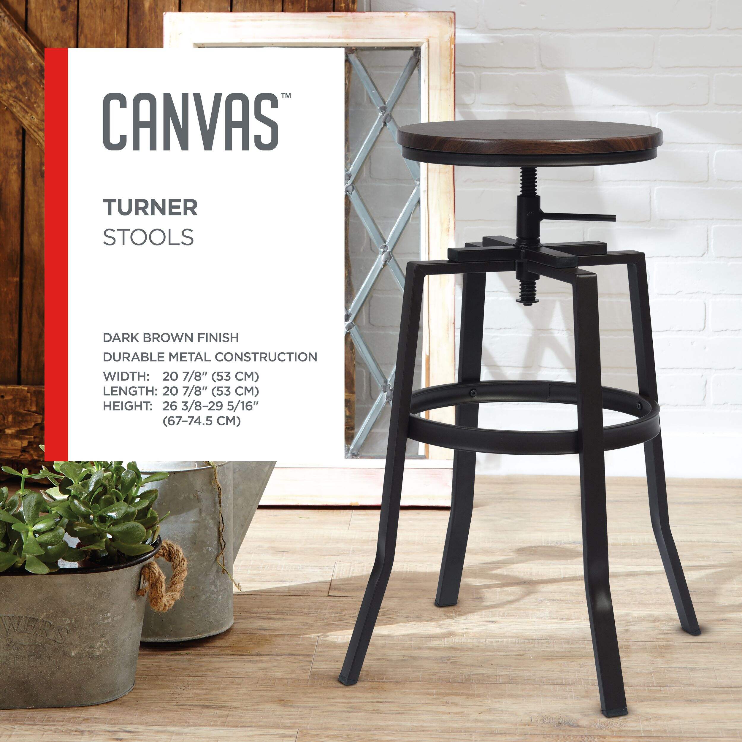 Complement your home decor with this elegant set of CANVAS Turner Bar Stools. These sturdy bar stools feature a metal frame that can hold up to daily wear and tear with ease. They are adjustable to help tailor your sitting height while the swivel feature allows easy turning as you hop on and off. Thanks to their sleek, space-saving design, these durable bar stools can be easily tucked away when not in use.