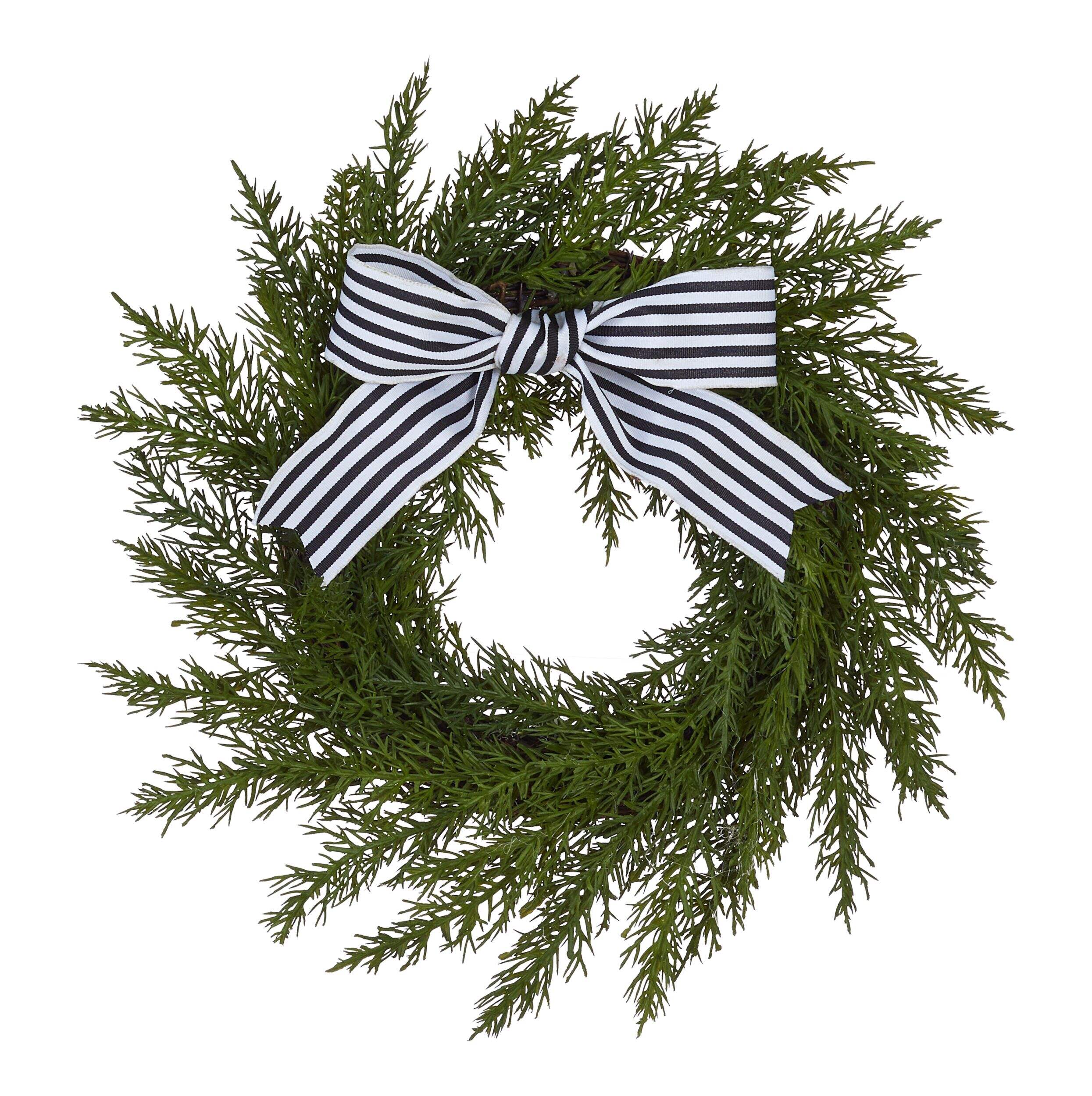 Enhance your holiday decoration with the charming CANVAS Un-Lit Cypress Mini Wreath. This delightful mini wreath features a stylish black and white bow, adding a touch of elegance to your festive wreath decorations. Perfect for indoor use, this elegant holiday wreath brings a festive spirit to any room.