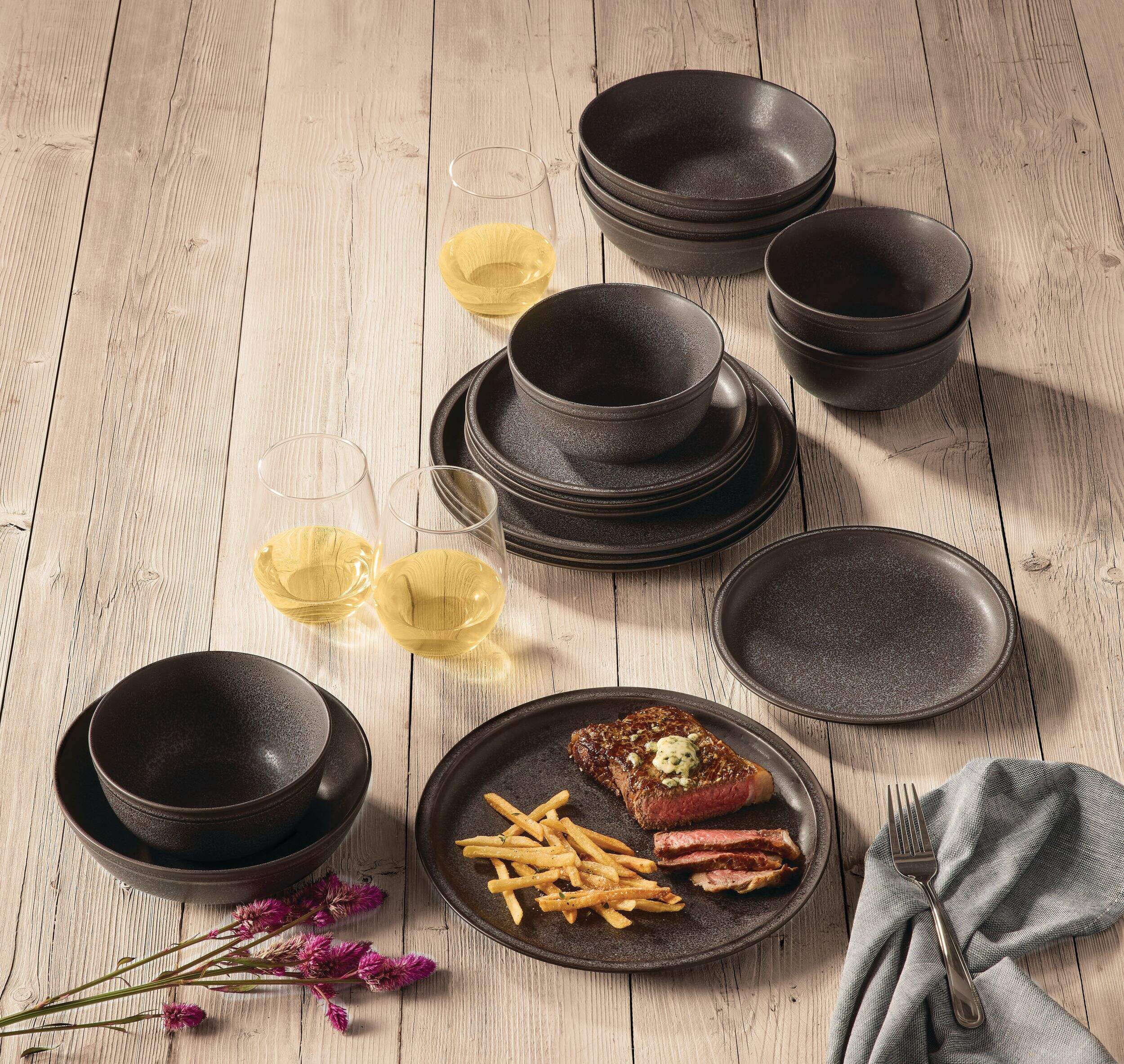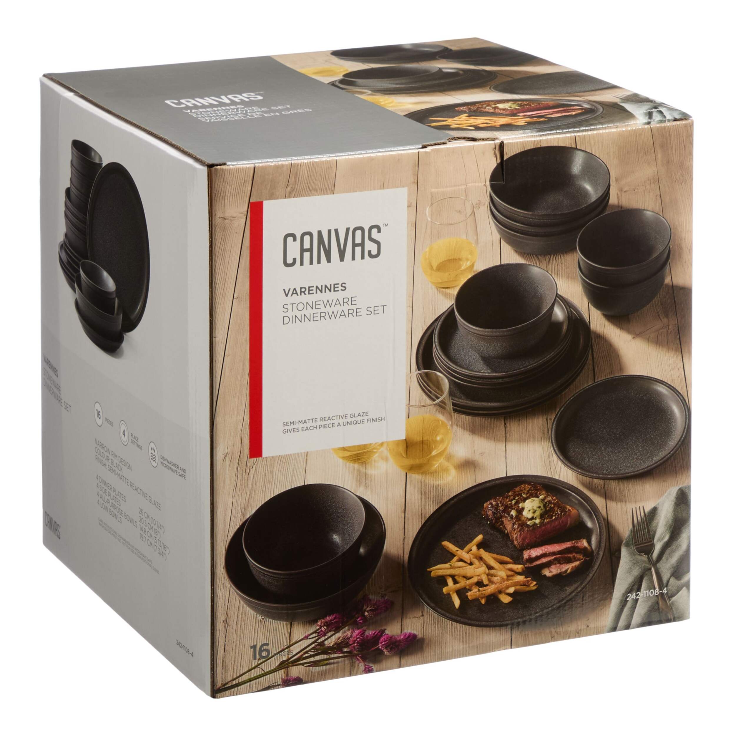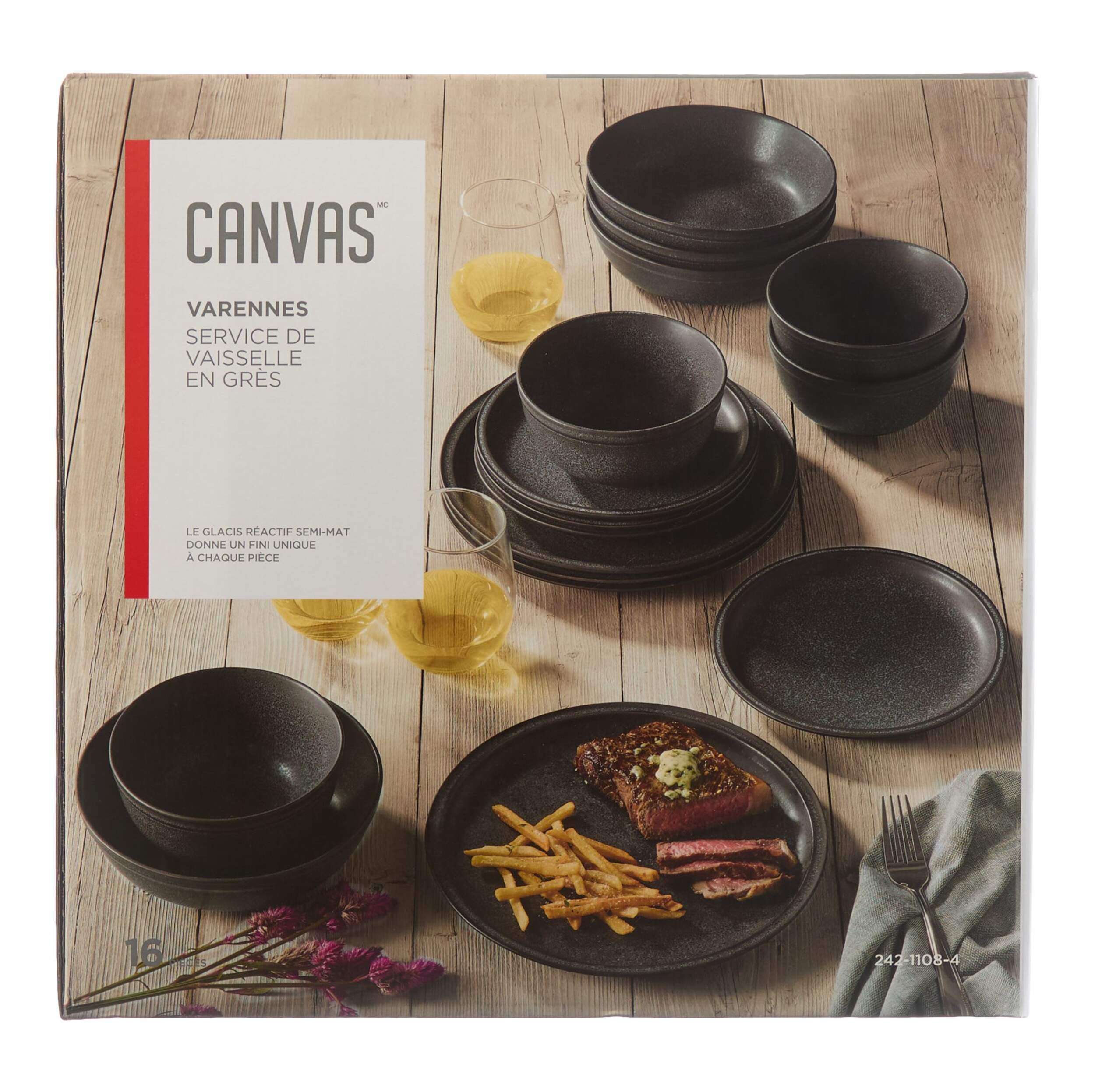 The CANVAS Varennes Stoneware Dinnerware Set brings a touch of modern elegance to your dining table. This 16-piece set, featuring a stunning black reactive glaze, serves four and includes dinner plates, salad plates, bowls, and mugs. Each piece is crafted from durable stoneware, ensuring long-lasting use and resistance to chipping. The reactive glaze finish creates unique variations in colour and texture, making each piece one-of-a-kind. Perfect for both everyday meals and special occasions, this set is microwave and dishwasher safe, offering convenience and easy maintenance.