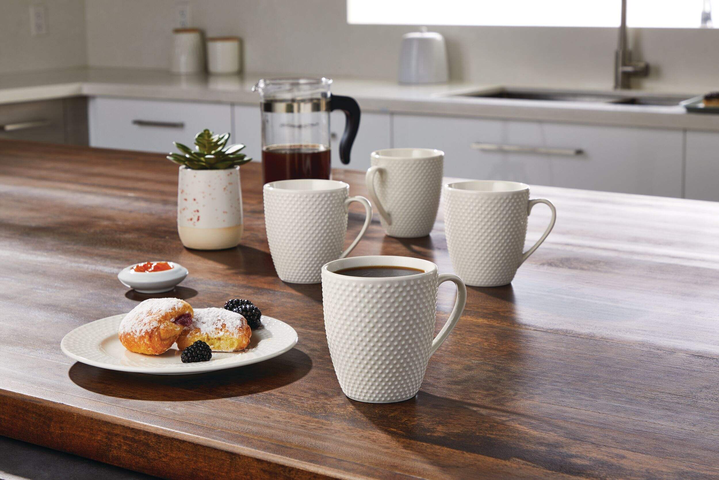 The CANVAS Westbrooke Stoneware Mug Set, 12-oz, 4-pk, makes everyday drinking anything but ordinary. The embossed dot texture adds visual interest, while the stackable design means convenient storage. Plus, they're dishwasher and microwave-safe for simple cleanup. Each 12-ounce stoneware mug strikes the perfect balance of being sturdy yet lightweight, providing a comfortable, balanced feel in your hand. This mug set of 4 pieces in matching designs provides a stylish, versatile option for your coffee, tea, or hot cocoa - whether you're enjoying a cozy moment alone or sharing a warm beverage with loved ones. The neutral colour and simple shape ensure these mugs will complement any kitchen decor for years of use.
