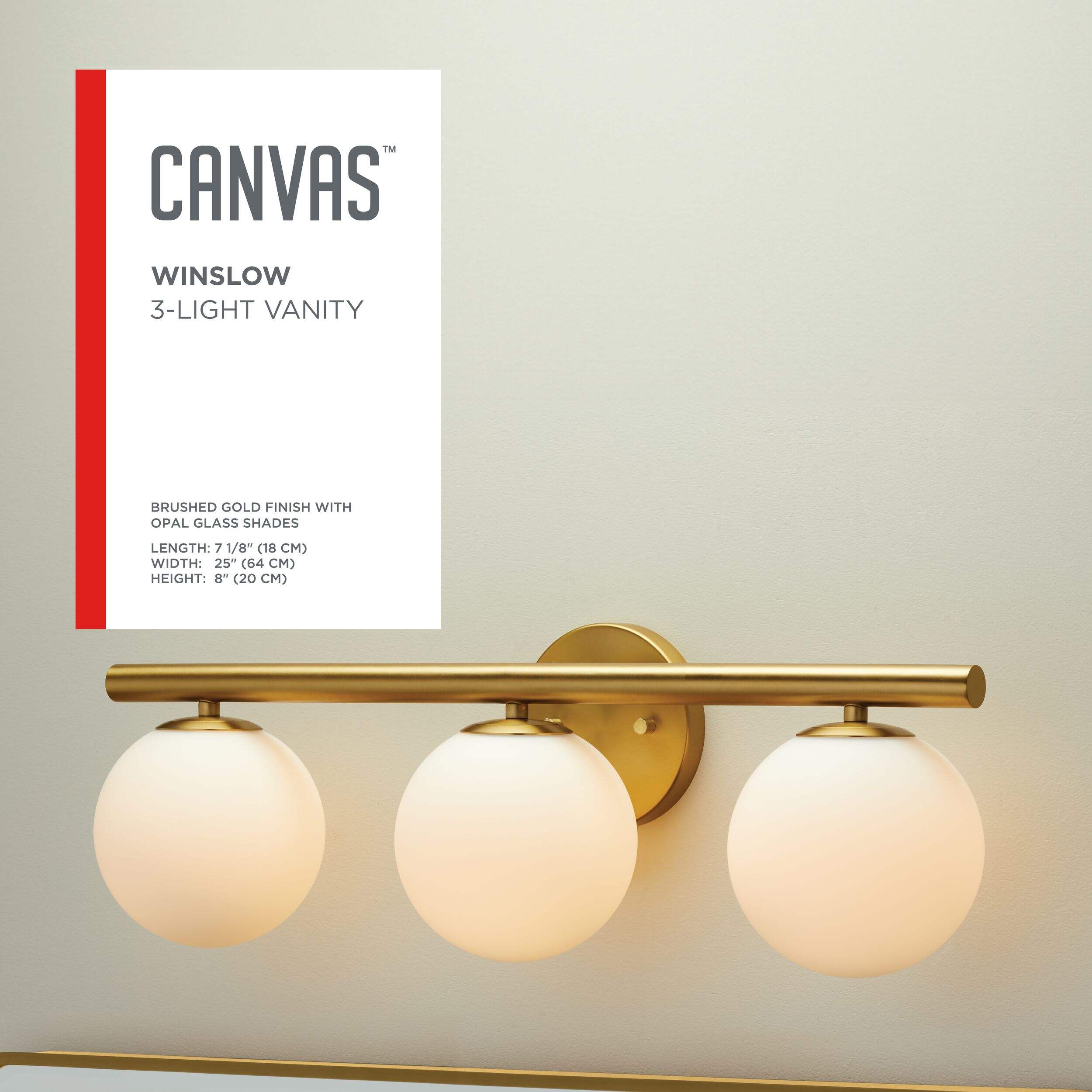 Install this dramatic CANVAS Winslow Vanity Light Fixture for an easy and elegant update to your bathroom or bedroom décor. The round, frosted opal glass shades glow like full moons over your sink countertop or dressing table, providing warm light that's bright but never harsh. Informed by mid-century modern design, this 3-light bathroom fixture features a brushed gold finish for a touch of opulence.