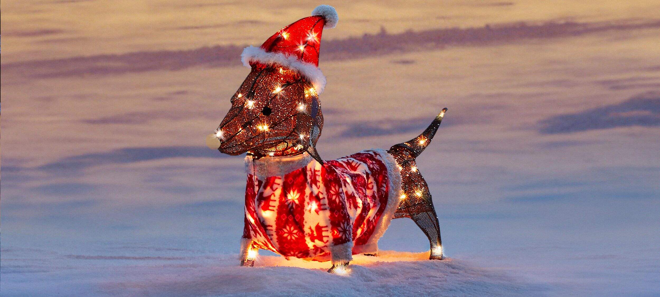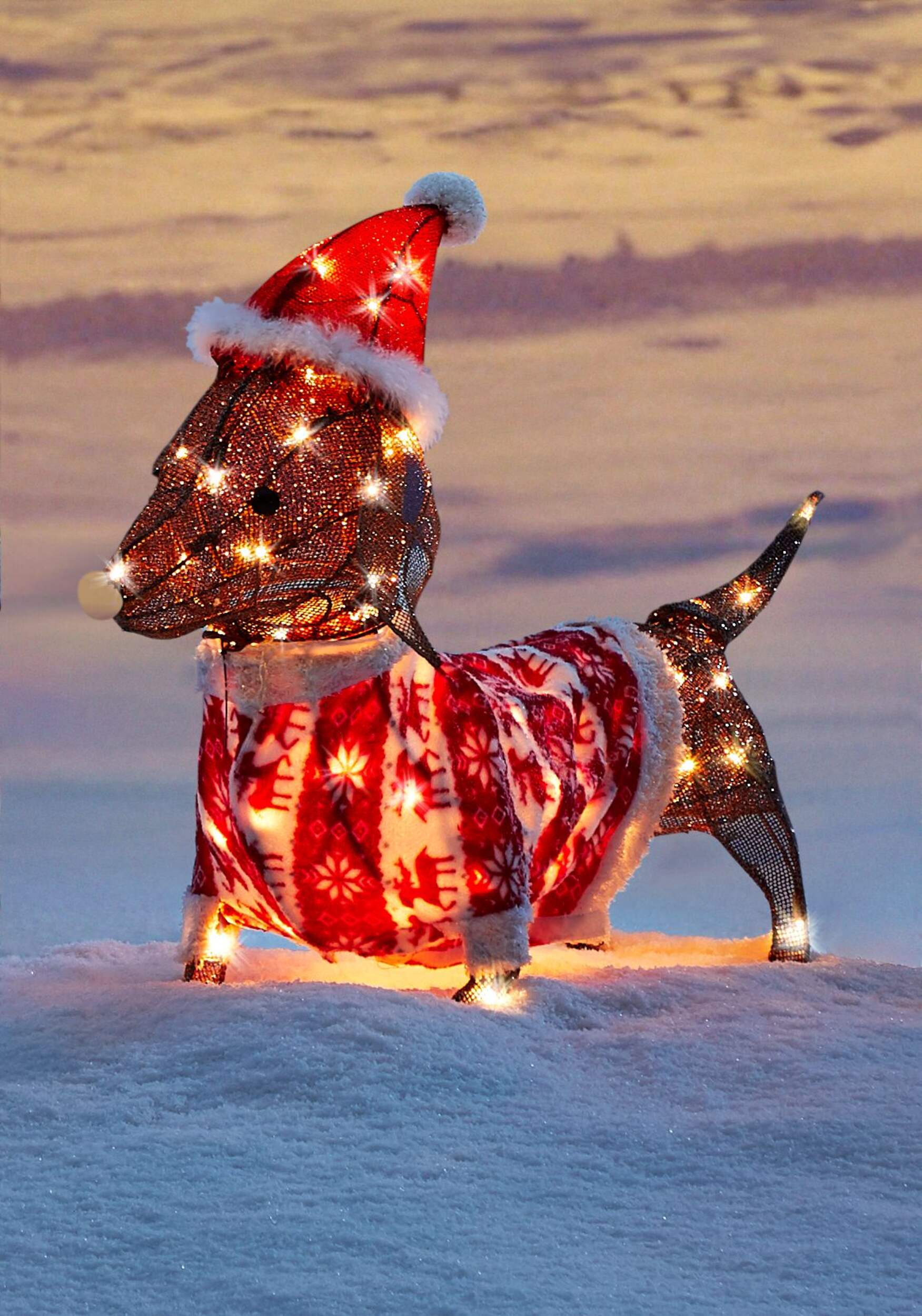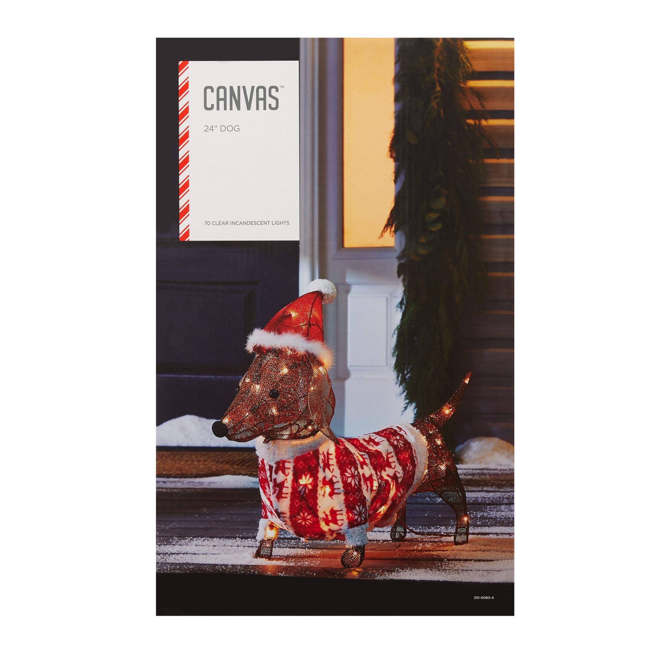 Light up your home or yard with the charming and festive CANVAS Dachshund Dog decoration. This charming light-up figure comes suited in a Santa hat and fabric Christmas sweater, ready to cast warm, glowing light over your garden landscape or family room. The perfect no-maintenance pet, it features 70 incandescent lights to create a dazzling display that friends and neighbours will love. This fully assembled Christmas décor sets up quickly with the included hardware.