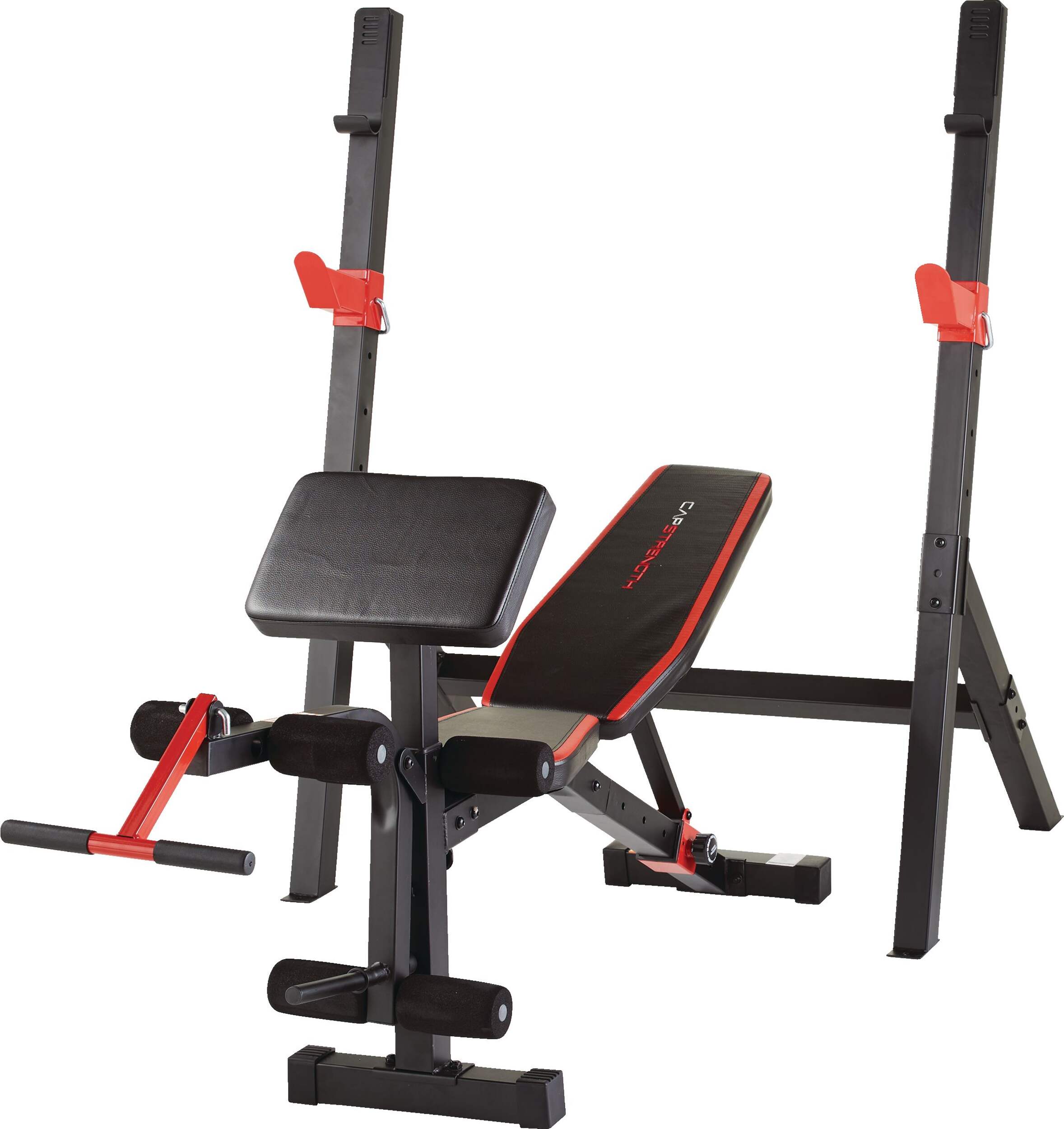Cap Barbell 2-Piece Olympic Bench is built with a dual-function 6 roll leg developer, detachable squat station, multi-position adjustable uprights, safety spotters and a flat/incline/decline position bench
