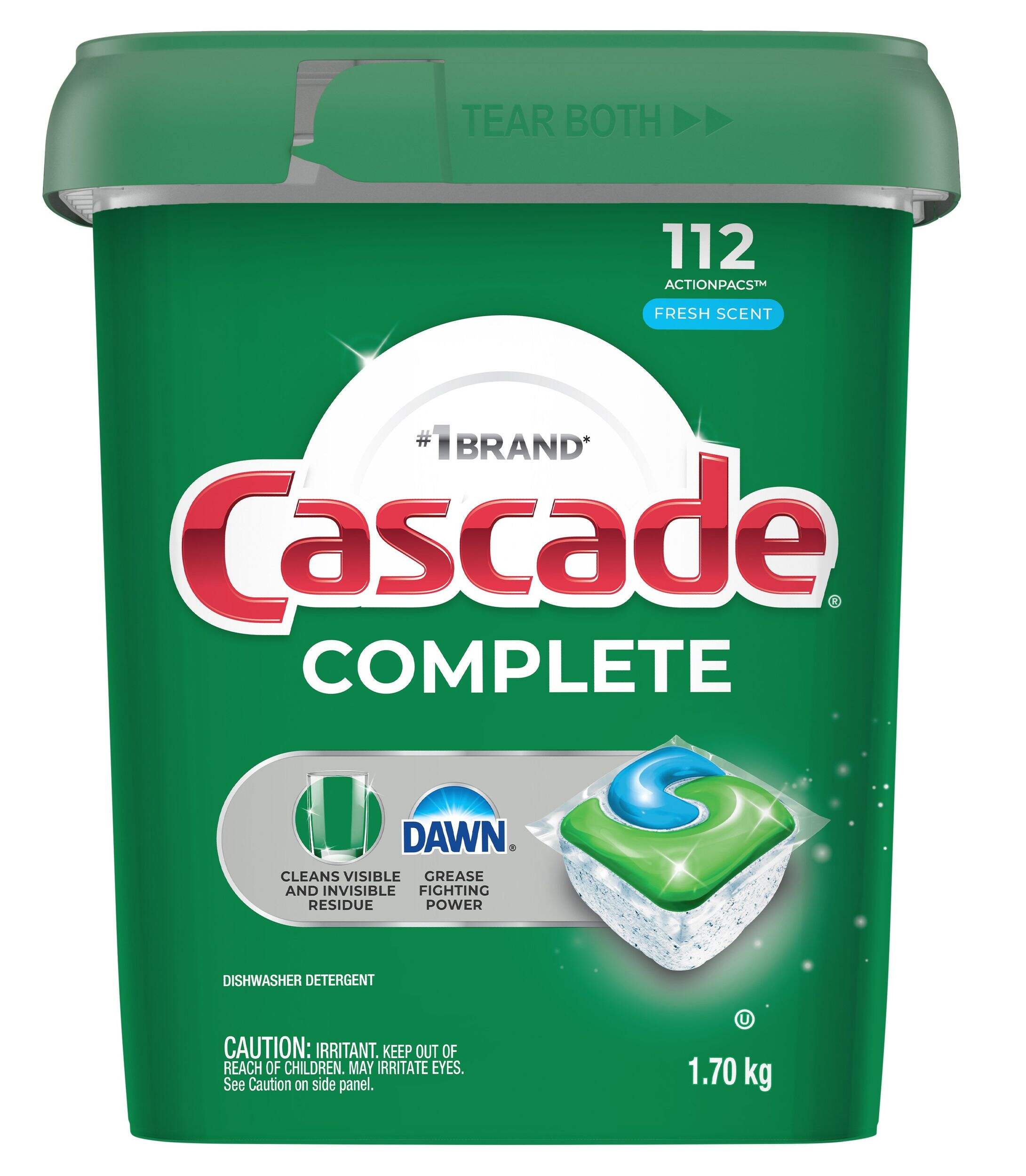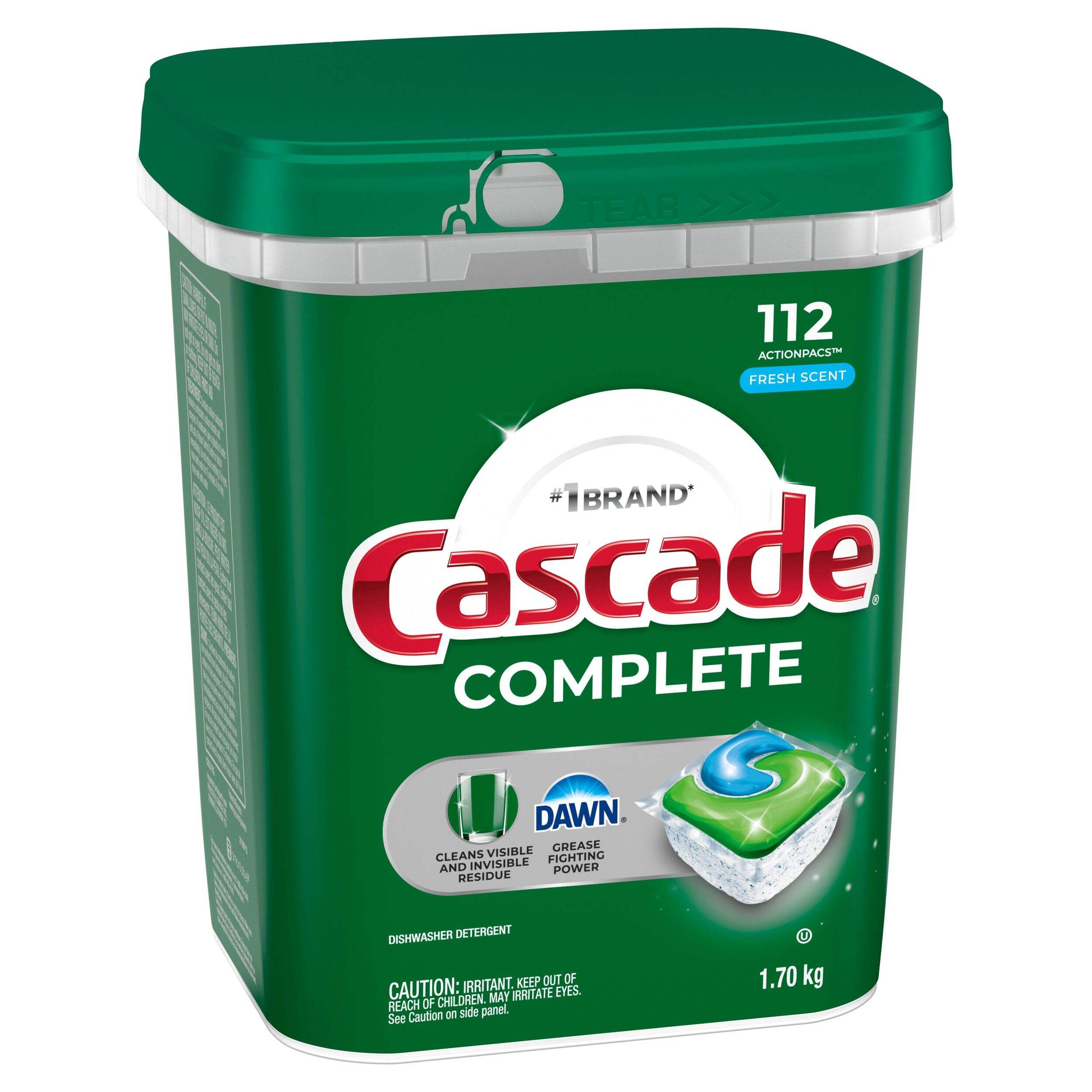 Keep your dishes sparkling clean with Cascade ActionPacs Complete Fresh Dishwasher Pods! This 112-count pack is a must-have for your cleaning supplies. These pods dissolve quickly to unleash the grease-fighting power of Dawn, tackling even the toughest messes. You'll love how they leave your dishes virtually spot-free and sparkling clean every time.