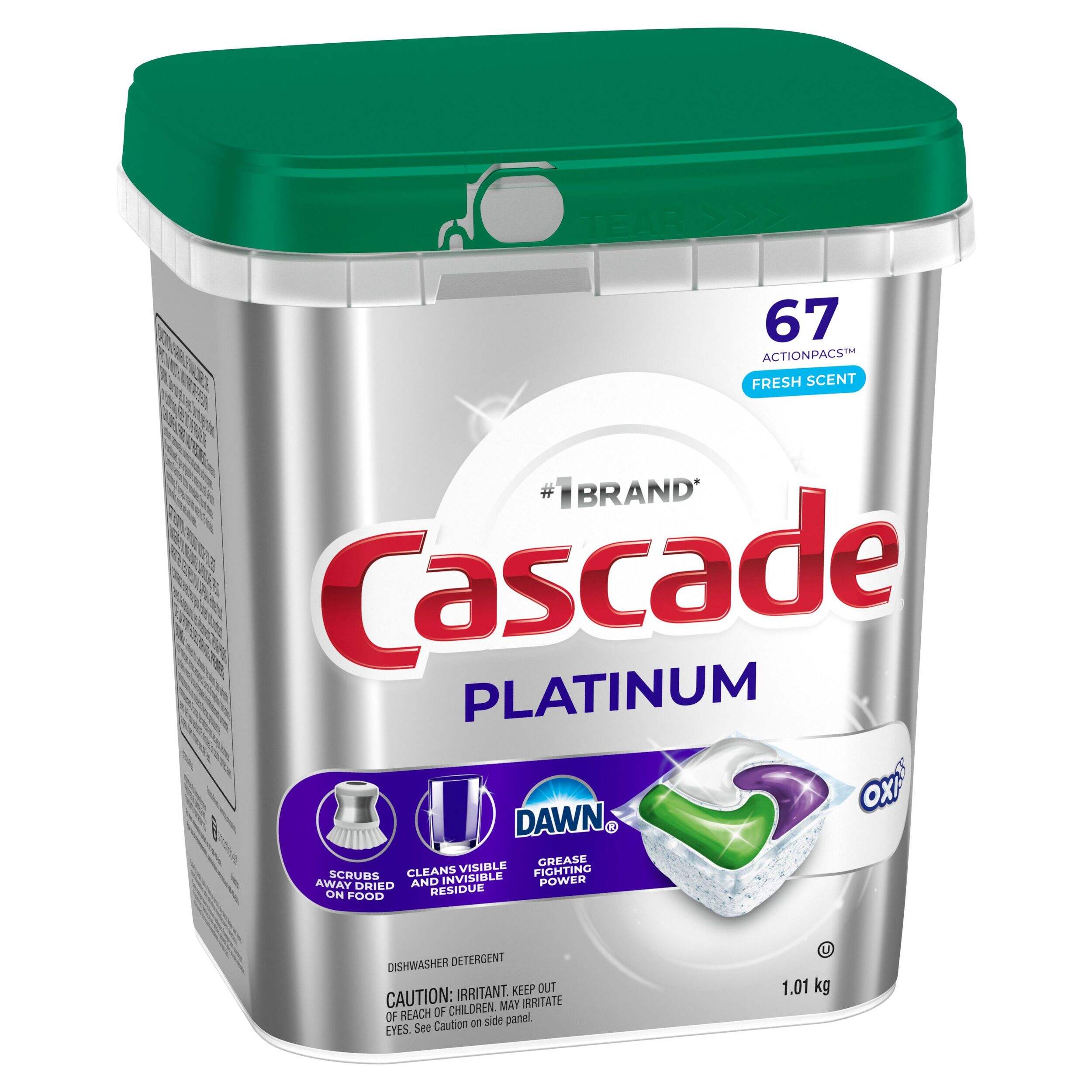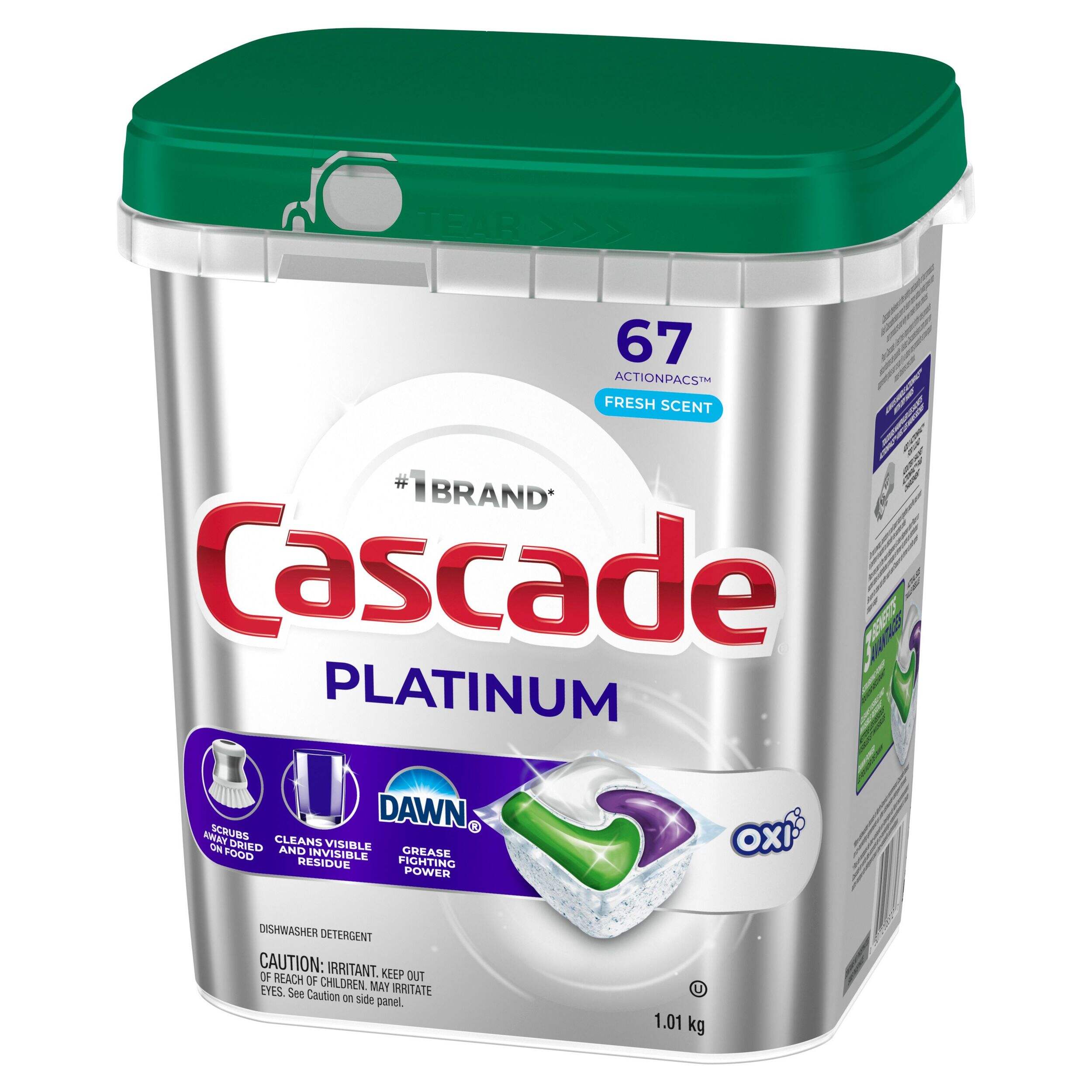 Cascade Platinum + Oxi Dishwasher Detergent Pods clean burnt-on messes in a single wash. Formulated with the superior stain fighting power of Oxi to remove tough food and beverage stains, the pods dissolve fast to start cleaning right away. The pods are so powerful that they even work in the Quick Wash cycle. Plus, Cascade Platinum dishwashing detergent is formulated to help prevent hard water filming, keeping your machine looking fresh and clean. Simply pop in an ActionPac and reveal a Platinum sparkle.