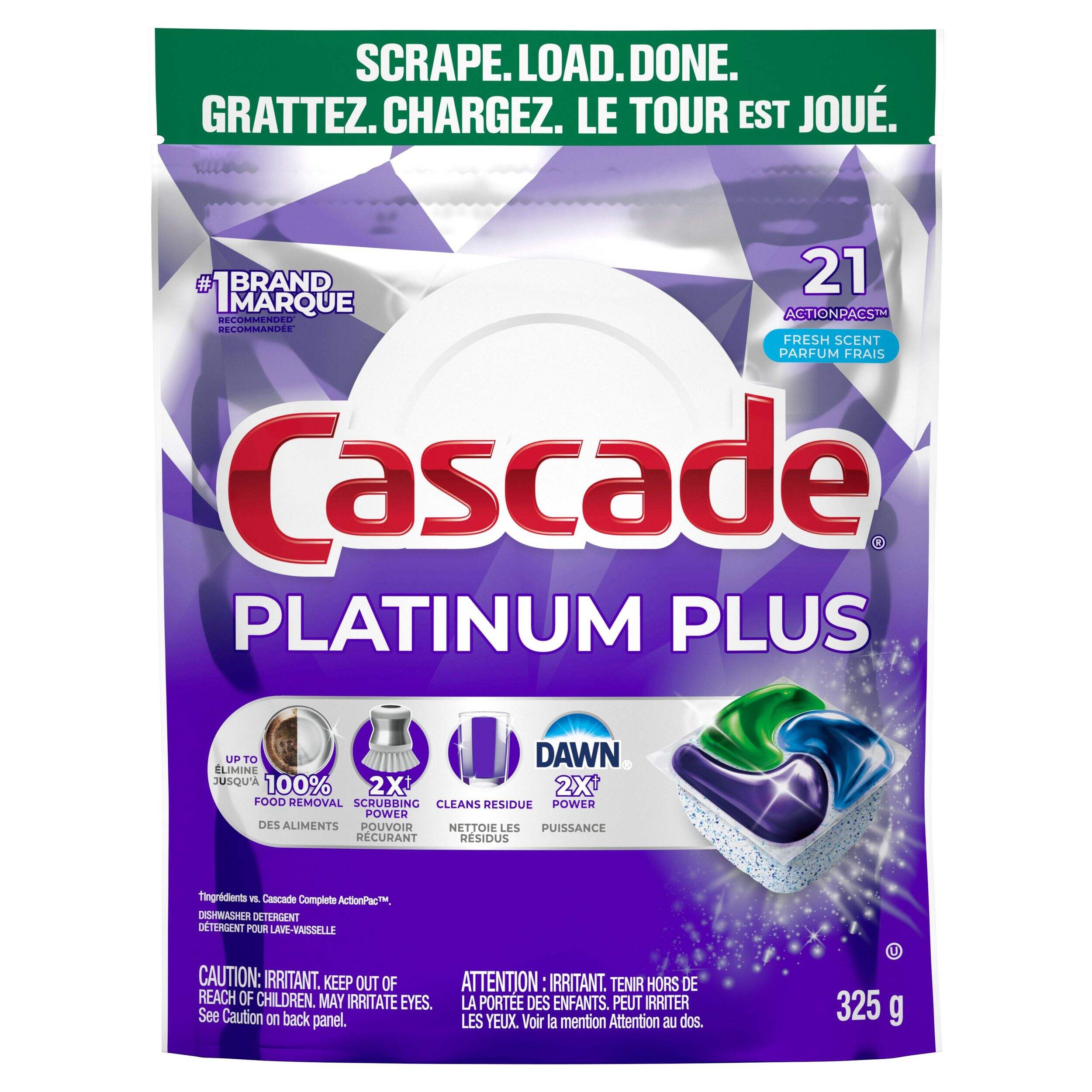 Cascade Platinum Plus ActionPacs give your dishes a cabinet-ready clean. With this much cleaning power, you can skip the pre-rinse, skip the soak, skip the scrub, and dare to dish differently. Simply scrape your dishes and load them into your washer with Platinum Plus to get a superior, sparkling clean that saves you time, effort, and energy. Gleaming glassware, dazzling dishes, and pristine pots and pans are mere moments away with Cascade Platinum Plus.