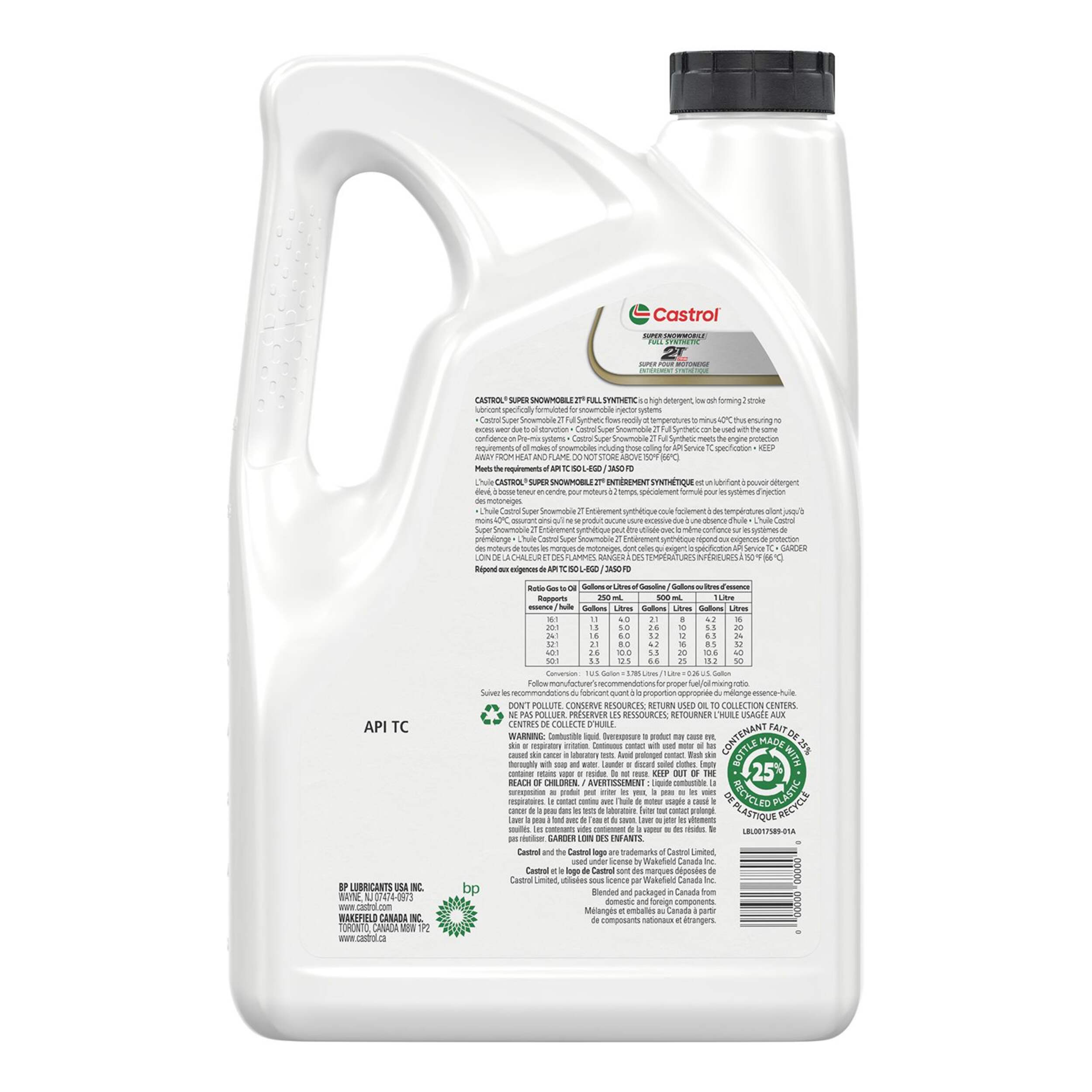 Castrol 2-Stroke Super Snowmobile Oil delivers superior protection for your snowmobile's engine, ensuring peak performance in the harshest conditions. Formulated to prevent combustion chamber deposits, ring sticking, exhaust port blockage, and spark plug fouling, this oil keeps your engine running smoothly for longer. With Castrol's advanced synthetic formula, you can hit the trails with confidence, knowing your engine is fully protected.