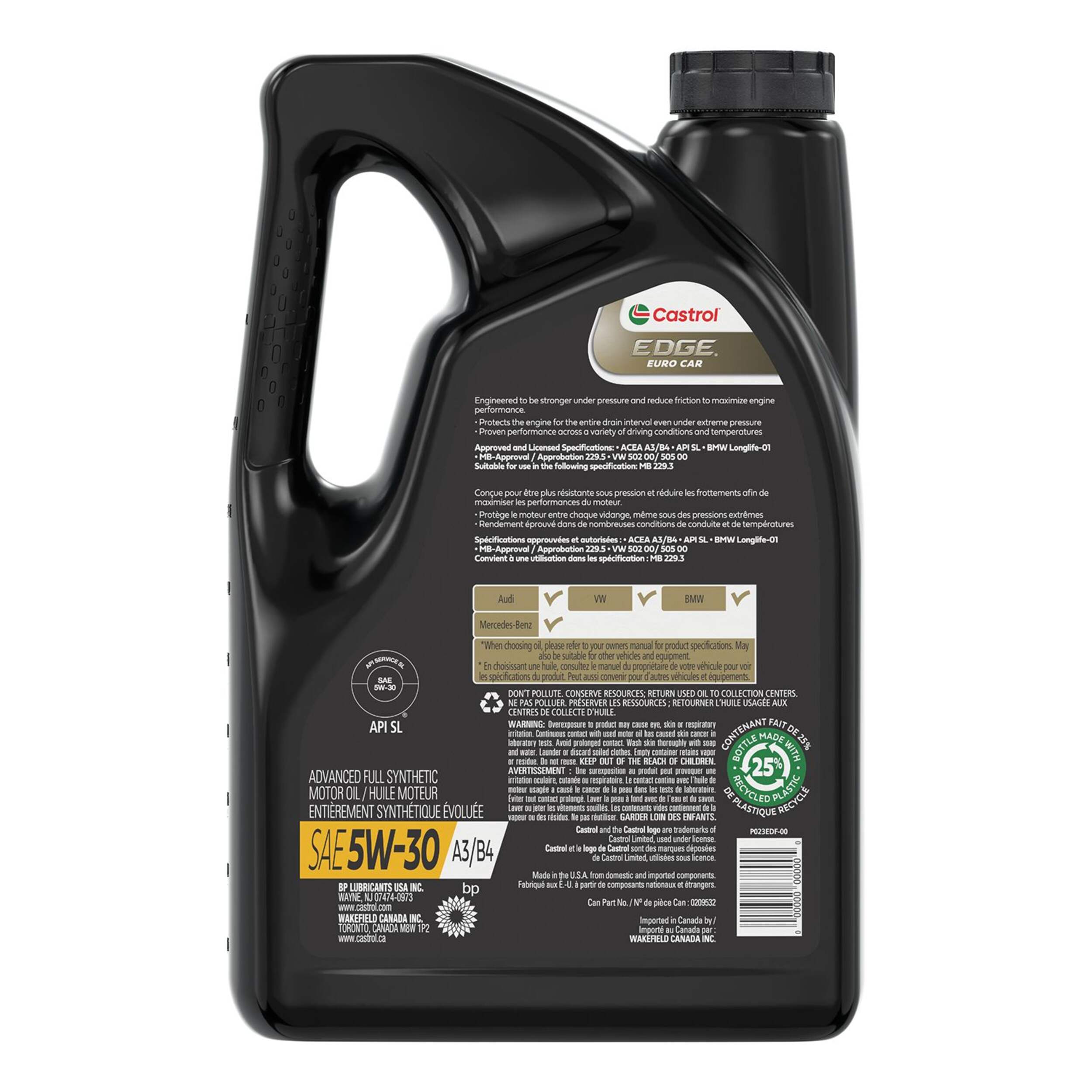 Castrol EDGE Euro A3/B4 Advanced 5W30 Full Synthetic Engine Motor Oil is engineered to deliver superior performance and protection in European vehicles. Formulated with Castrol’s advanced full synthetic technology, it helps reduce metal-to-metal contact, even under extreme pressures. This oil is designed to meet stringent European car manufacturer specifications, providing maximum performance in high-performance engines. Castrol EDGE Euro is perfect for drivers who demand the best for their vehicles, offering excellent wear protection, optimal engine cleanliness, and enhanced fuel economy.