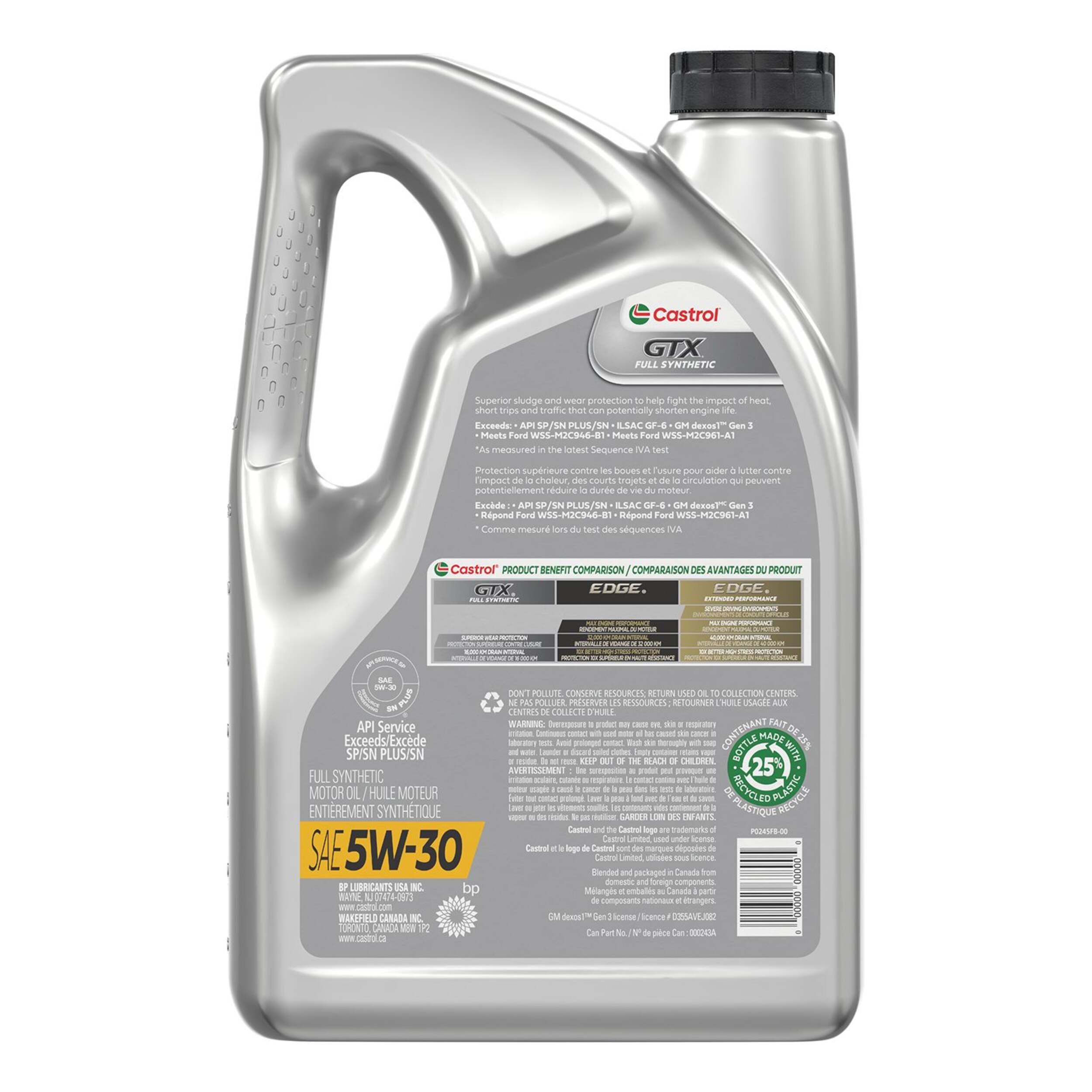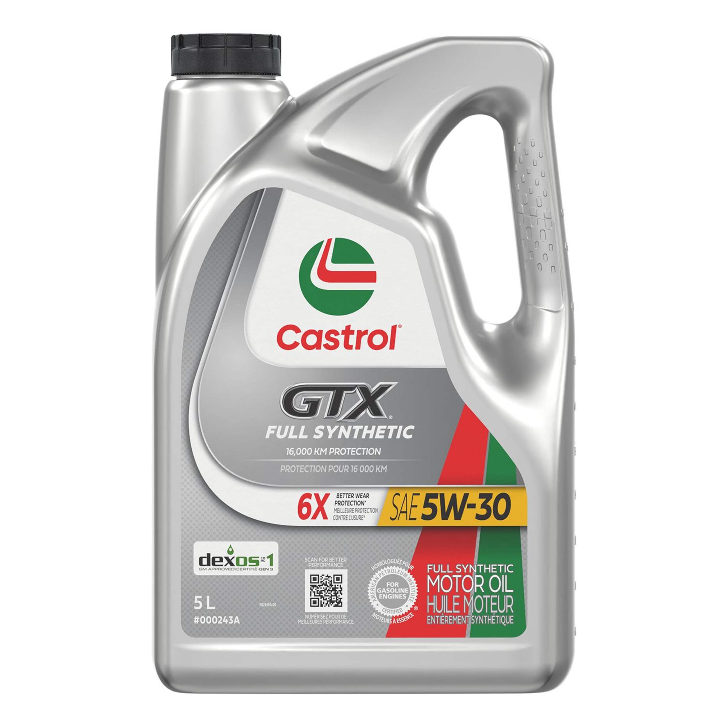 The Castrol GTX Full Synthetic 5W-30 Motor Oil is an advanced full synthetic formulation designed to provide maximum engine protection. This 5W-30 viscosity grade motor oil promotes improved fuel economy and optimum engine performance across a wide range of driving conditions. Suitable for various vehicle makes and models, the motor oil meets industry specifications to ensure reliable lubrication and long engine life.
