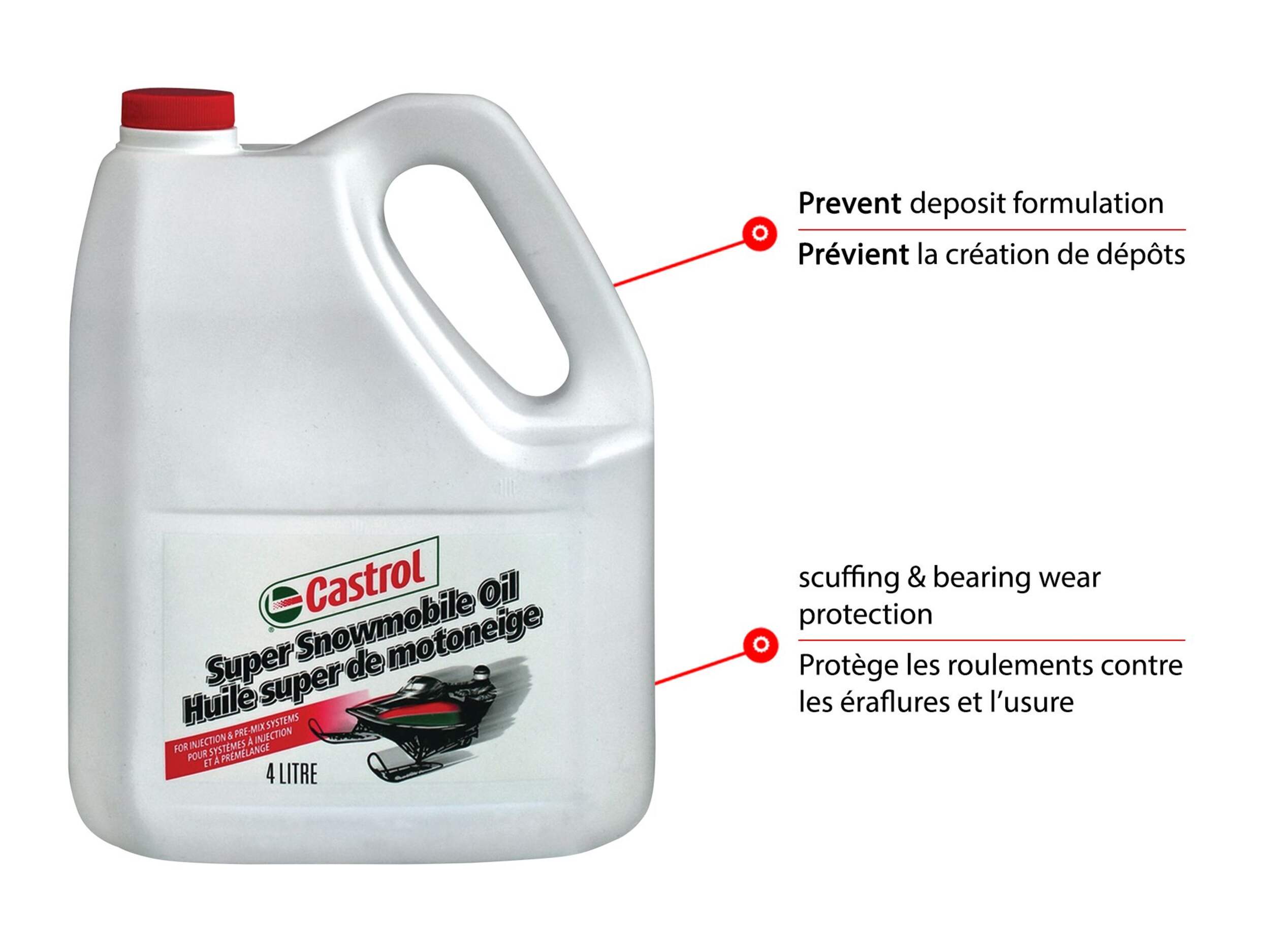 Castrol Super Snowmobile Oil meets the recommended engine protection requirements of all snowmobile makes, including many that require additional service specifications. This 2-stroke oil is recommended for use in any compatible snowmobile engine, where it can get to work right away by preventing deposits, fouling, scuffing, and wear.