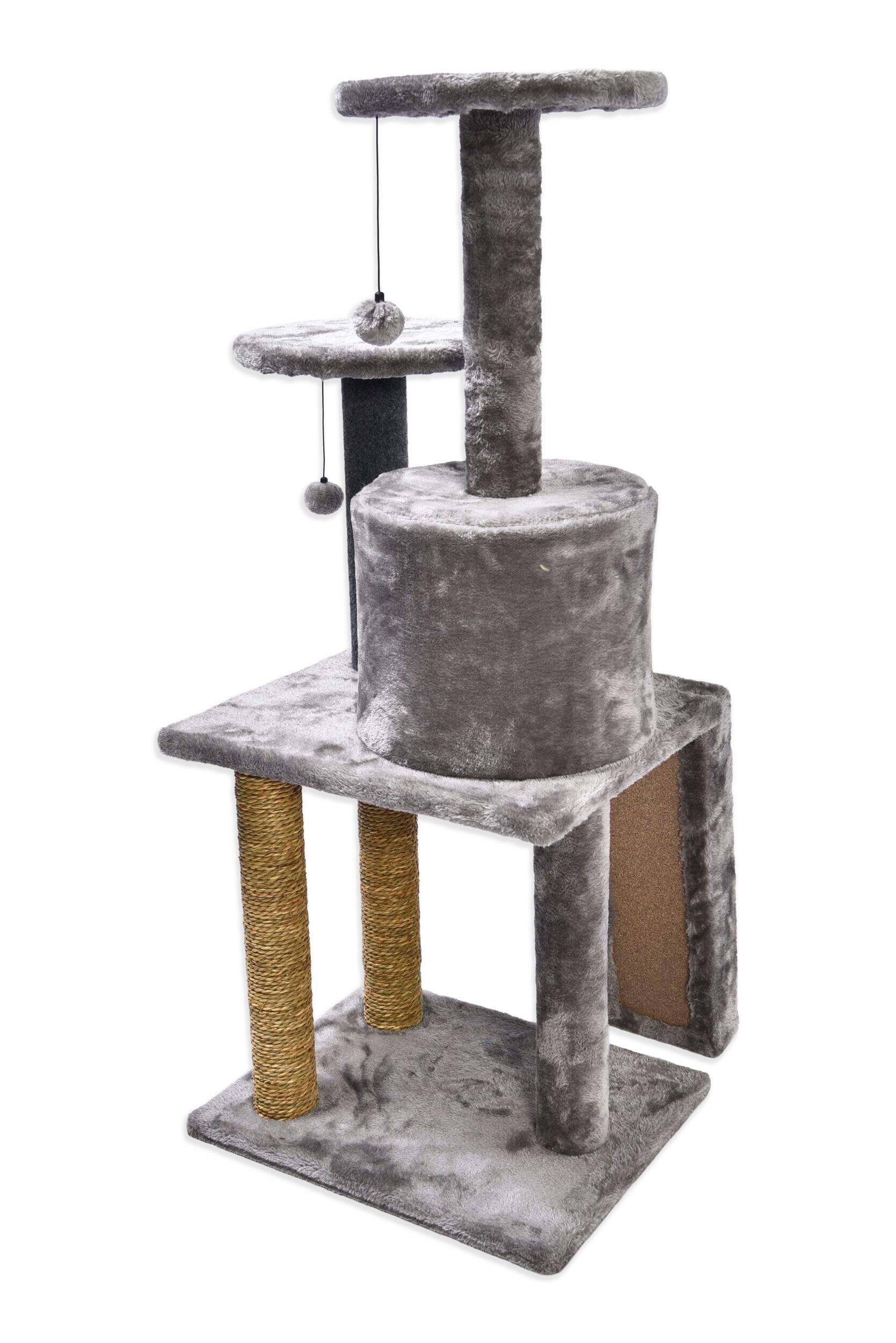 Designed to encourage cats to come play with its perches, hanging toys and good scratching posts