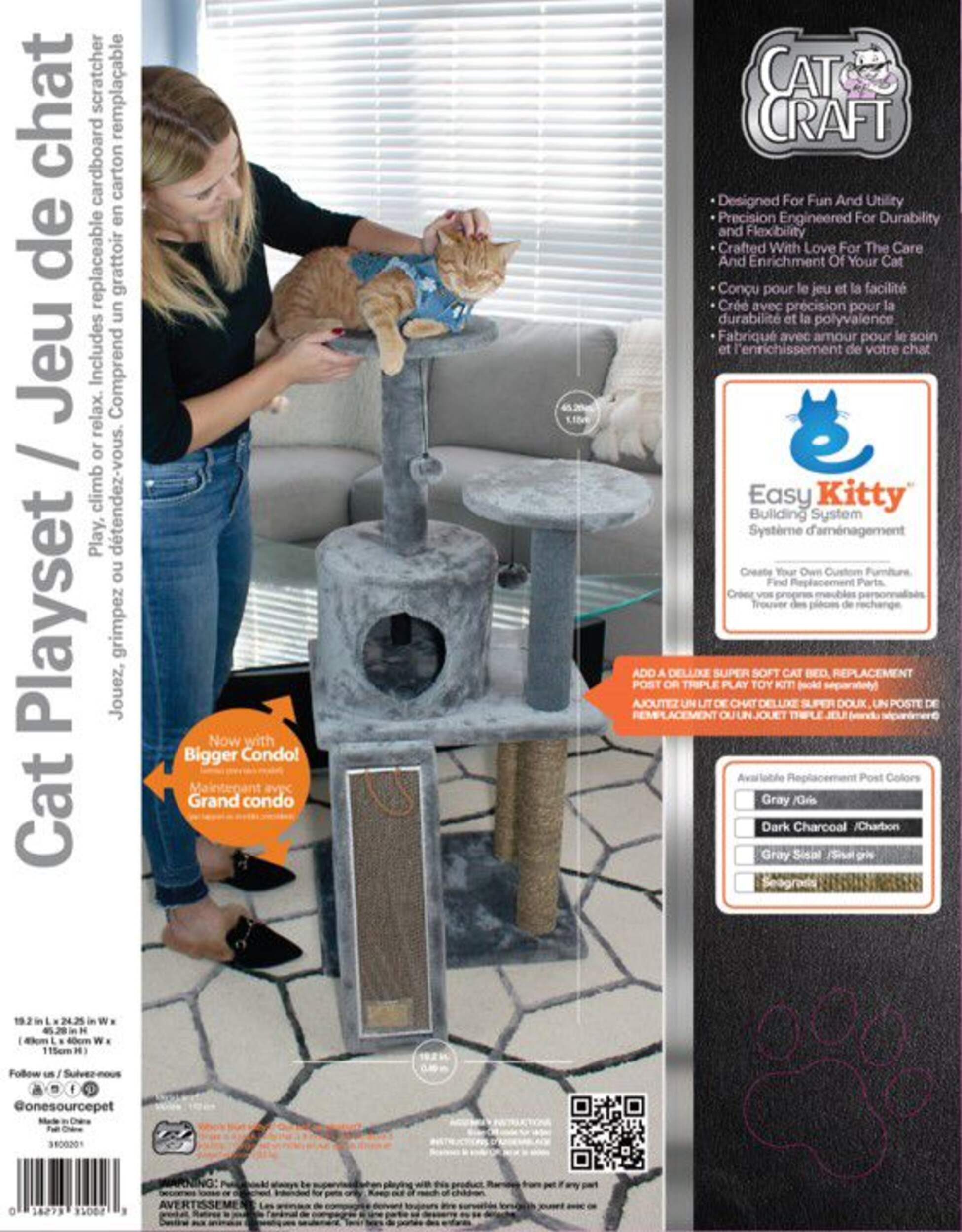 The Cat Craft Cat Tree Playset is designed to keep cats engaged with multiple play areas. This 45-inch tall cat tree features sisal-wrapped posts and an angled cardboard scratcher to satisfy cats' scratching instincts. Perches at varying heights allow cats to survey their domain or take a catnap. With easy assembly, this multi-level cat tree provides cats with opportunities to play, scratch, climb, and rest.