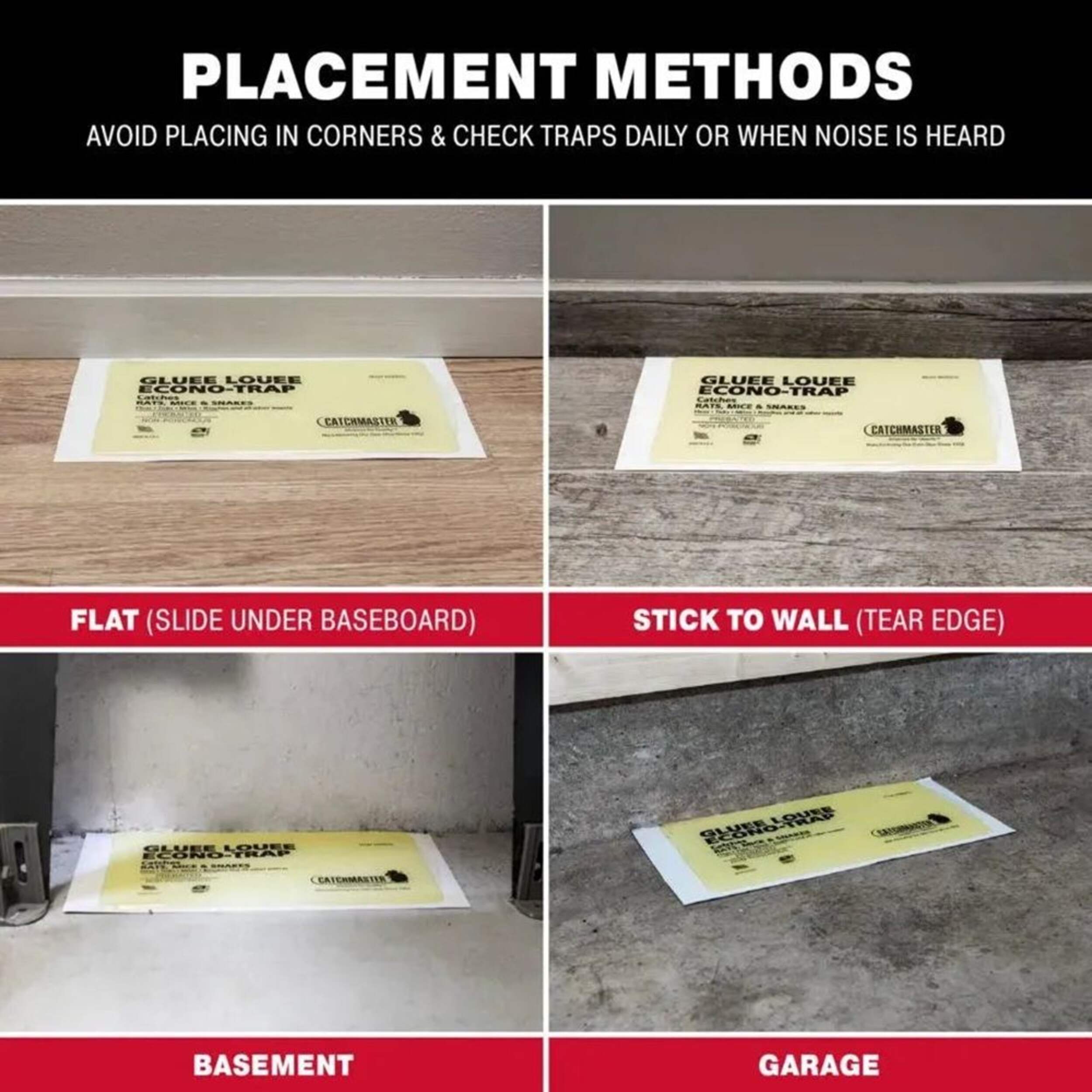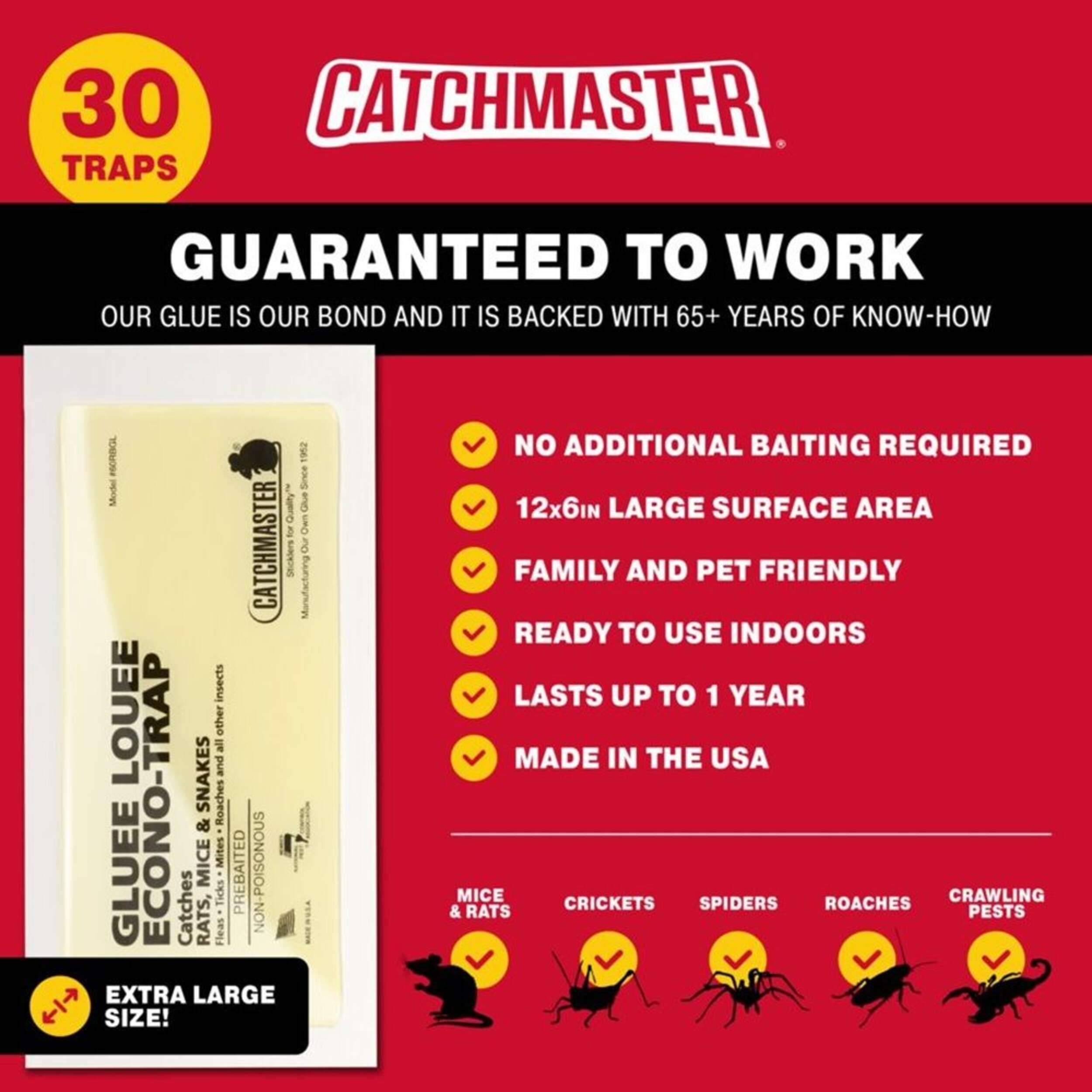 Catchmaster Pro-Strength glue boards feature heavy adhesive coverage and a huge catching surface on these disposable traps. Perfect for capturing rats and mice around the home without the use of toxic chemicals. The perforated design allows you to tear off sections and place the glue directly against baseboards to better secure the traps and prevent critters from dragging them off. Simply place where needed, and the extra large 12 by 6 inch size helps ensure a catch.