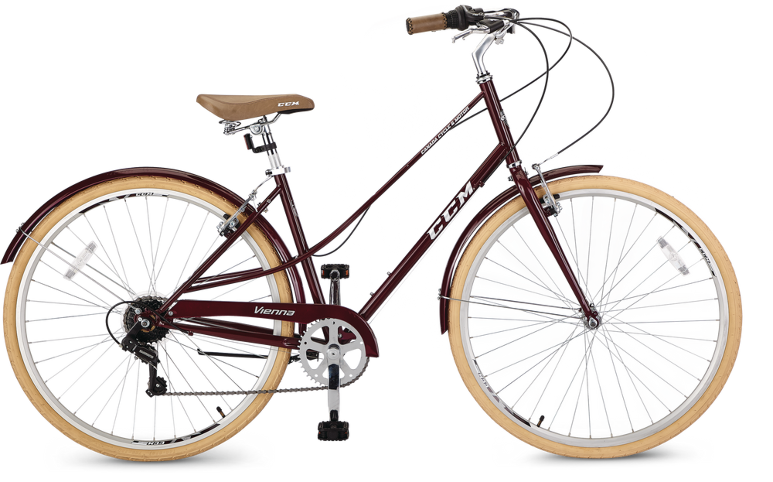 The CCM Vienna hybrid bike is a modern take on a classic double top-tube design, at a value price point. Modern features include alloy ‘V’ brakes and Shimano Revo shifter with Shimano derailleur. Combined with a matching saddle with soft touch grips, alloy double-wall rims, alloy stem and swept back handlebars that provide a comfortable, upright position for a nice wide view of the path or road. The safety chainguard and fenders keeps you clean and dry.