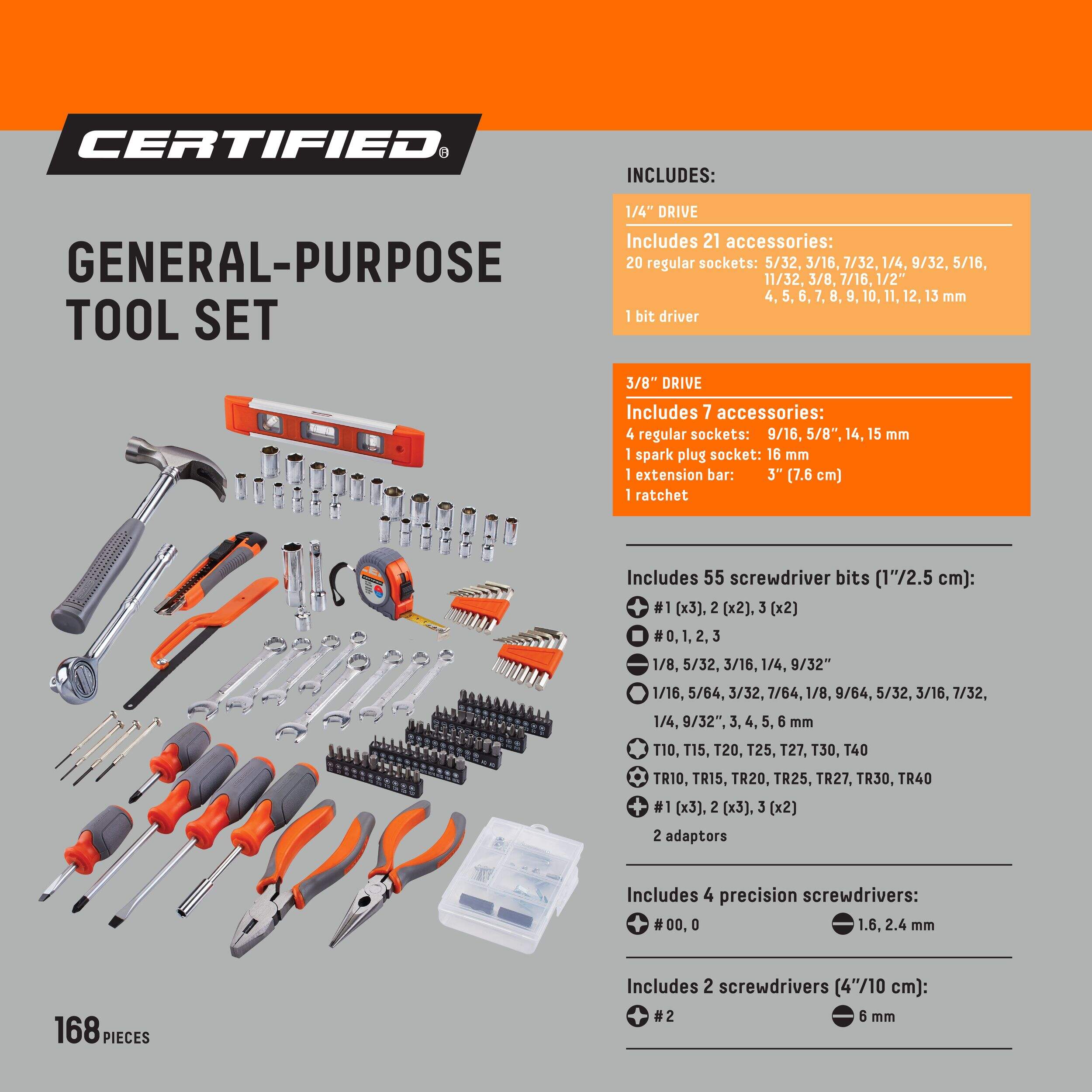 The Certified General Tool Set provides a complete array of tools and accessories to handle a wide range of tasks with confidence. Its 168 pieces are meticulously organized in a durable blow-moulded case, ensuring easy access and secure storage. Designed for convenience, this kit equips you with essential tools for home repairs, DIY projects, or on-the-go fixes, making it an indispensable addition to your toolkit.