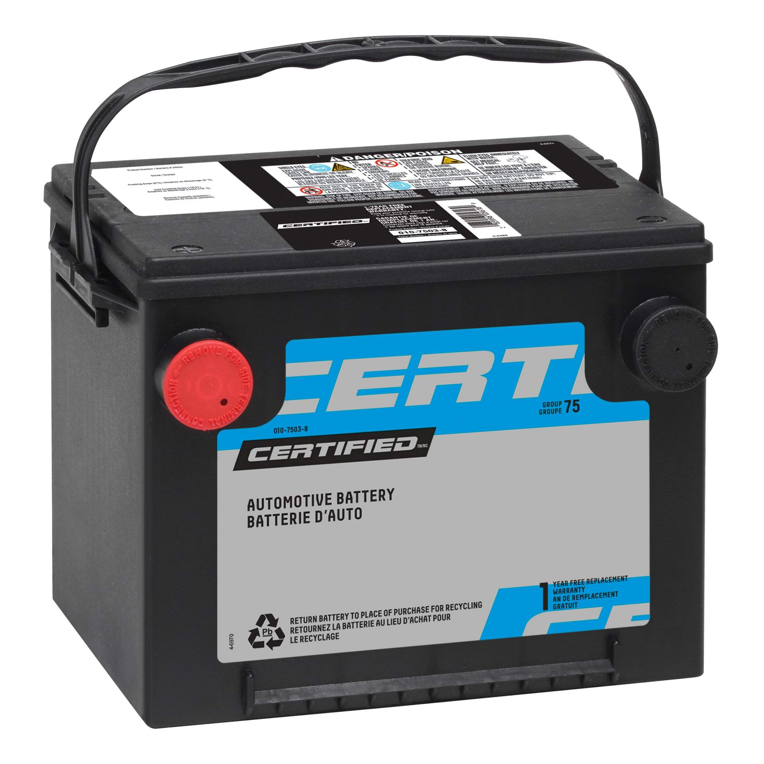 The Certified Group Size 75 Battery, with 575 CCA, stands as a dependable choice for your automotive requirements. This maintenance-free battery ensures reliable all-weather starting power, delivering 575 Cold Cranking Amps at -18°C and 710 Cranking Amps at 0°C. It boasts an 85-minute reserve capacity at 25A and operates at a nominal voltage of 12. With a left-hand positive polarity and dimensions measuring 9-3/4" x 7" x 7-1/4", it's designed for convenience. When it's time for replacement, please return your old lead-acid battery to Canadian Tire for recycling, as most of its content can be repurposed in new batteries.