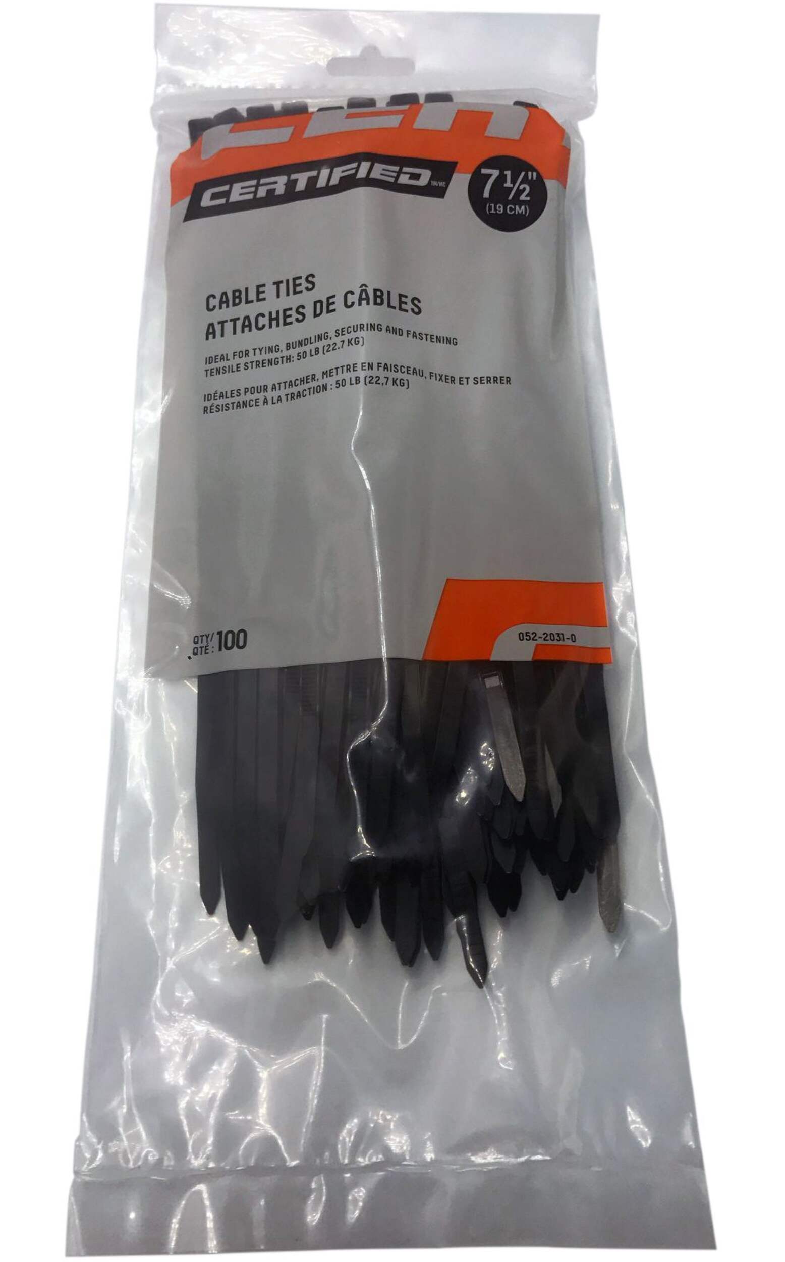These 7.5 inch cable ties help keep any group of cables or wires neatly organized. Perfect for simplifying the back of your computer or modem, the black ties allow you to securely bundle your network configuration. The 100 pack of medium duty ties, each with 50 pound tensile strength, is ideal for most home or office wiring projects. Simply loop the tie around your cables, twist the latch and the tie locks for a durable yet adjustable hold.