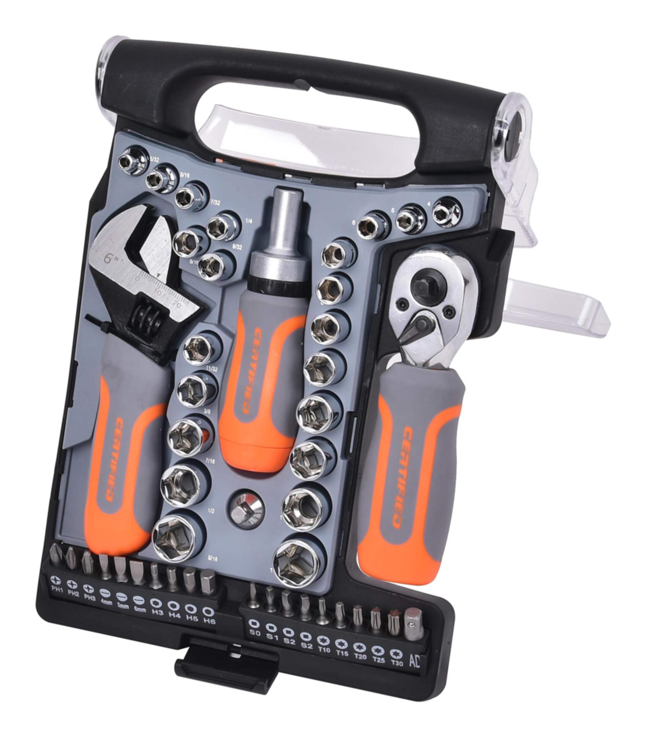Includes stubby adjustable wrench, stubby ratcheting screwdriver, stubby ratchet handle, 3/8" to 1/4"-drive adapter, bit adapter, 1/4" and 3/8"-drive sockets, and assorted screwdriver bits