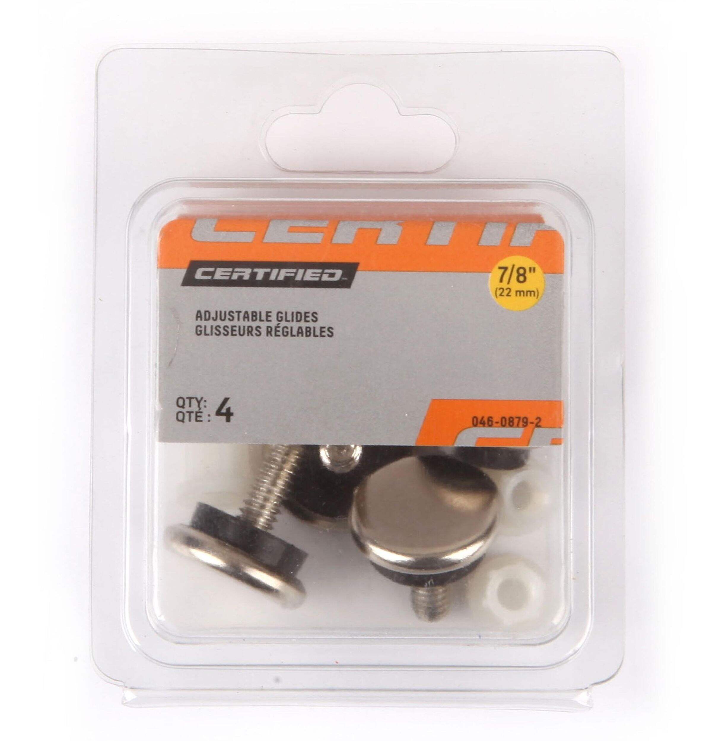 The Adjustable Furniture Glides, 7/8-in are designed from a nickel base for durability. These furniture glides are ideal to level office or household furniture. This pack of 4 glides includes threaded sockets.