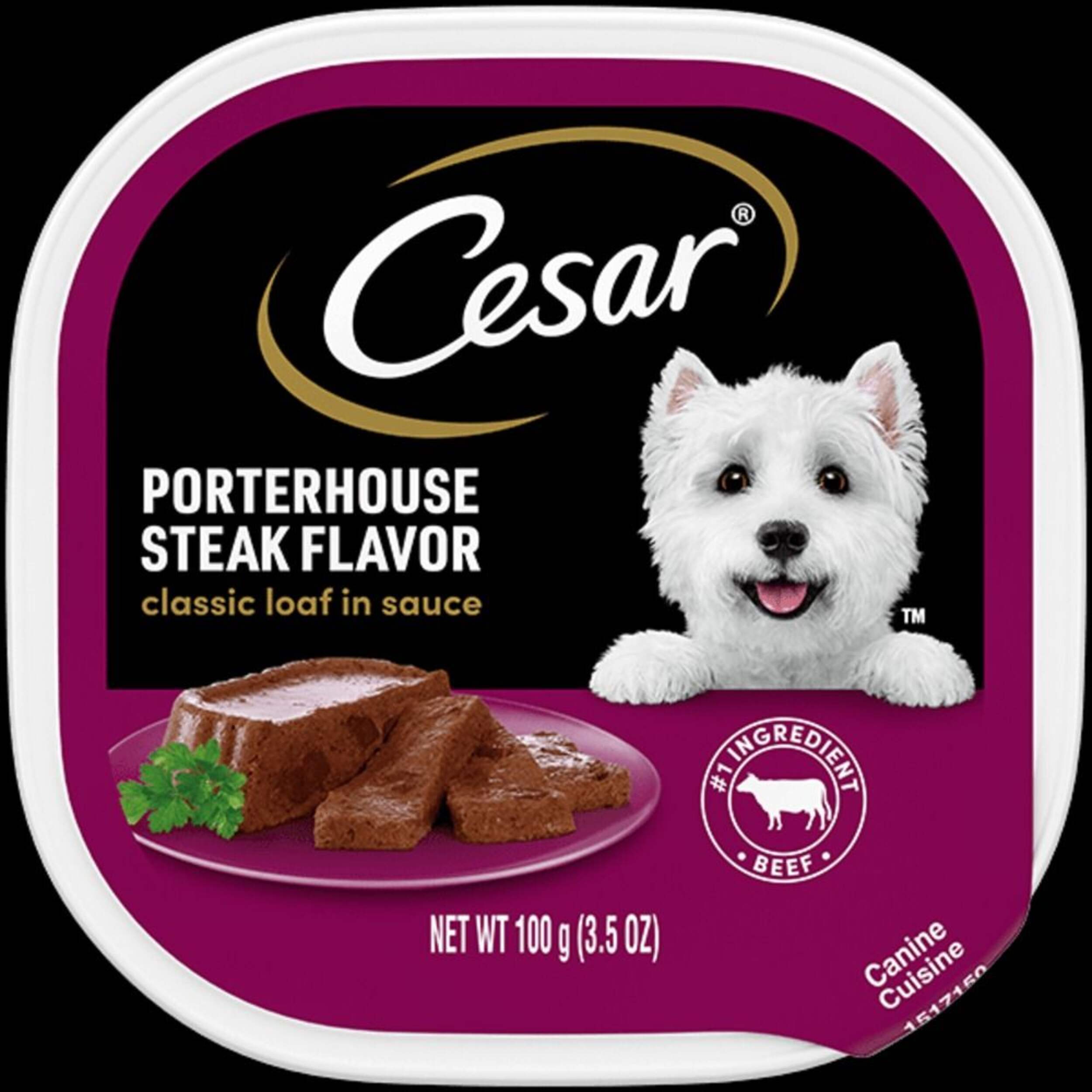 Cesar Entrées Porterhouse Steak Flavour Adult Wet Dog Food is a succulent, meaty delight designed specifically for small dogs. Each 100-g serving is brimming with the irresistible taste of porterhouse steak, drenched in a savoury meaty juice flavour. This rich, tantalizing meal offers your pet a satisfying dining experience, with a recipe tailored to meet the nutritional needs of small breed adult dogs. Enjoy the convenience of single-serve trays with Cesar Entrées.
